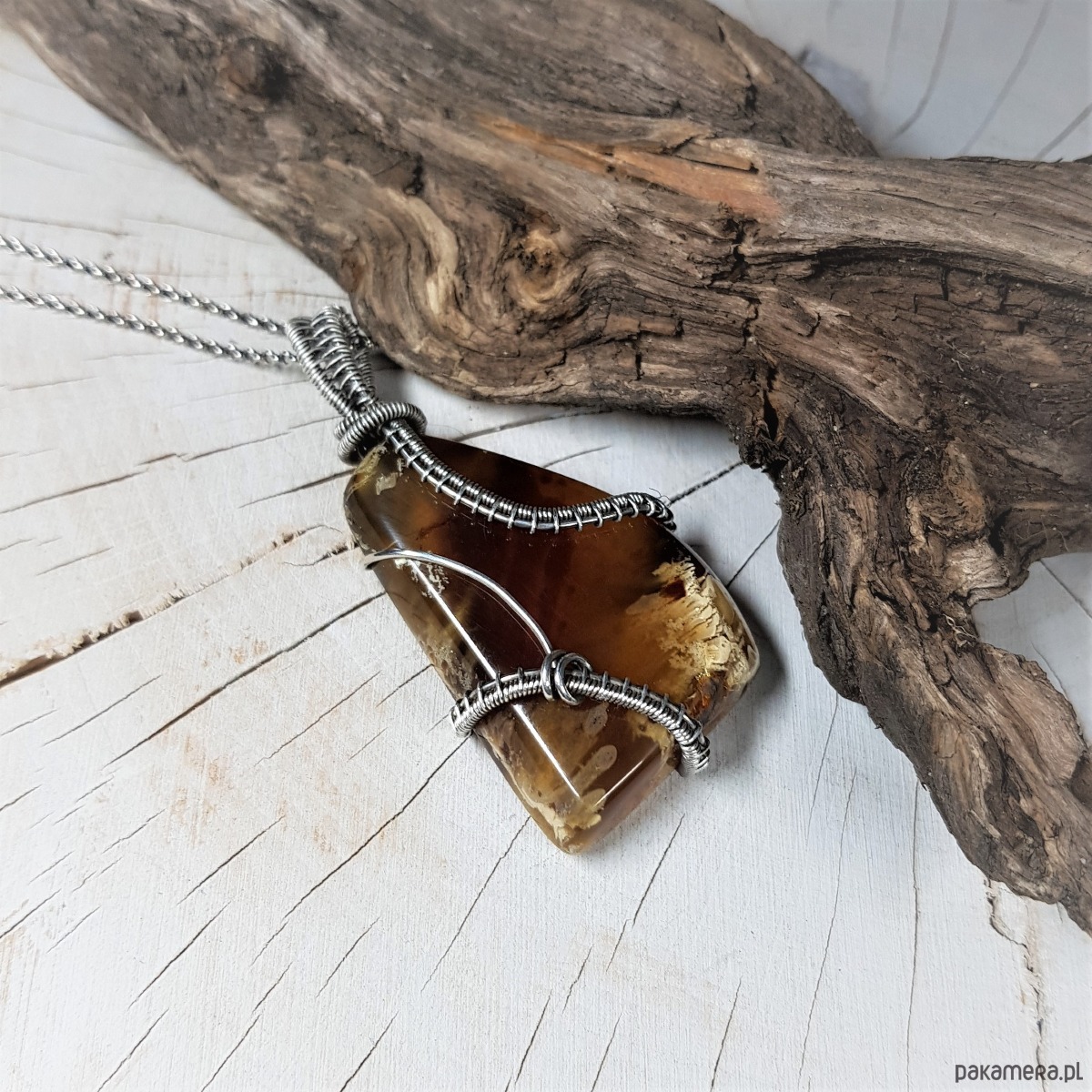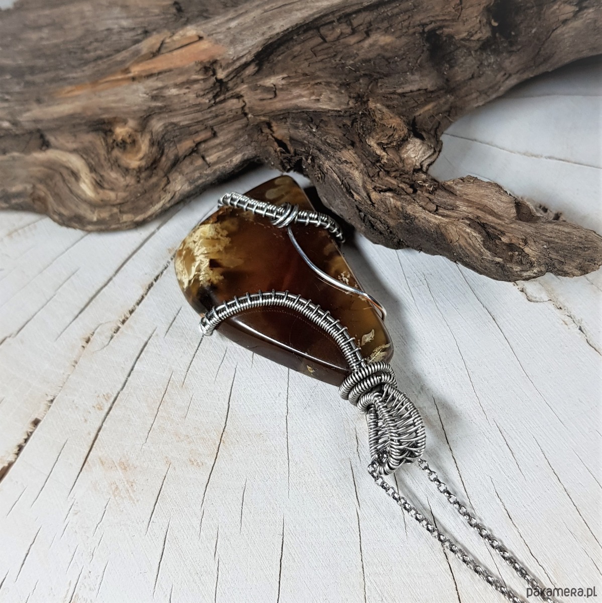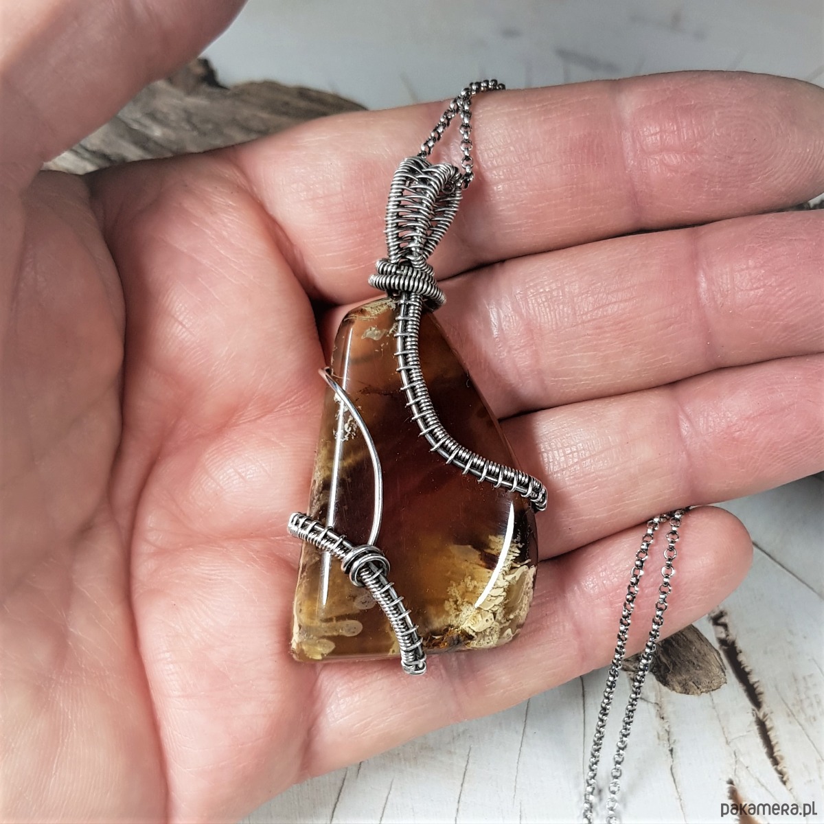 Zawieszka wykonana ręcznie metodą wire-wrappingu której głównym elementem jest bryłka naturalnego bursztynu z Sumatry w pięknych koniakowych i piaskowych barwach wzajemnie się przenikających. Do wykonania wisiorka użyłam srebra najwyższej próby 999, które następnie zaoksydowałam i wypolerowałam w celu uzyskania szlachetnego efektu postarzenia. Wymiary zawieszki 57x30mm z łańcuszkiem długości około 48-50 cm.