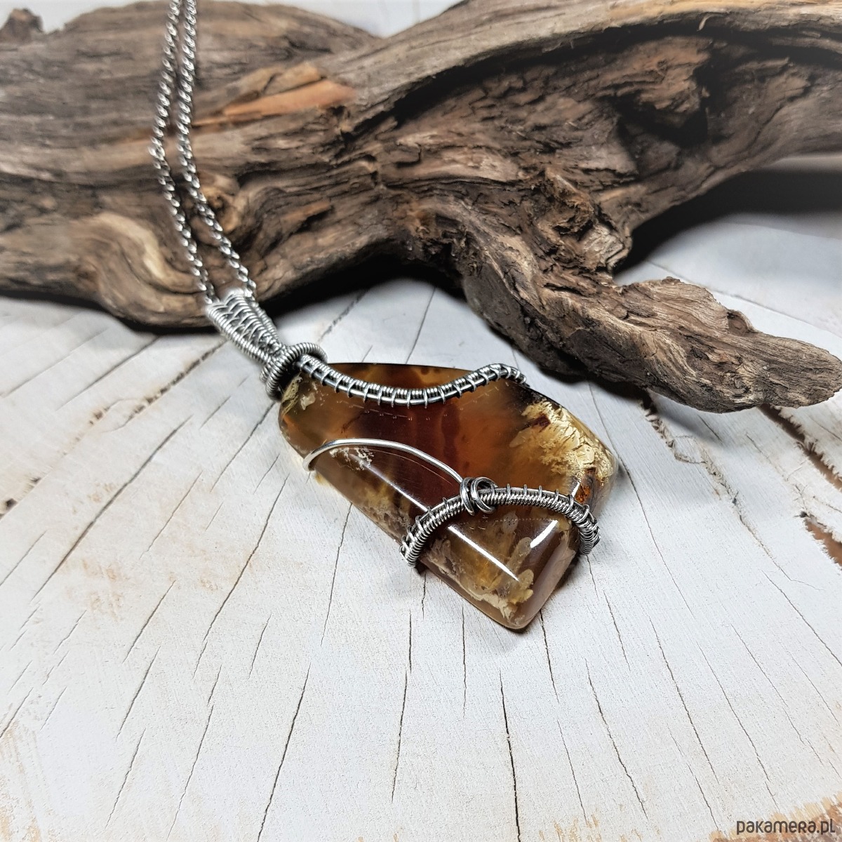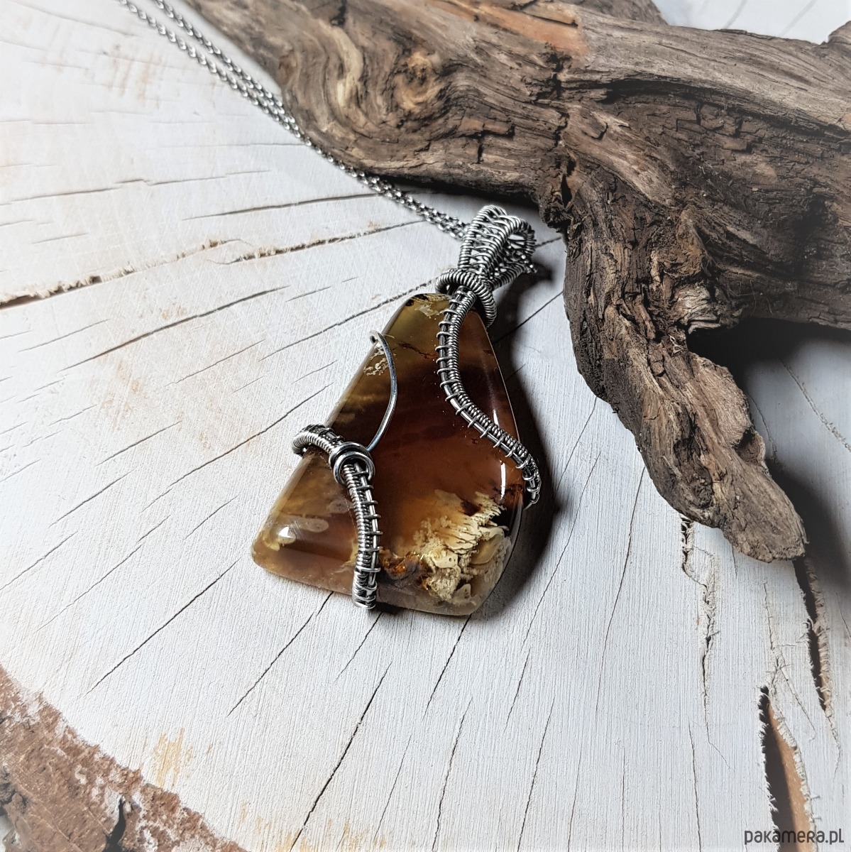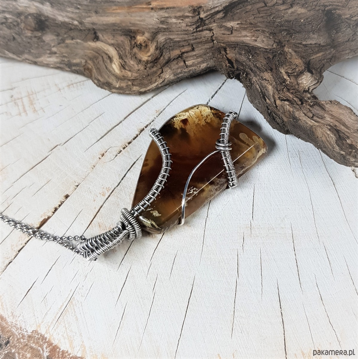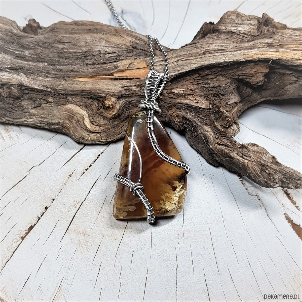 Zawieszka wykonana ręcznie metodą wire-wrappingu której głównym elementem jest bryłka naturalnego bursztynu z Sumatry w pięknych koniakowych i piaskowych barwach wzajemnie się przenikających. Do wykonania wisiorka użyłam srebra najwyższej próby 999, które następnie zaoksydowałam i wypolerowałam w celu uzyskania szlachetnego efektu postarzenia. Wymiary zawieszki 57x30mm z łańcuszkiem długości około 48-50 cm.