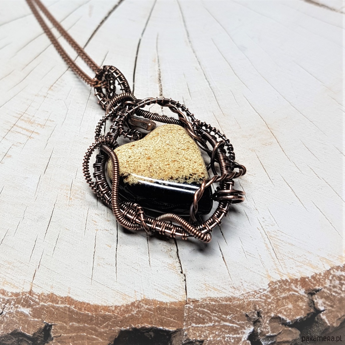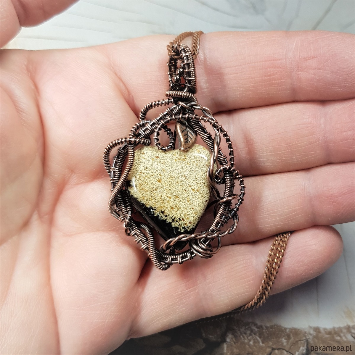 Zawieszka wykonana ręcznie metodą wire-wrappingu której głównym elementem jest bursztynowe serduszko. Do wykonania wisiorka użyłam miedzianego drutu, które następnie zaoksydowałam i wypolerowałam w celu uzyskania szlachetnego efektu postarzenia. Wymiary zawieszki 54x34mm z łańcuszkiem długości około 48-50 cm.