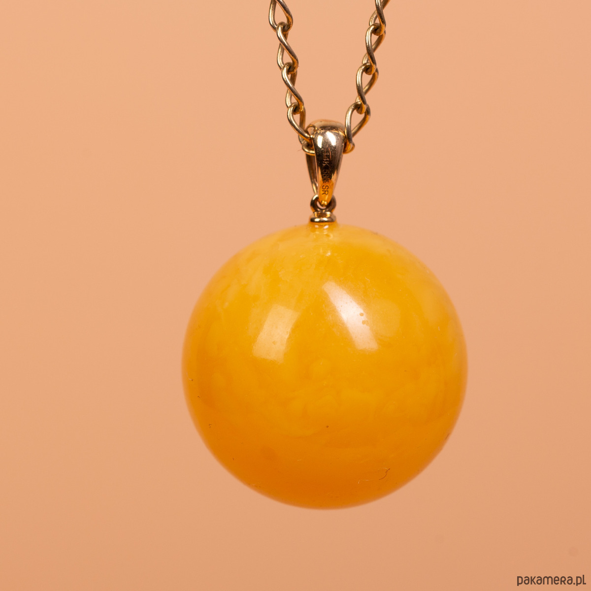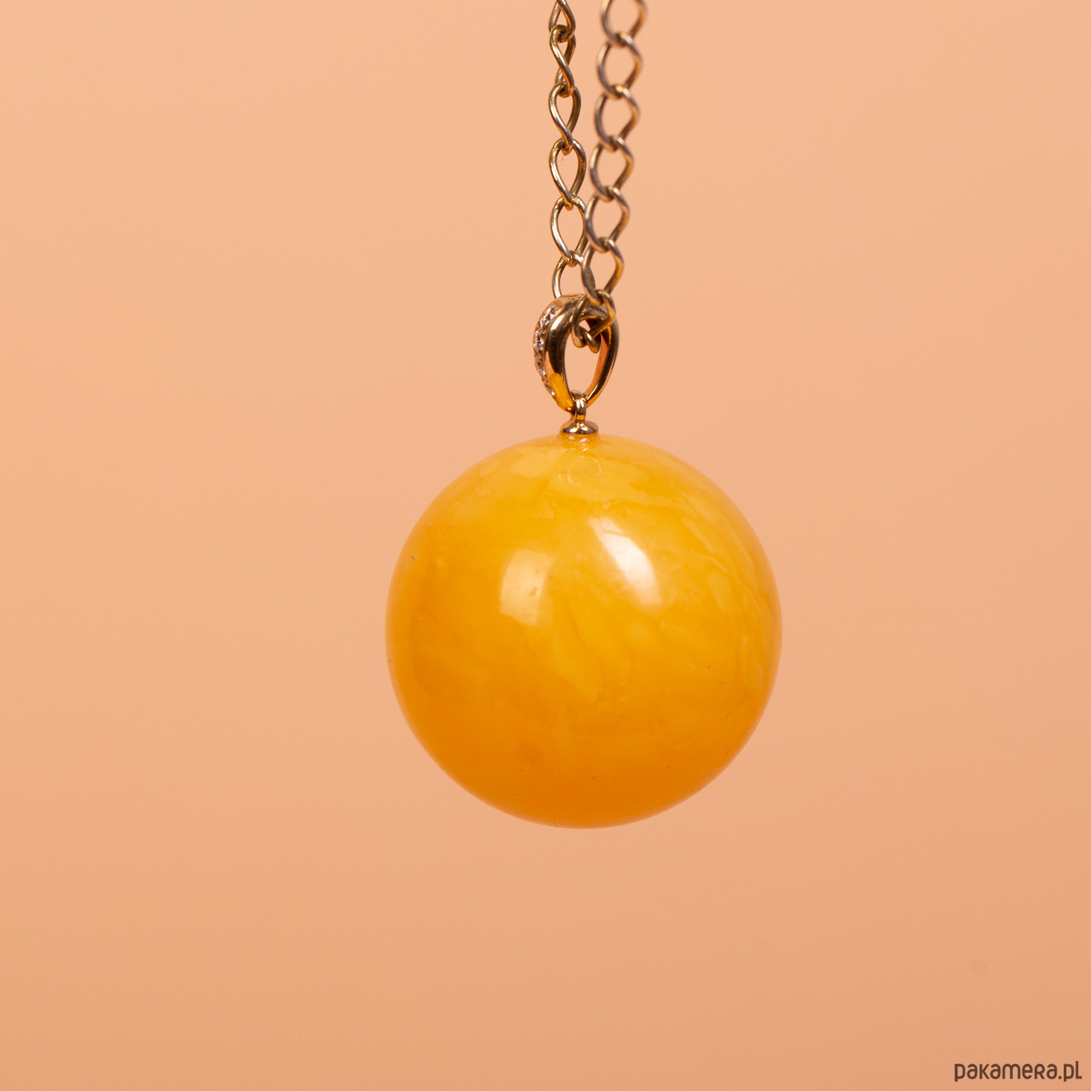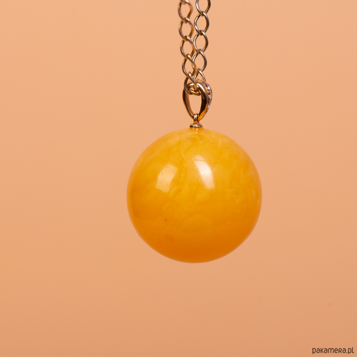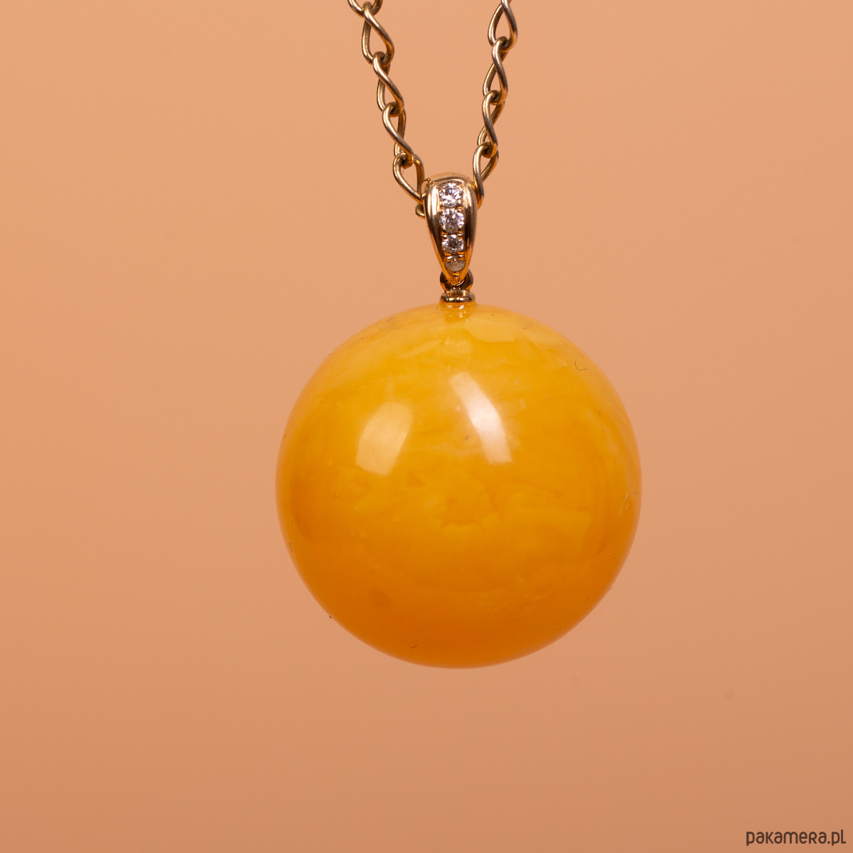 Białe złoto 14k (próba 585) · naturalny bursztyn bałtycki · 4 diamenty · waga 6,3 g · średnica kulki 2,2 cm · bez łańcuszka · ręczna praca autorska
