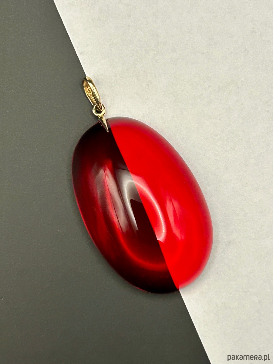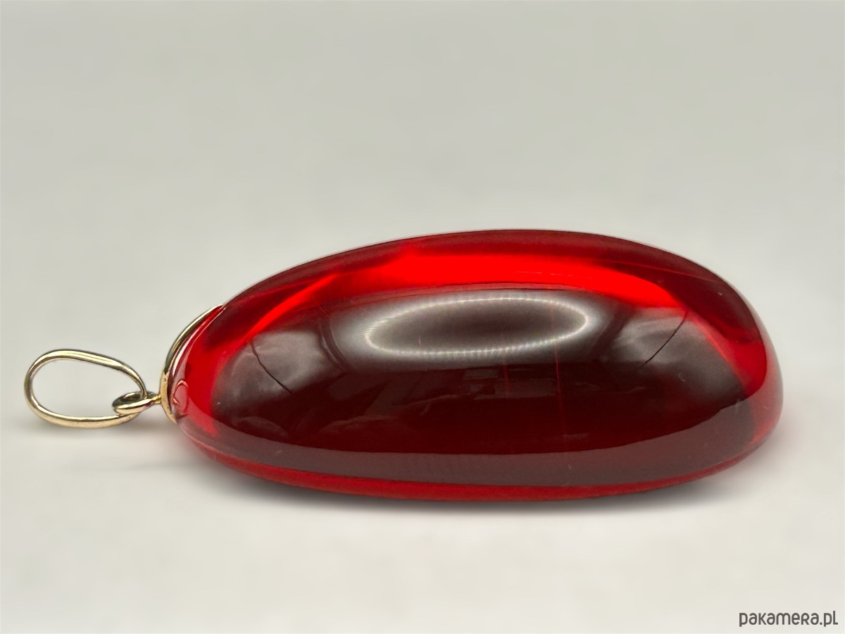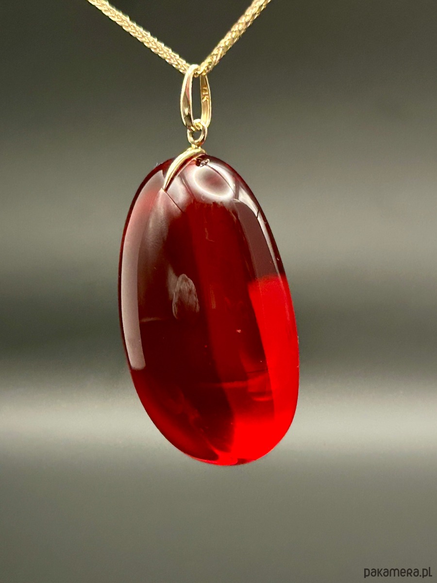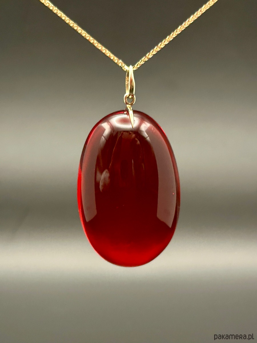 Wyrazisty wisiorek wykonany z naturalnego bursztynu bałtyckiego, poddanego profesjonalnemu barwieniu, dzięki czemu uzyskano głęboki, rubinowy kolor o pięknej, szklistej przejrzystości. Intensywna czerwień podkreśla unikatowy charakter kamienia, a gładka, wypukła forma sprawia, że wisiorek przyciąga światło i uwagę z każdej strony.