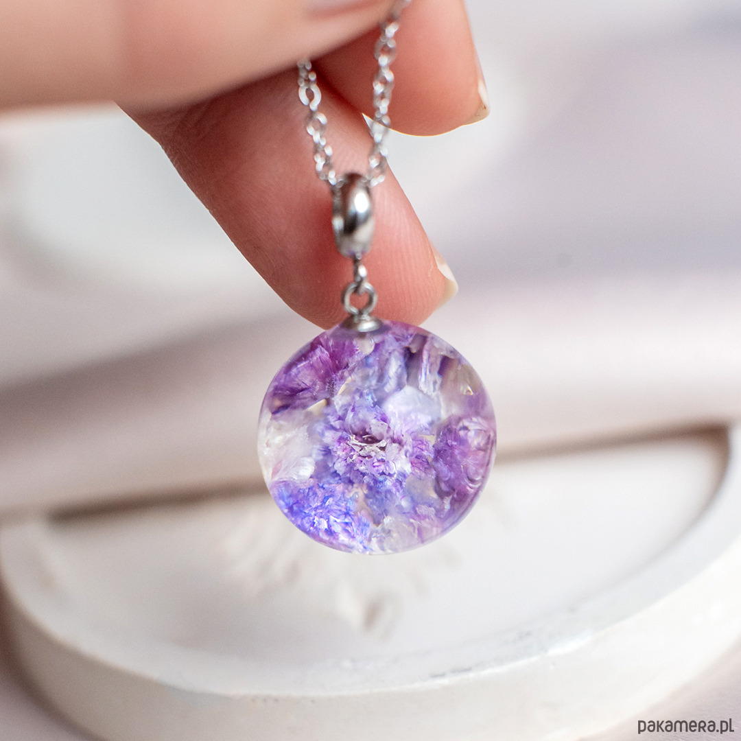 Wisiorek wykonany jest z żywicy epoksydowej z wykorzystaniem suszonych kwiatów. Metalowe elementy to stal nierdzewna szlachetna chirurgiczna.