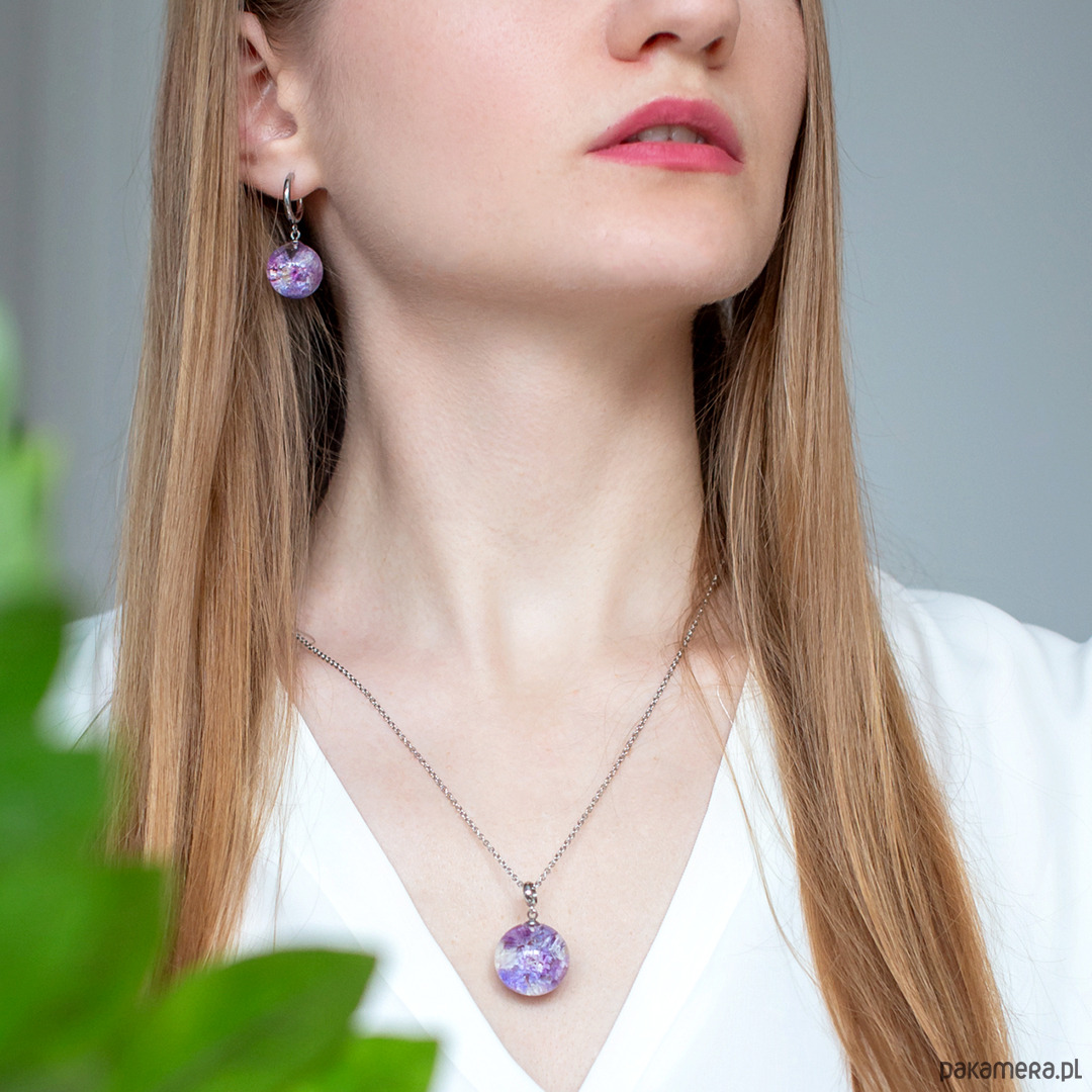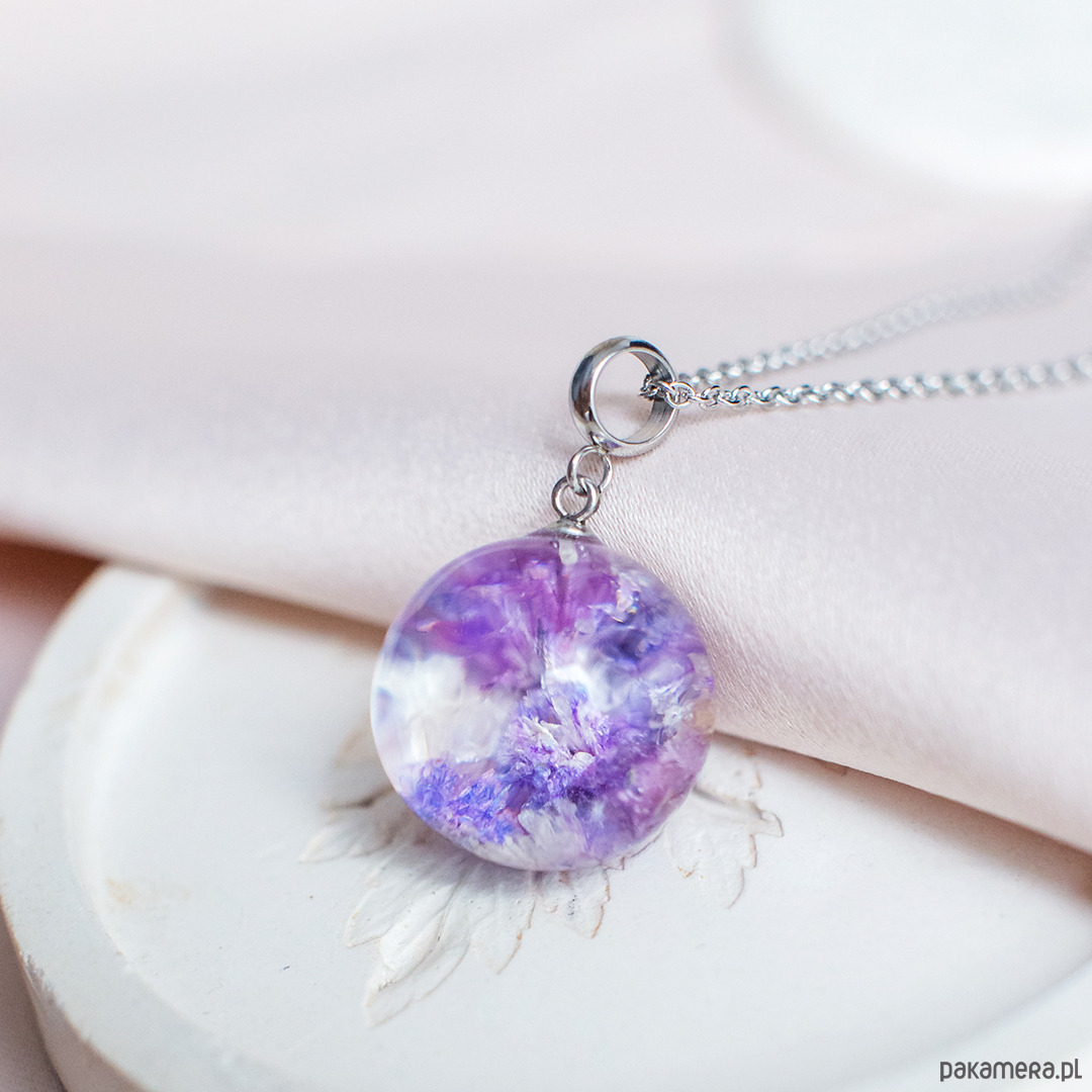 Wisiorek wykonany jest z żywicy epoksydowej z wykorzystaniem suszonych kwiatów. Metalowe elementy to stal nierdzewna szlachetna chirurgiczna.