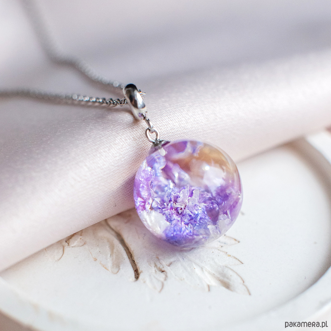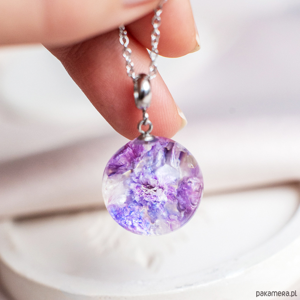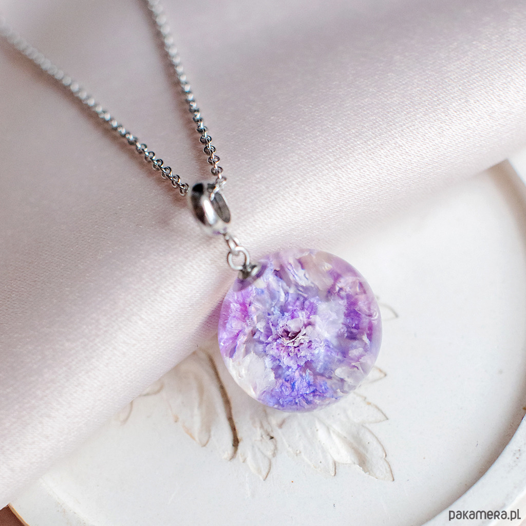Wisiorek wykonany jest z żywicy epoksydowej z wykorzystaniem suszonych kwiatów. Metalowe elementy to stal nierdzewna szlachetna chirurgiczna.