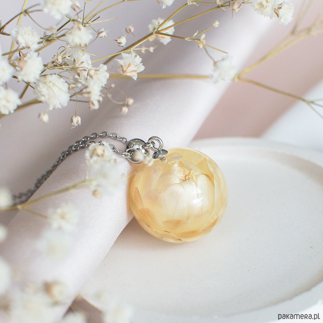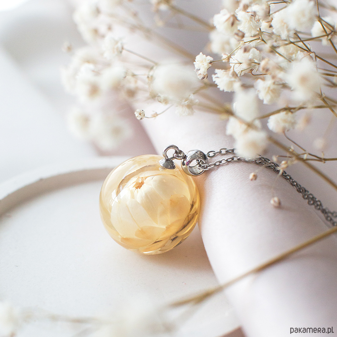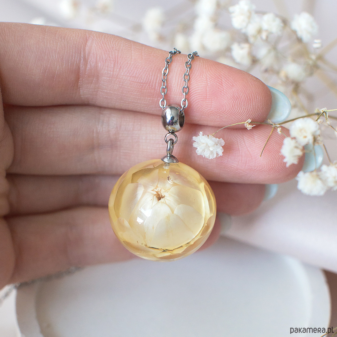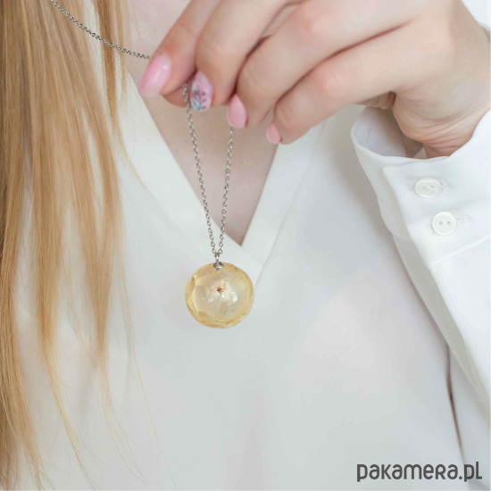 Wisiorek wykonany jest z żywicy epoksydowej z wykorzystaniem suszonych kwiatów. Metalowe elementy to stal nierdzewna szlachetna chirurgiczna.