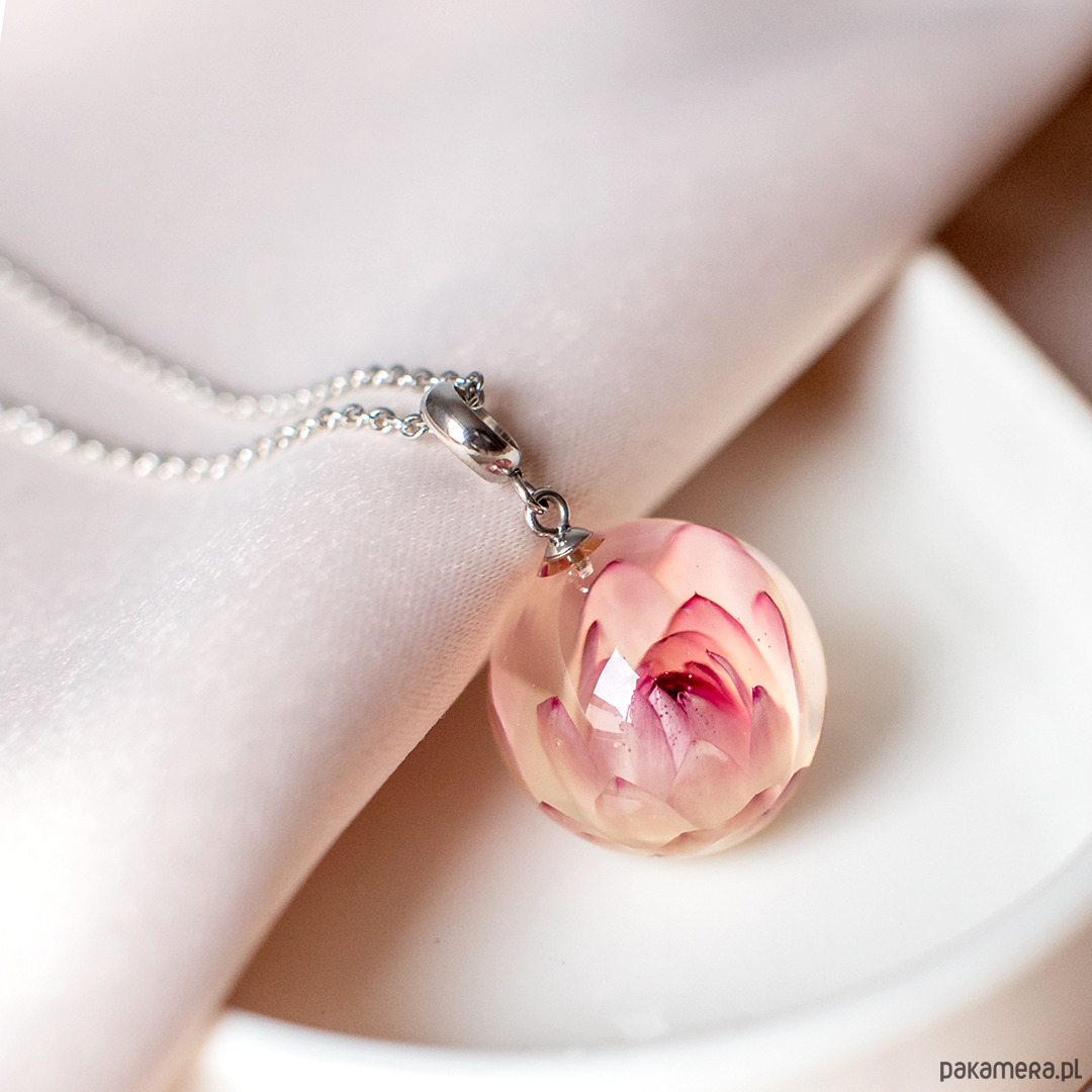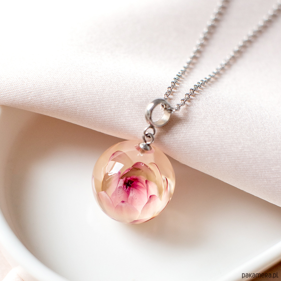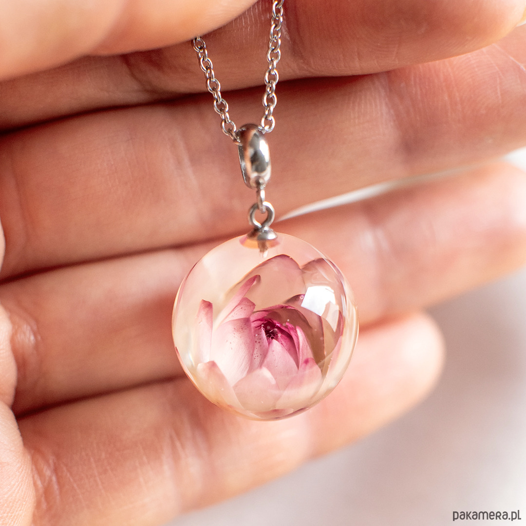 Wisiorek wykonany jest z żywicy epoksydowej z wykorzystaniem suszonych kwiatów. Metalowe elementy to stal nierdzewna szlachetna chirurgiczna.
