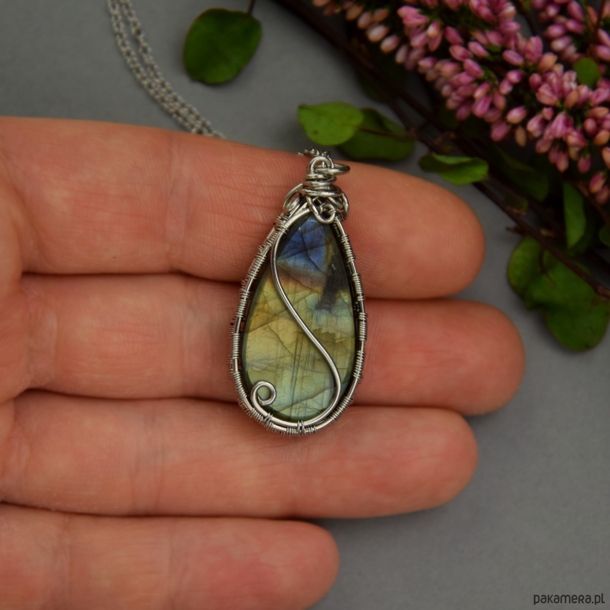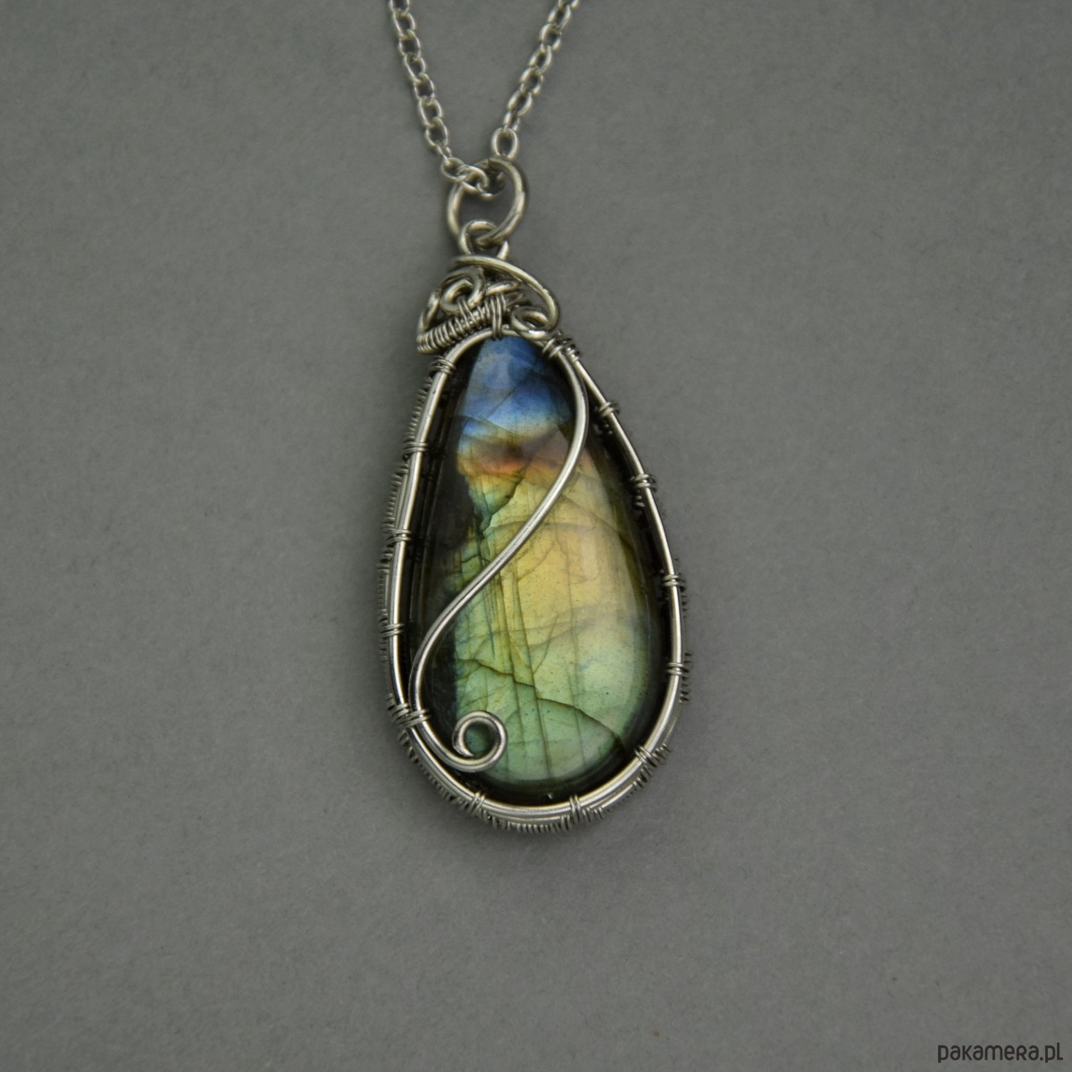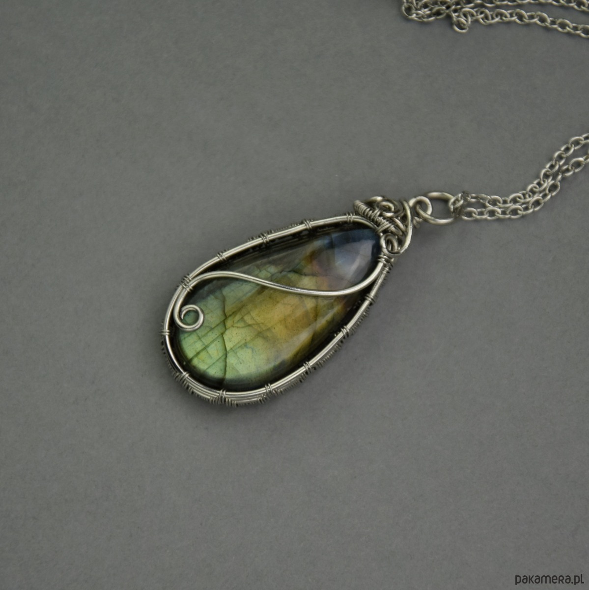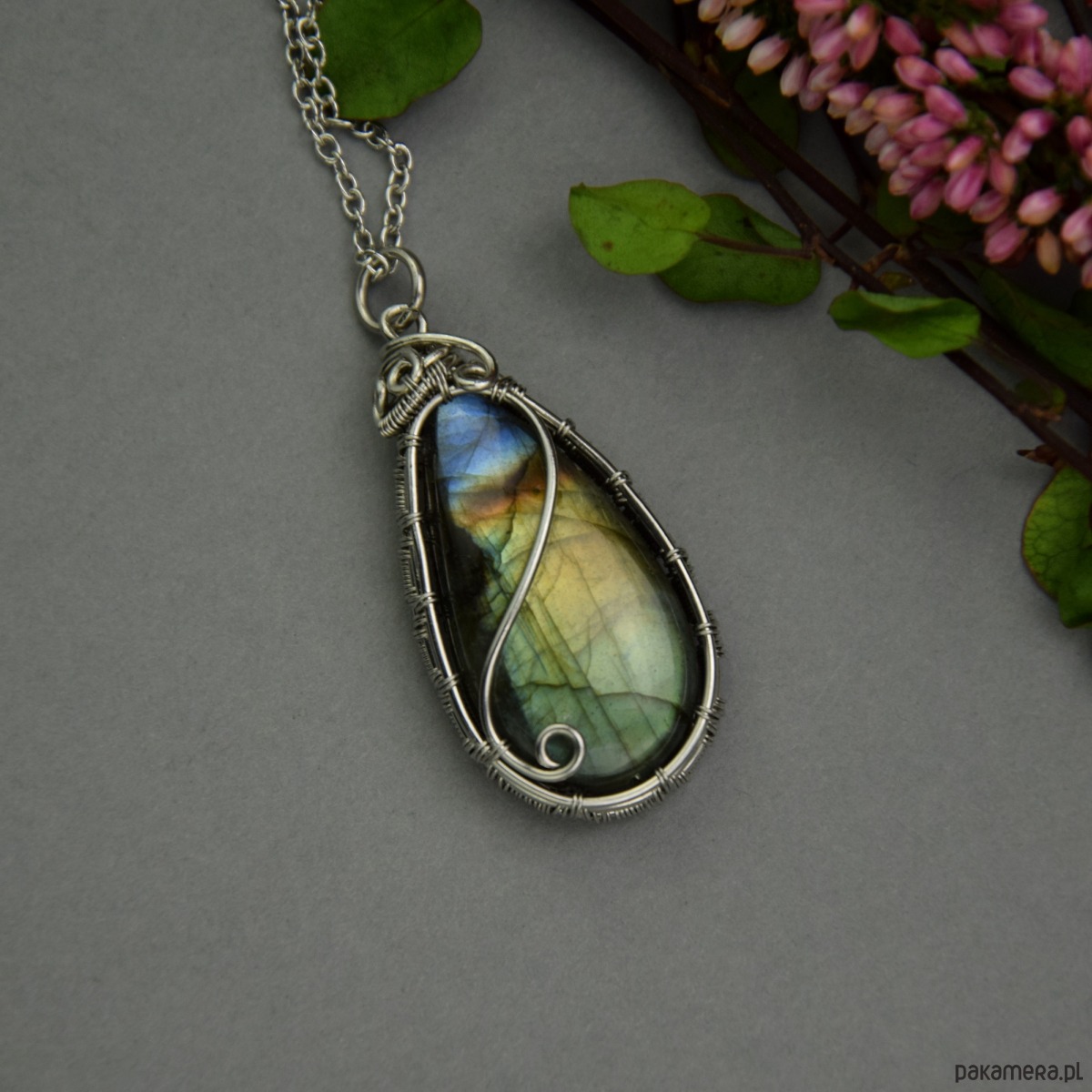 Wisiorek z kolorowym labradorytem, wykonany ręcznie techniką wire wrapping z drutów ze stali chirurgicznej.