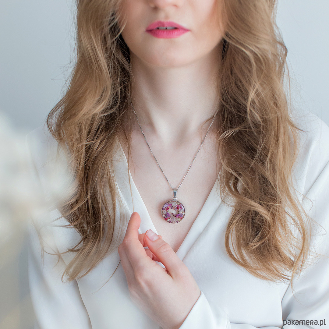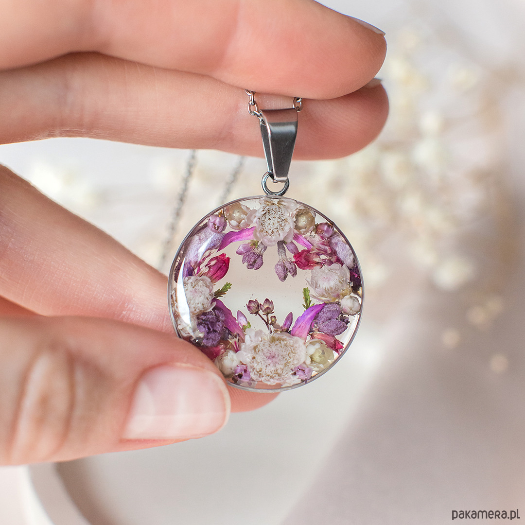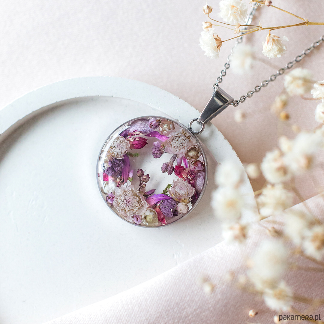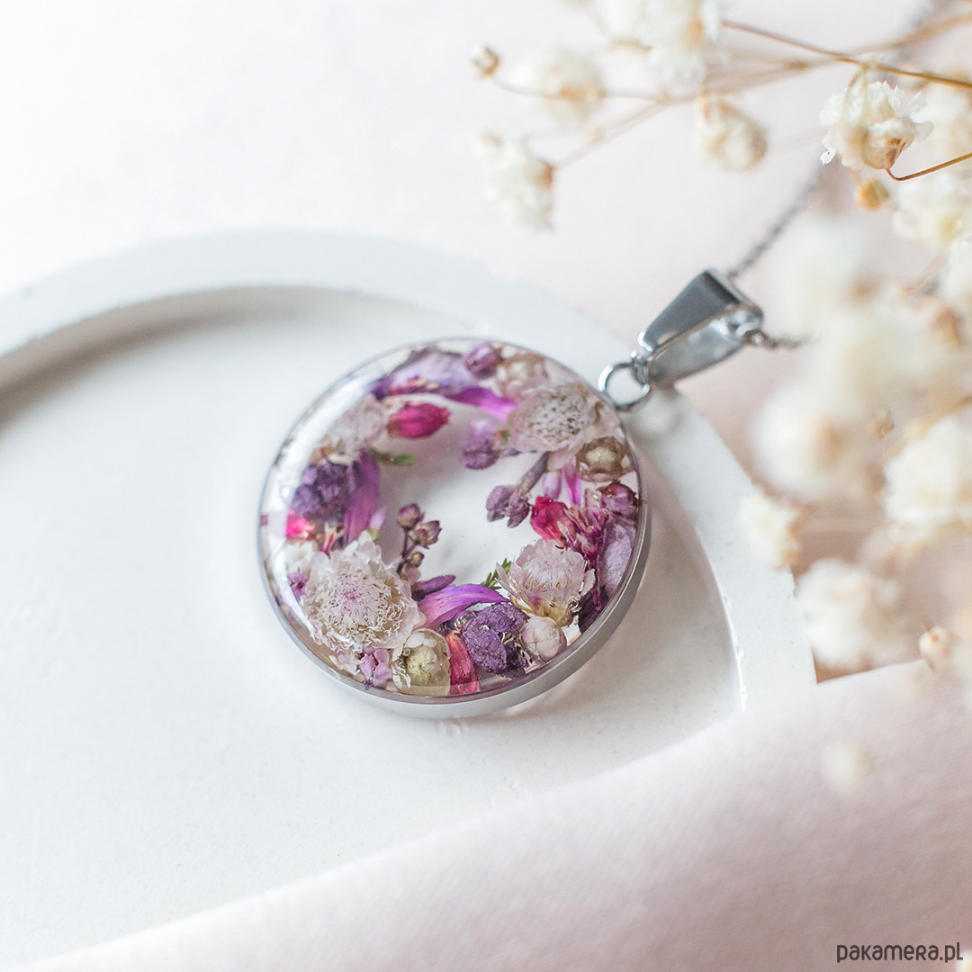 Wisiorek wykonany jest z żywicy epoksydowej z wykorzystaniem suszonych kwiatów. Metalowe elementy to stal nierdzewna szlachetna chirurgiczna.