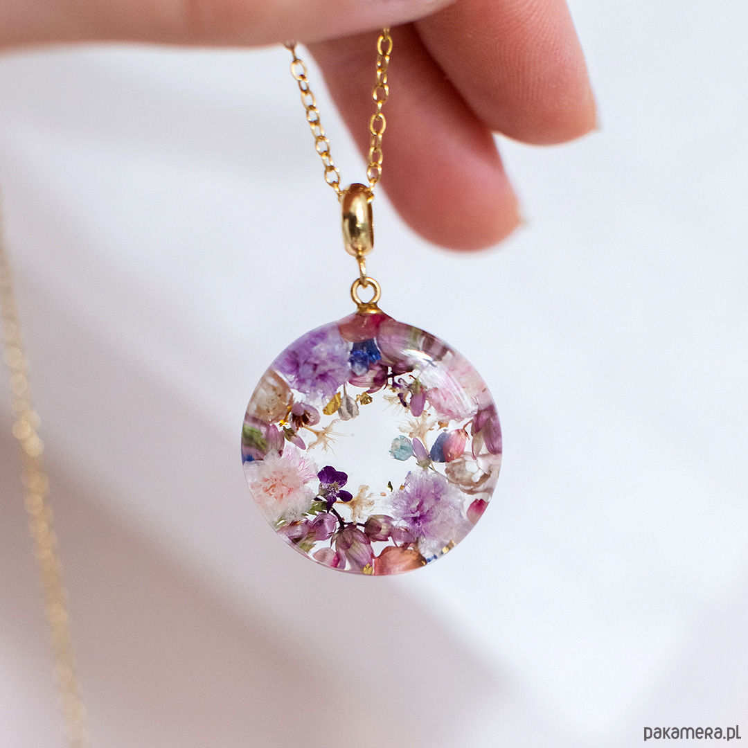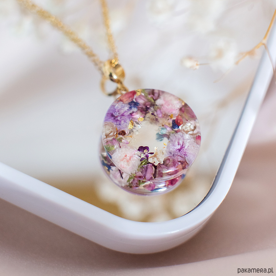 Wisiorek wykonany jest z żywicy epoksydowej z wykorzystaniem suszonych kwiatów. Metalowe elementy to stal nierdzewna szlachetna chirurgiczna.