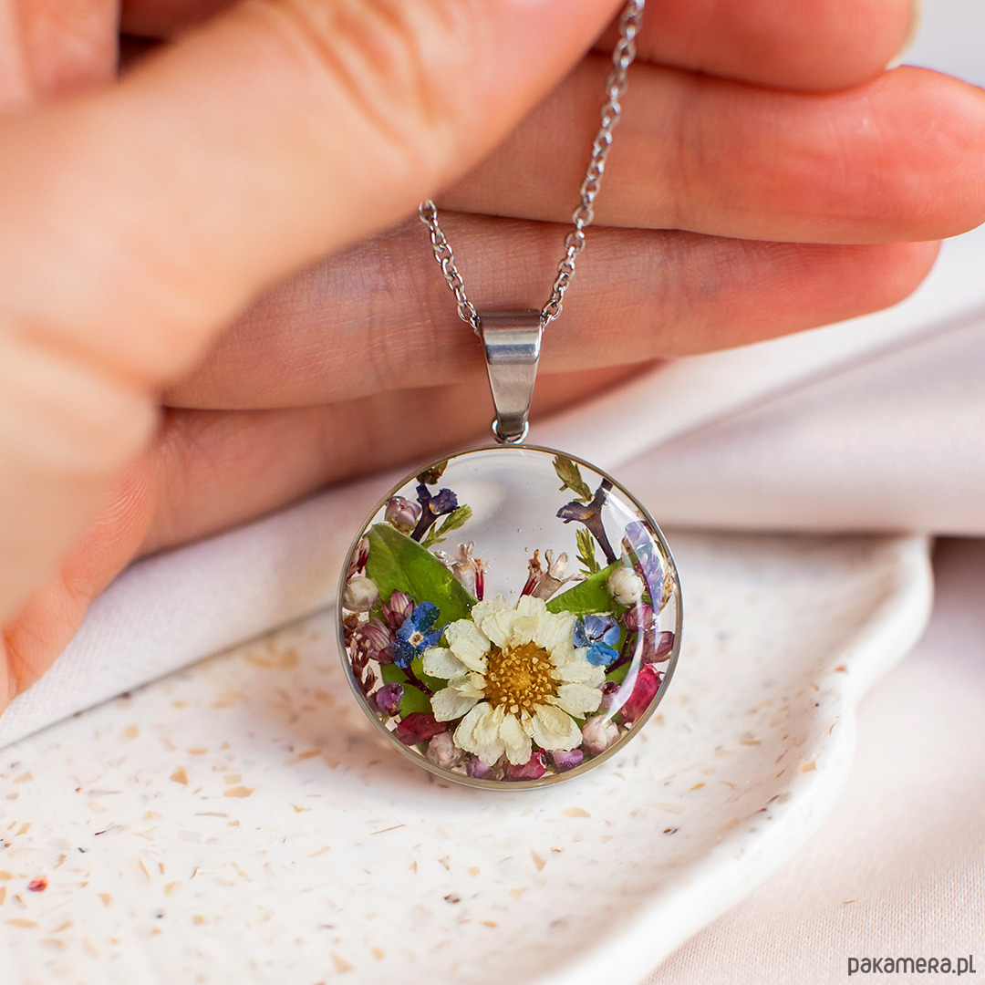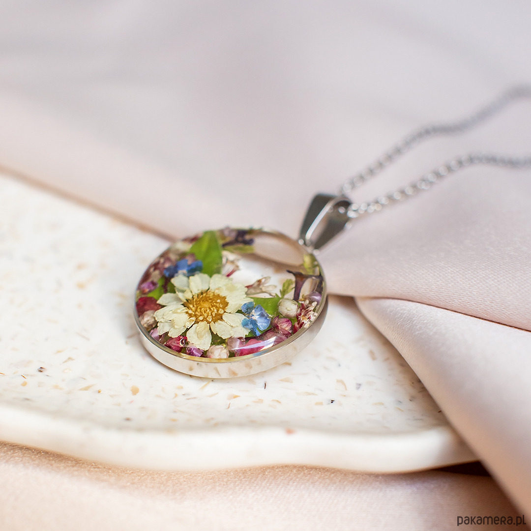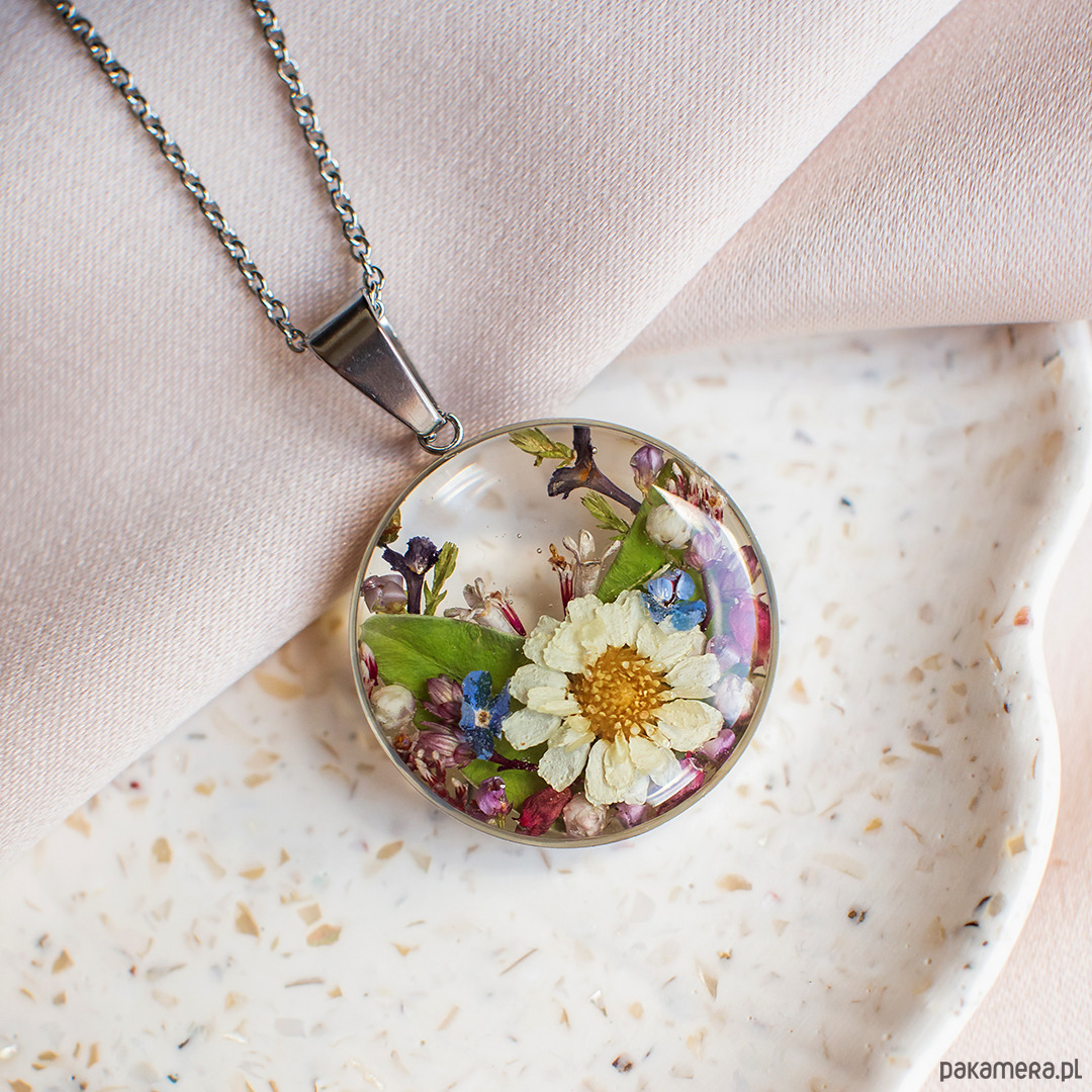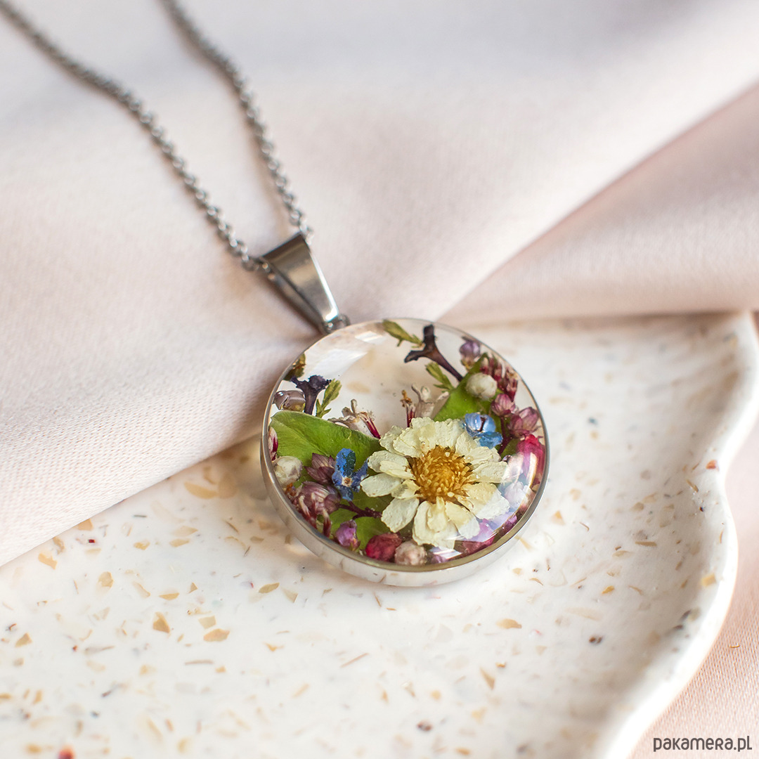 Wisiorek wykonany jest z żywicy epoksydowej z wykorzystaniem suszonych kwiatów. Metalowe elementy to stal nierdzewna szlachetna chirurgiczna.