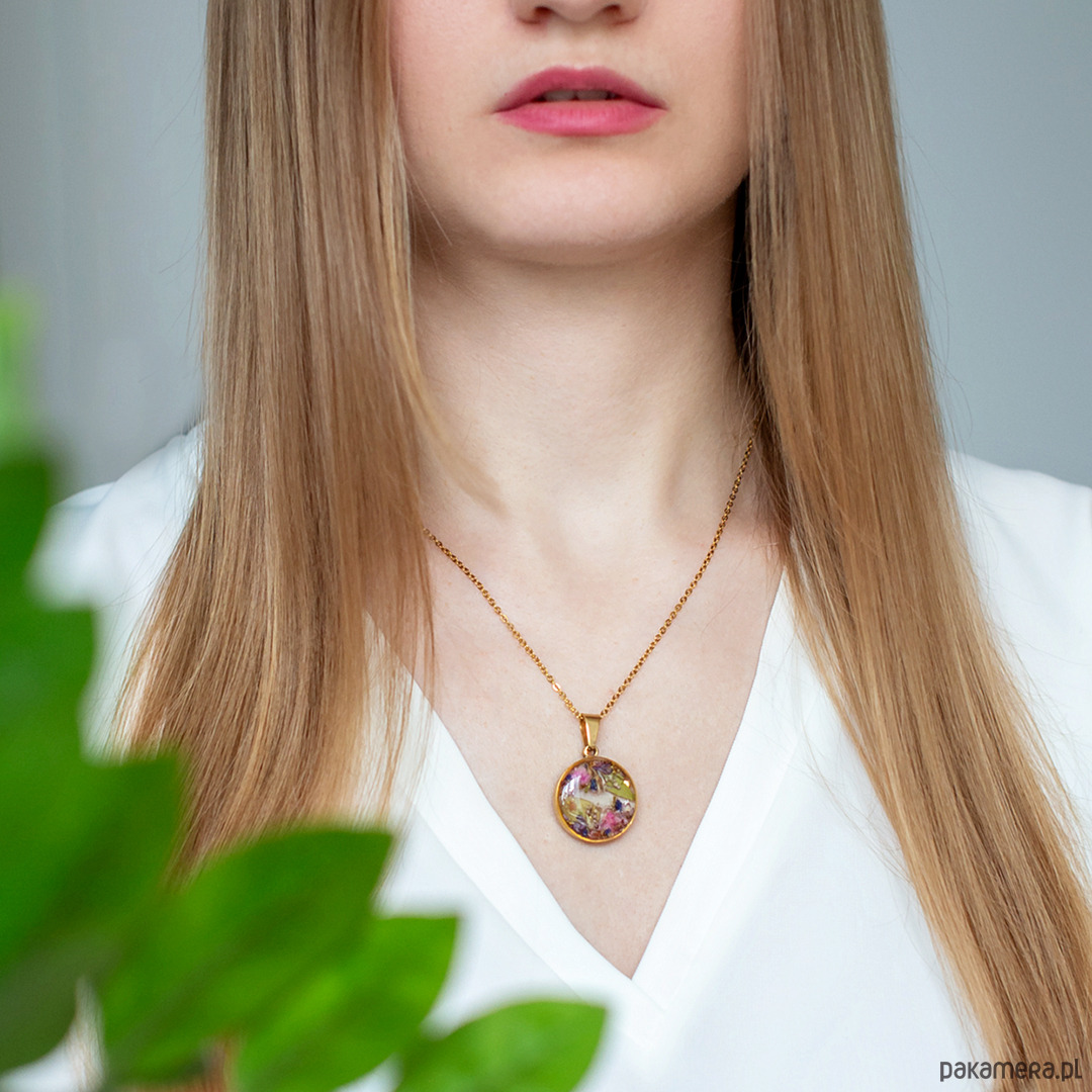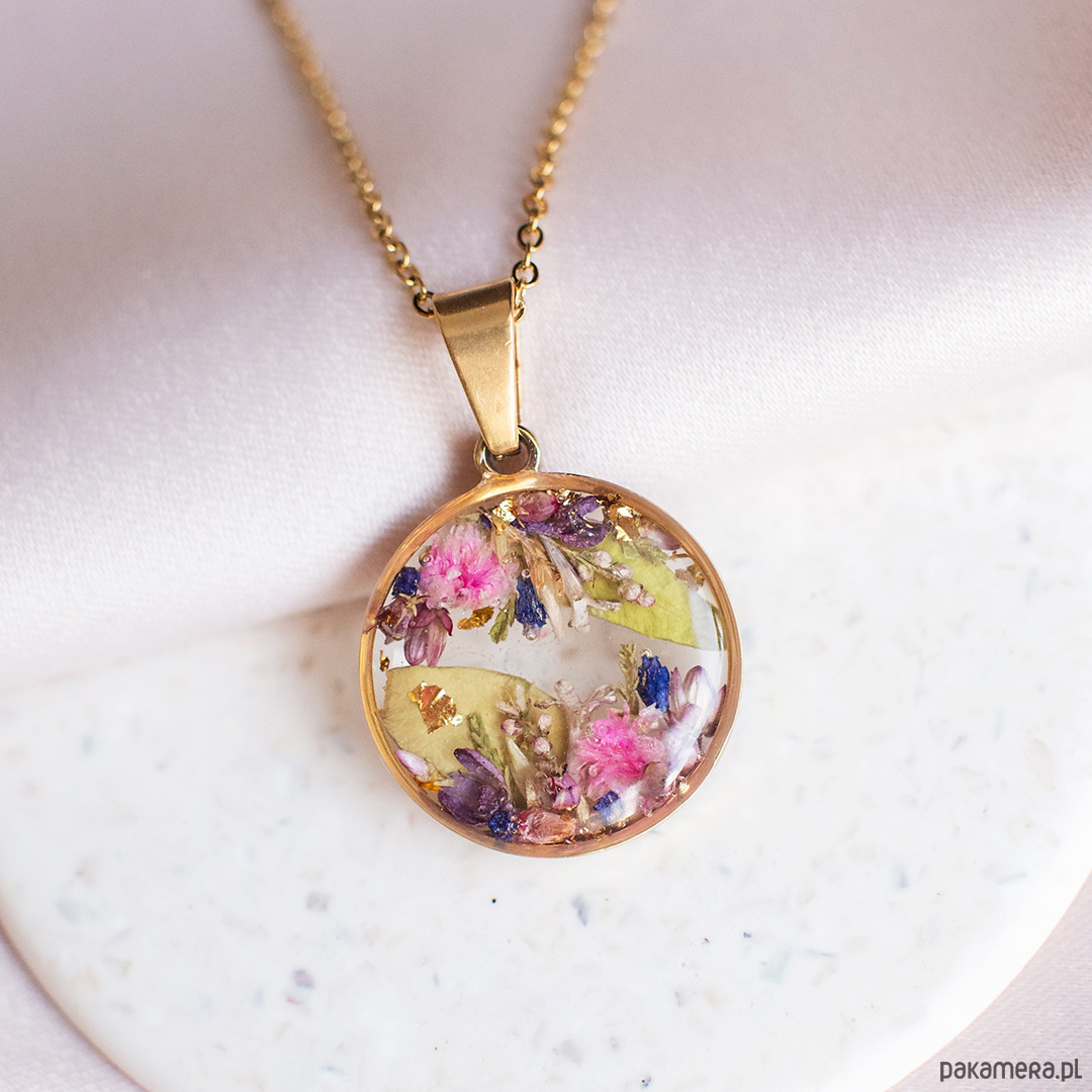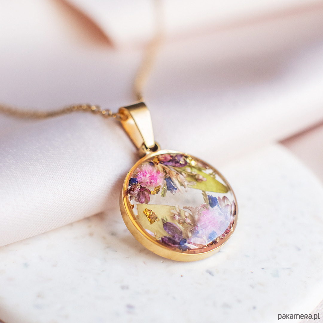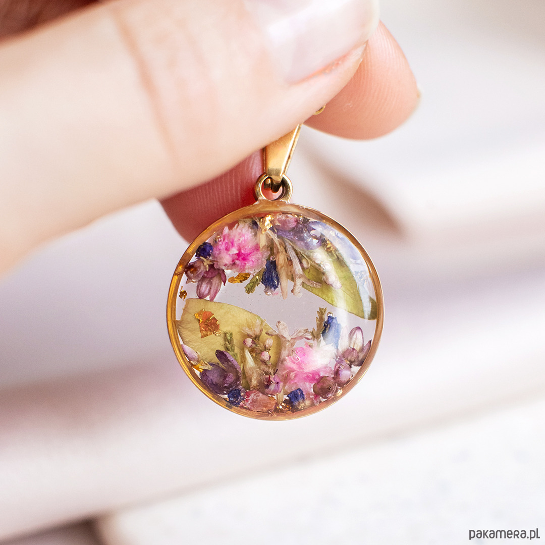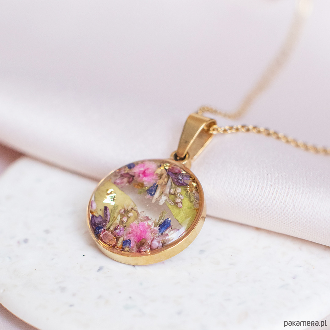 Wisiorek wykonany jest z żywicy epoksydowej z wykorzystaniem suszonych kwiatów. Metalowe elementy to stal nierdzewna szlachetna chirurgiczna.