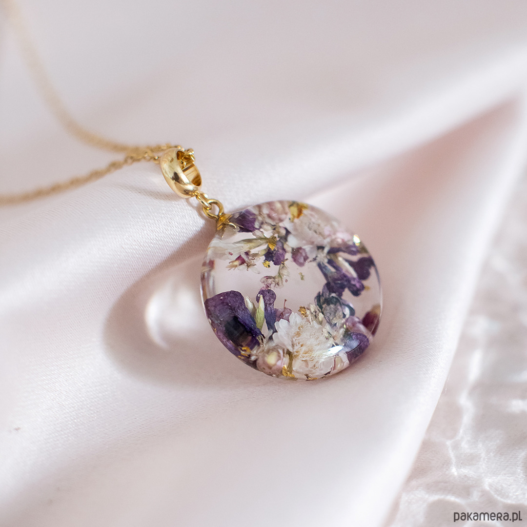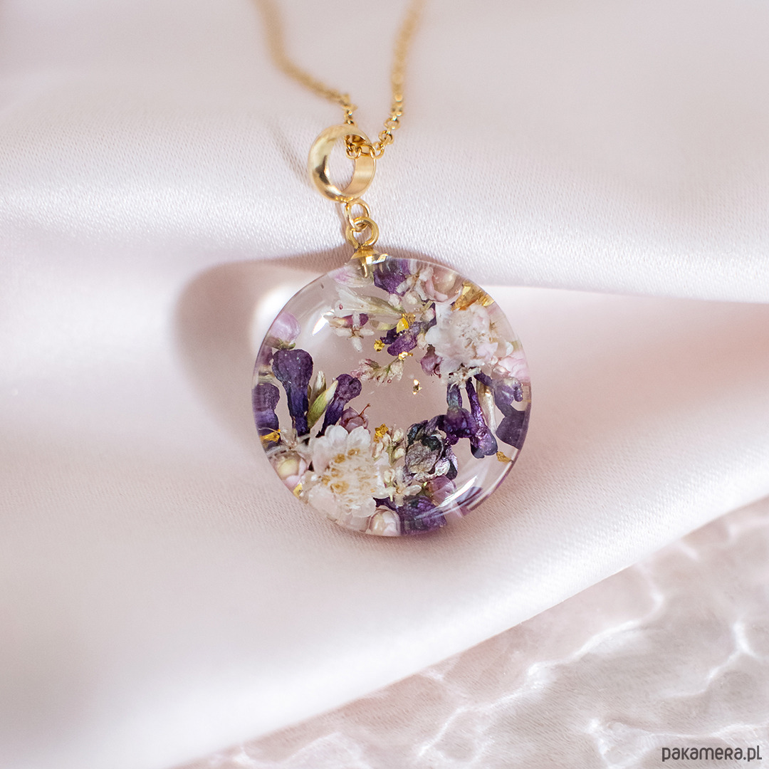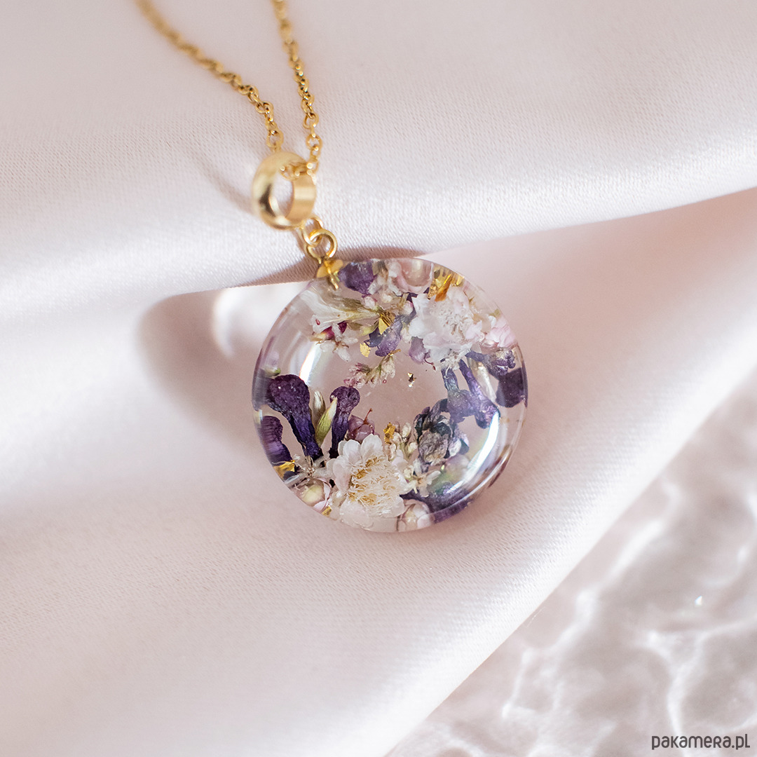 Wisiorek wykonany jest z żywicy epoksydowej z wykorzystaniem suszonych kwiatów. Metalowe elementy to stal nierdzewna szlachetna chirurgiczna.