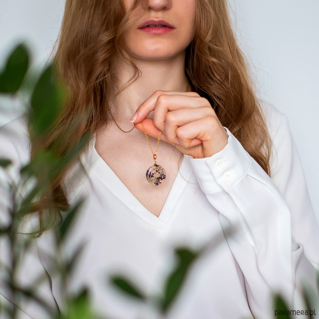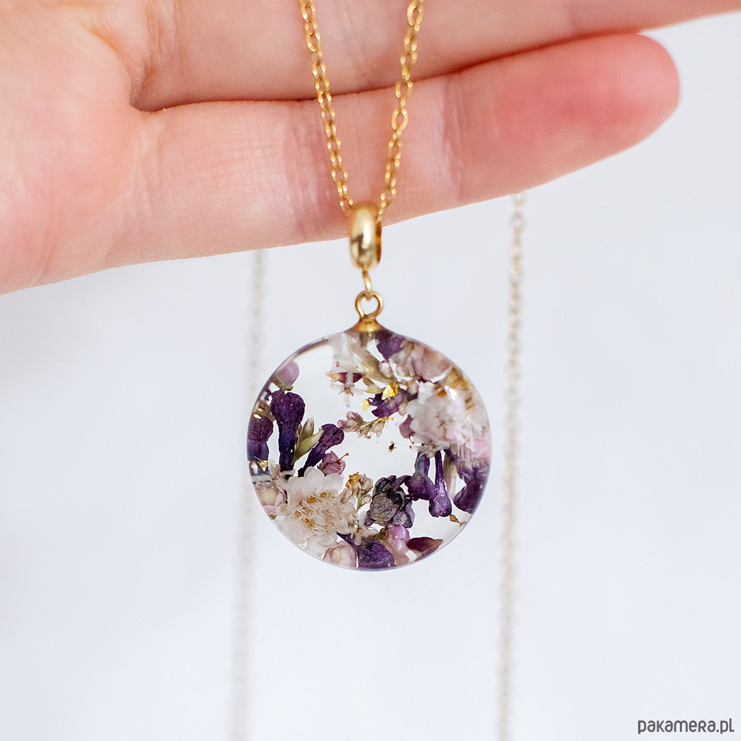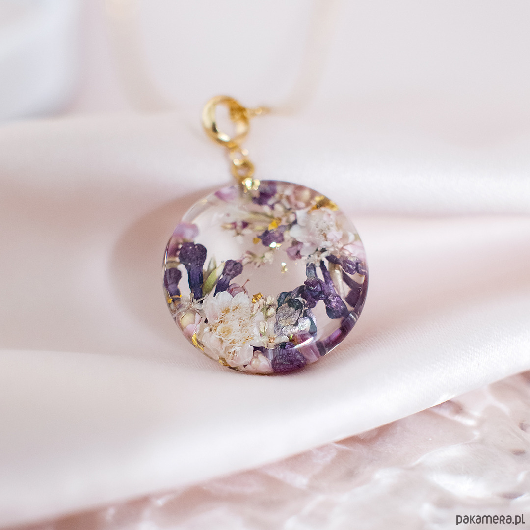 Wisiorek wykonany jest z żywicy epoksydowej z wykorzystaniem suszonych kwiatów. Metalowe elementy to stal nierdzewna szlachetna chirurgiczna.