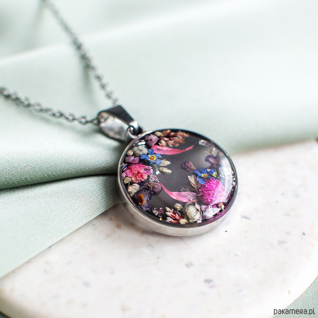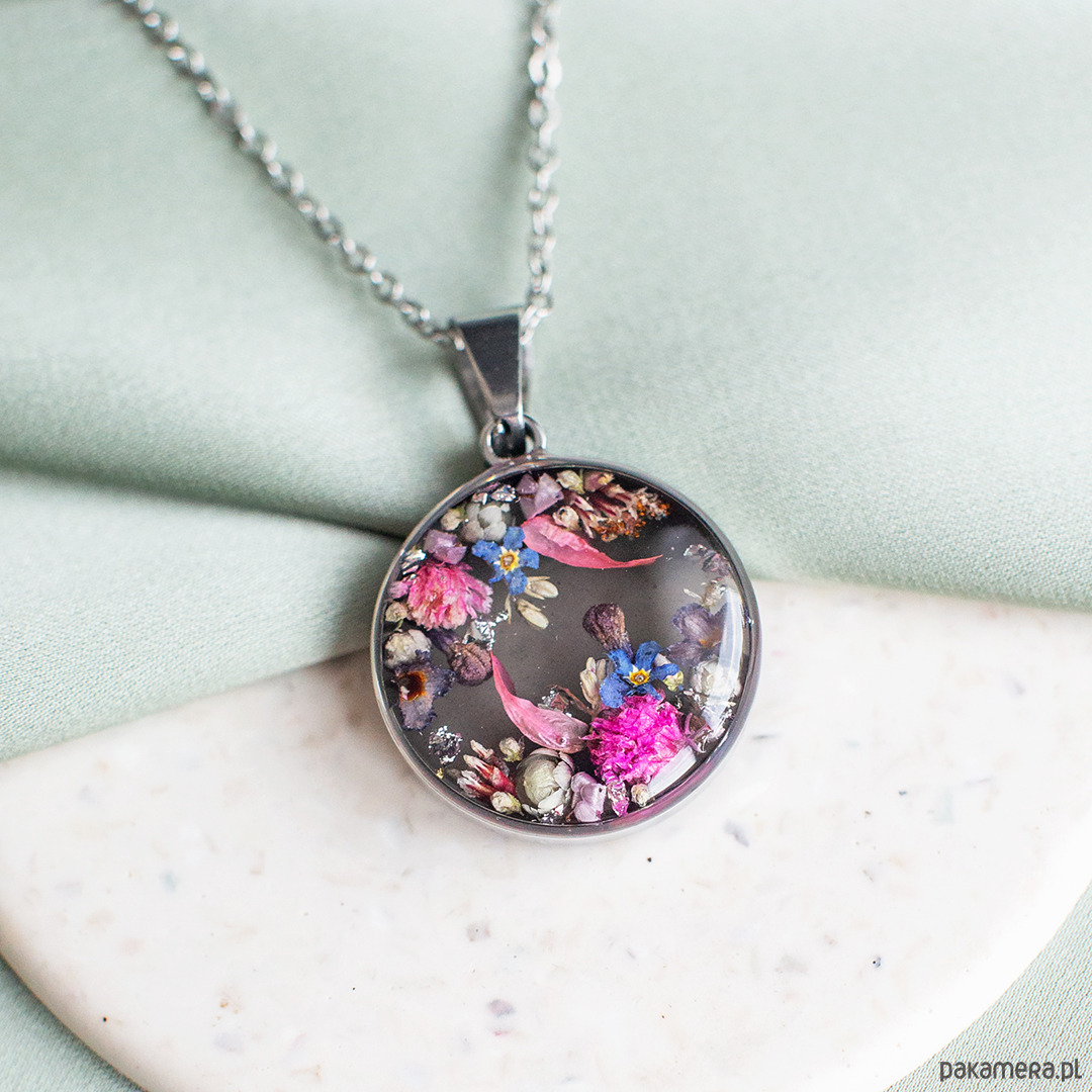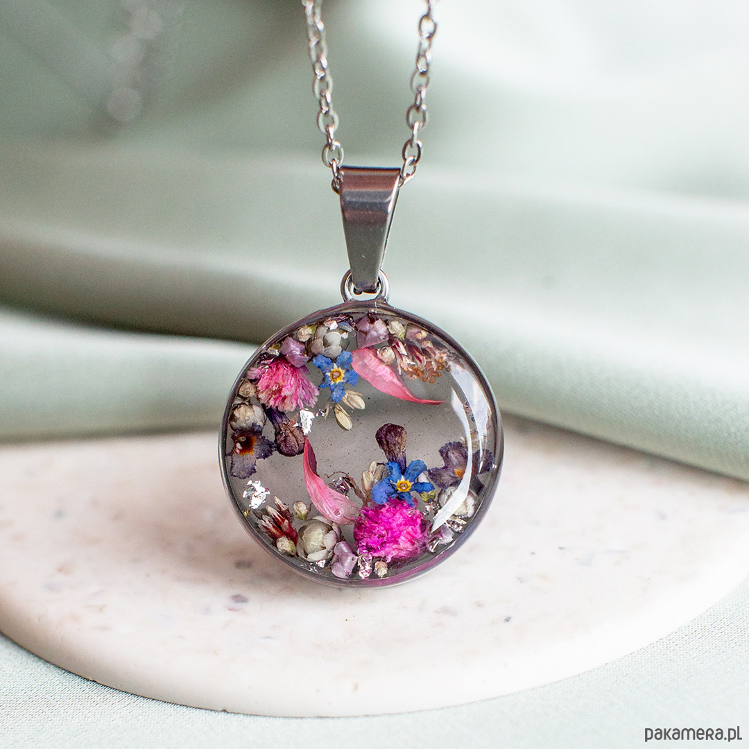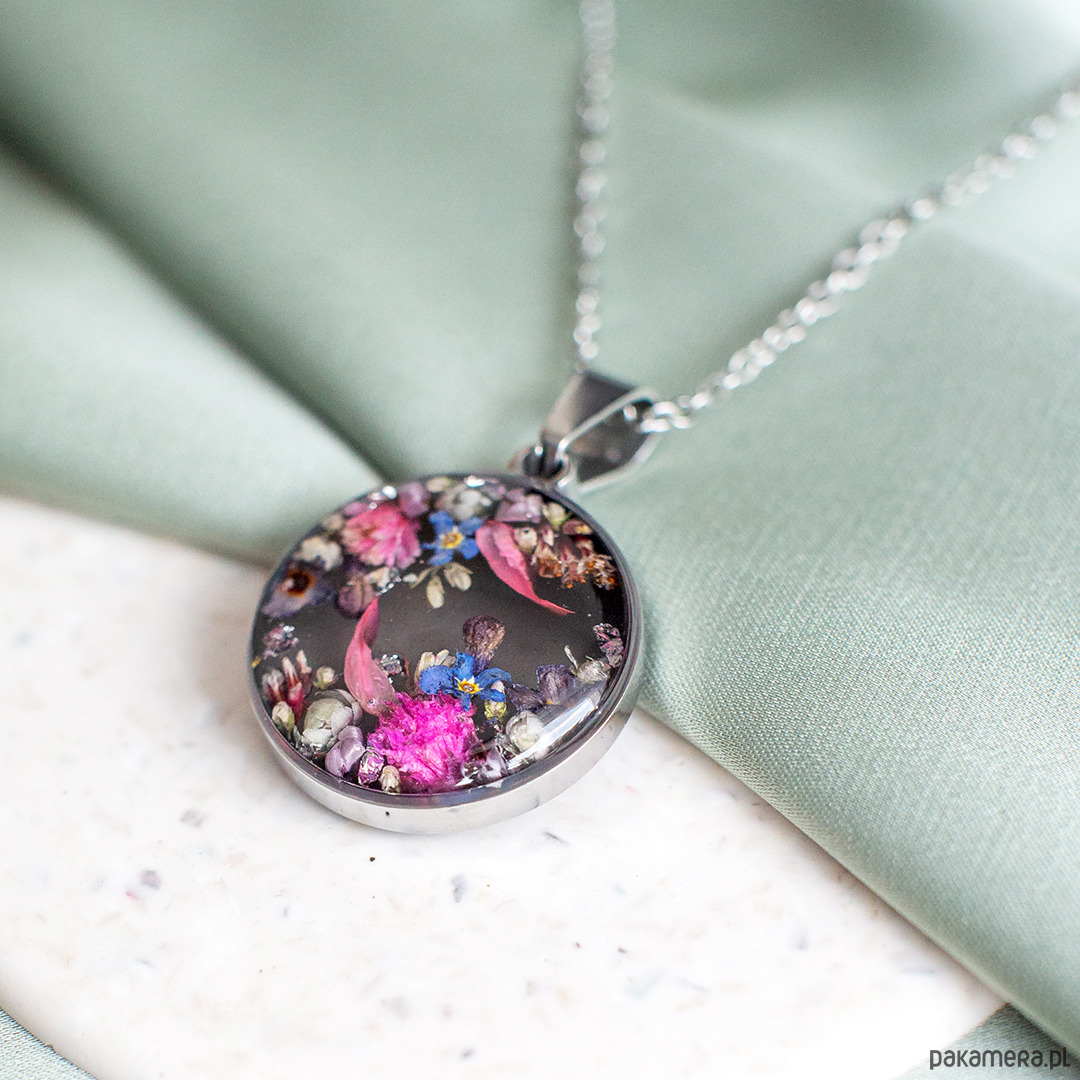 Wisiorek wykonany jest z żywicy epoksydowej z wykorzystaniem suszonych kwiatów. Metalowe elementy to stal nierdzewna szlachetna chirurgiczna.