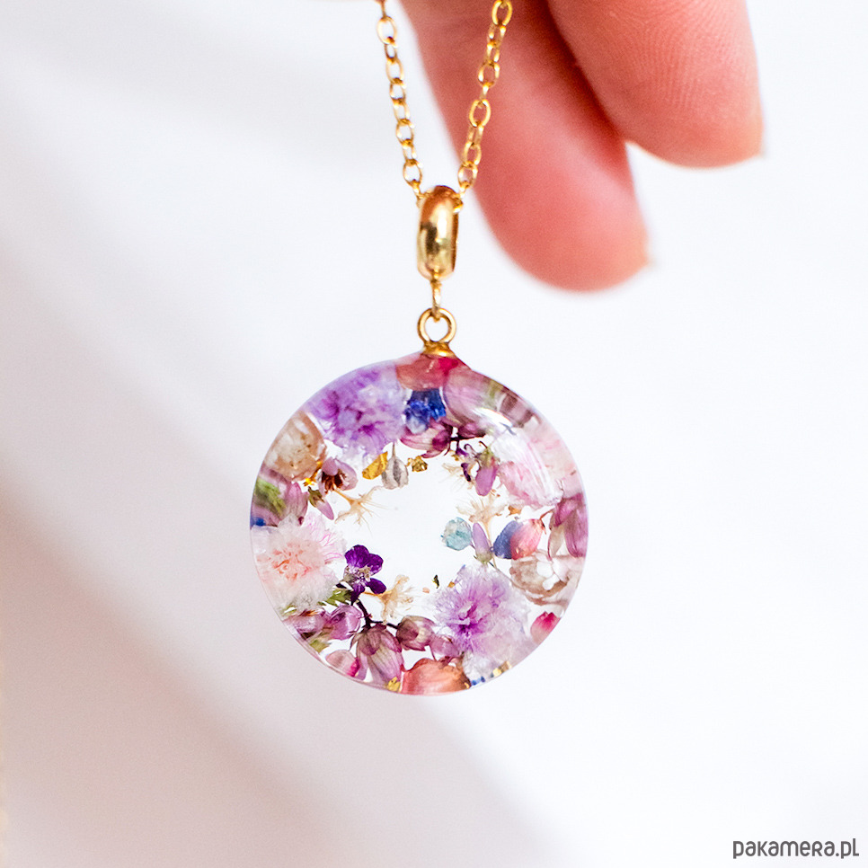 Wisiorek wykonany jest z żywicy epoksydowej z wykorzystaniem suszonych kwiatów. Metalowe elementy to stal nierdzewna szlachetna chirurgiczna.