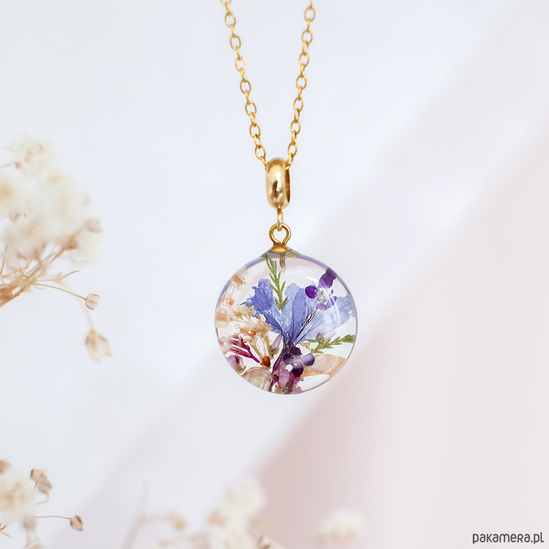 Wisiorek wykonany jest z żywicy epoksydowej z wykorzystaniem suszonych kwiatów. Metalowe elementy to stal nierdzewna szlachetna chirurgiczna.