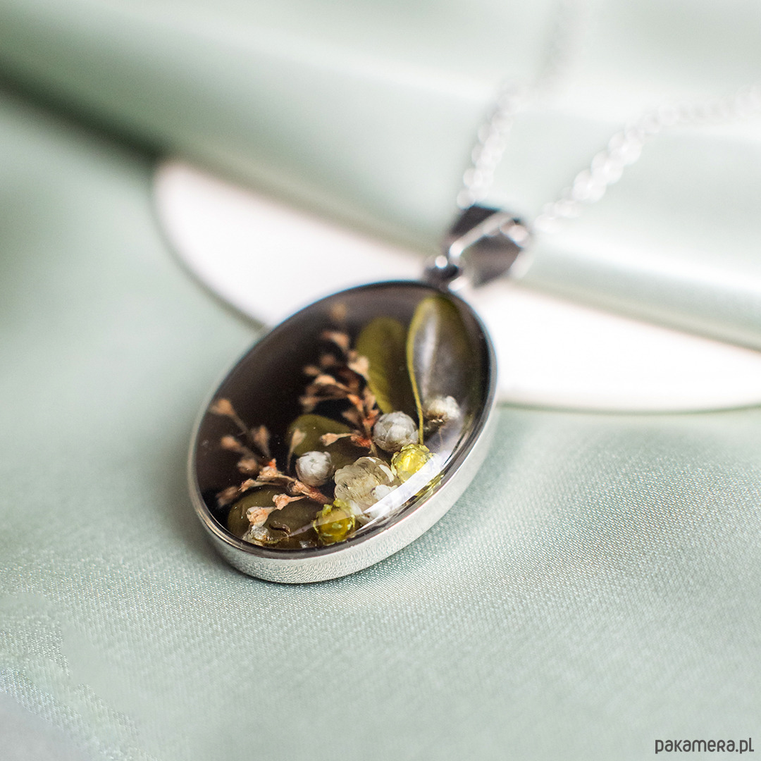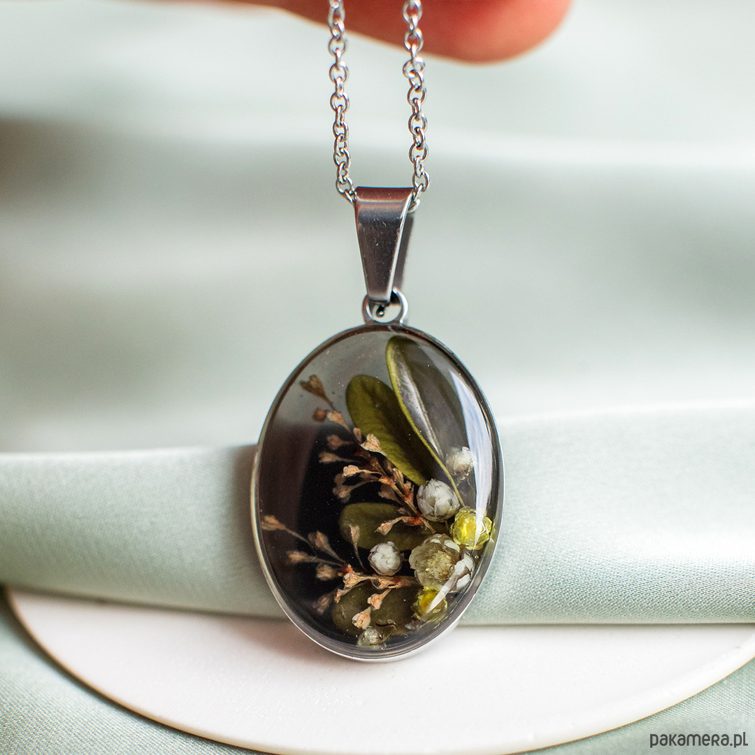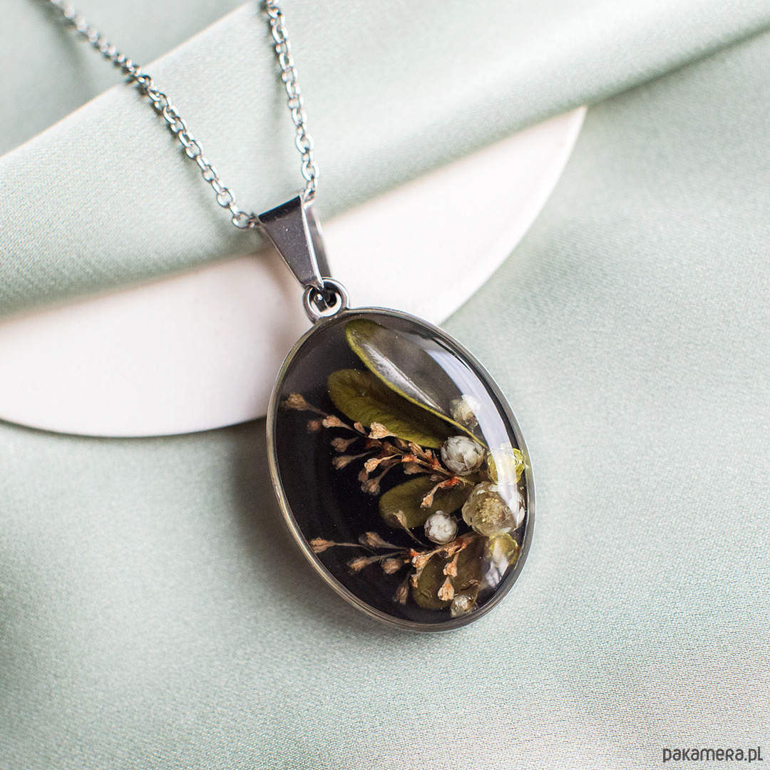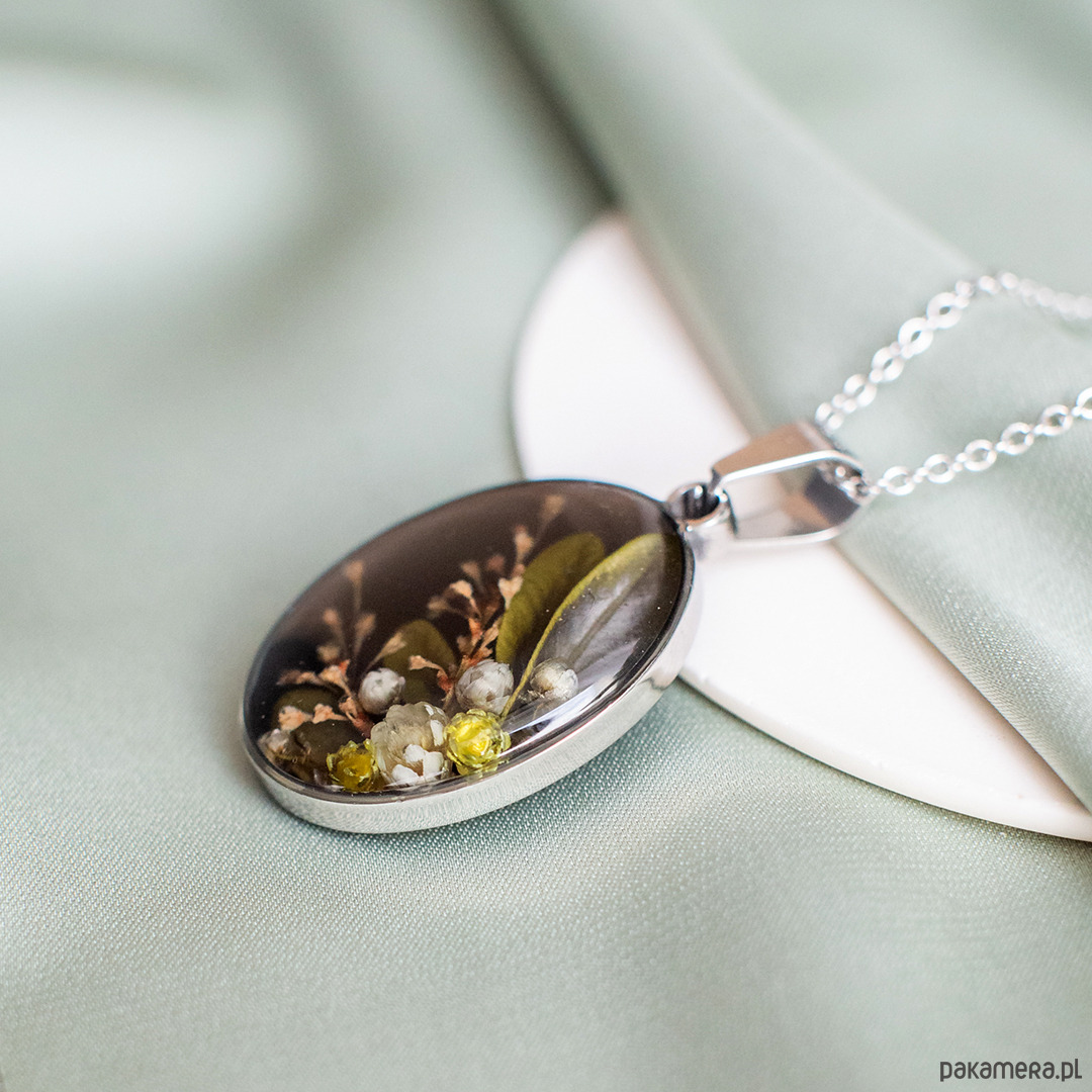 Wisiorek wykonany jest z żywicy epoksydowej z wykorzystaniem suszonych kwiatów. Metalowe elementy to stal nierdzewna szlachetna chirurgiczna.