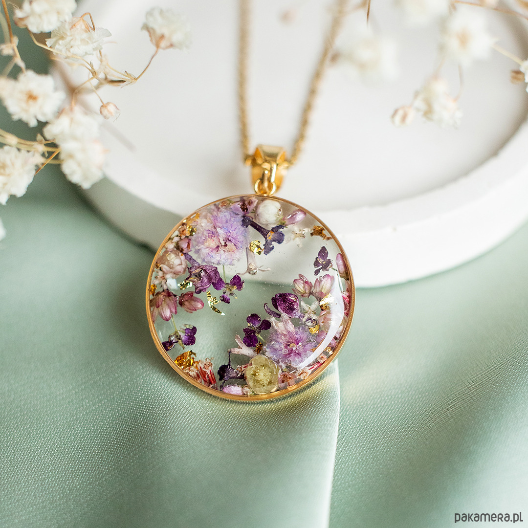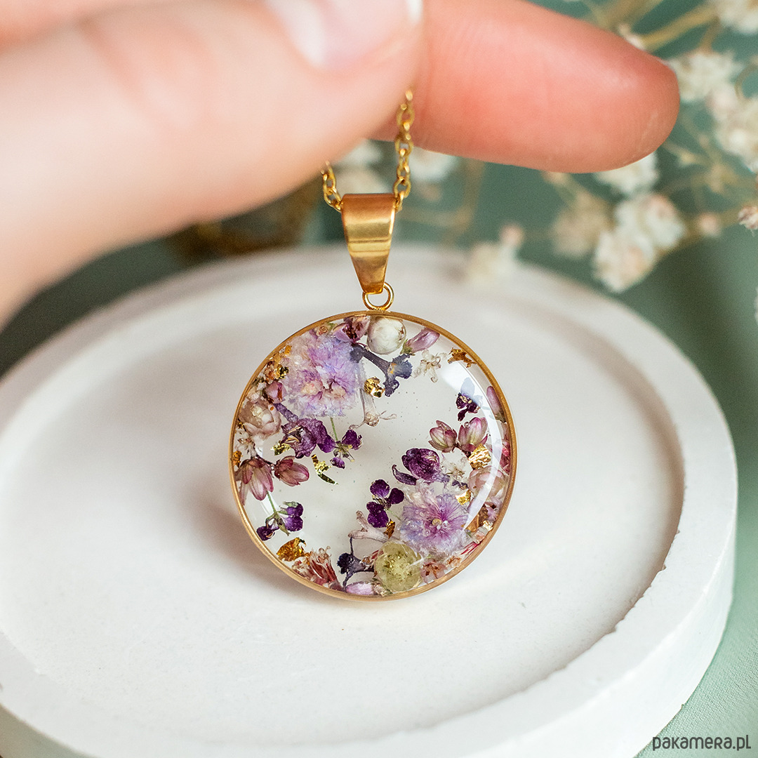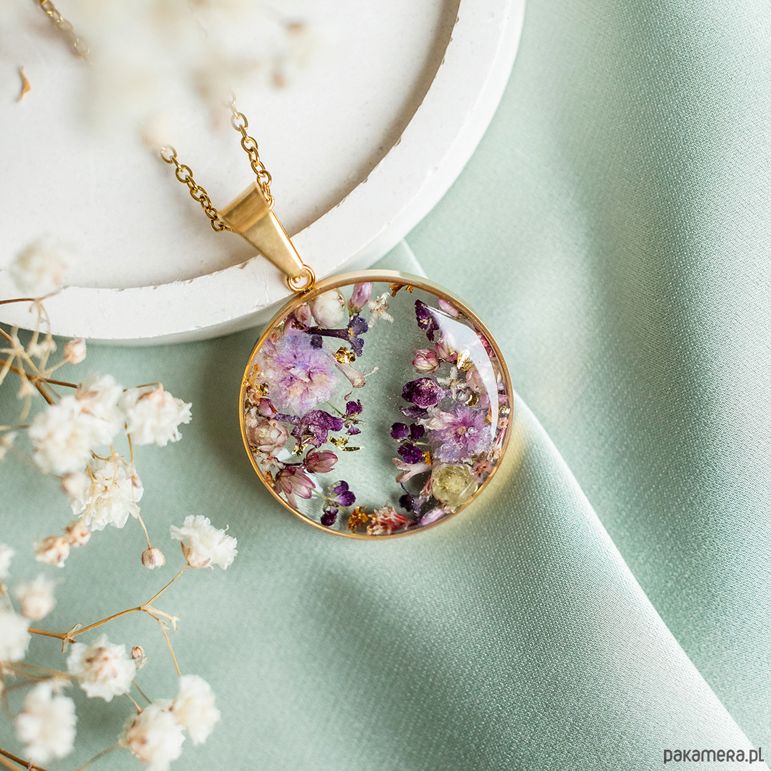 Wisiorek wykonany jest z żywicy epoksydowej z wykorzystaniem suszonych kwiatów. Metalowe elementy to stal nierdzewna szlachetna chirurgiczna.