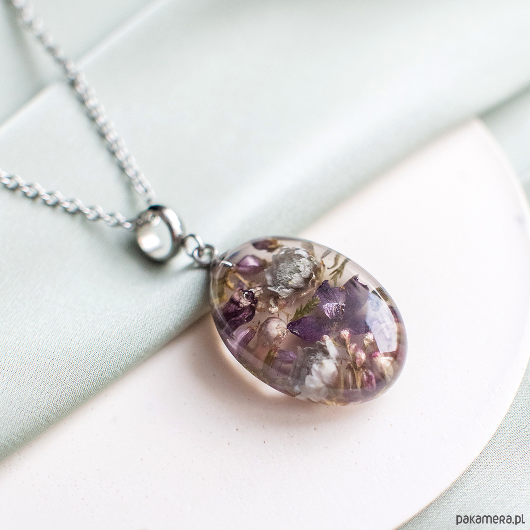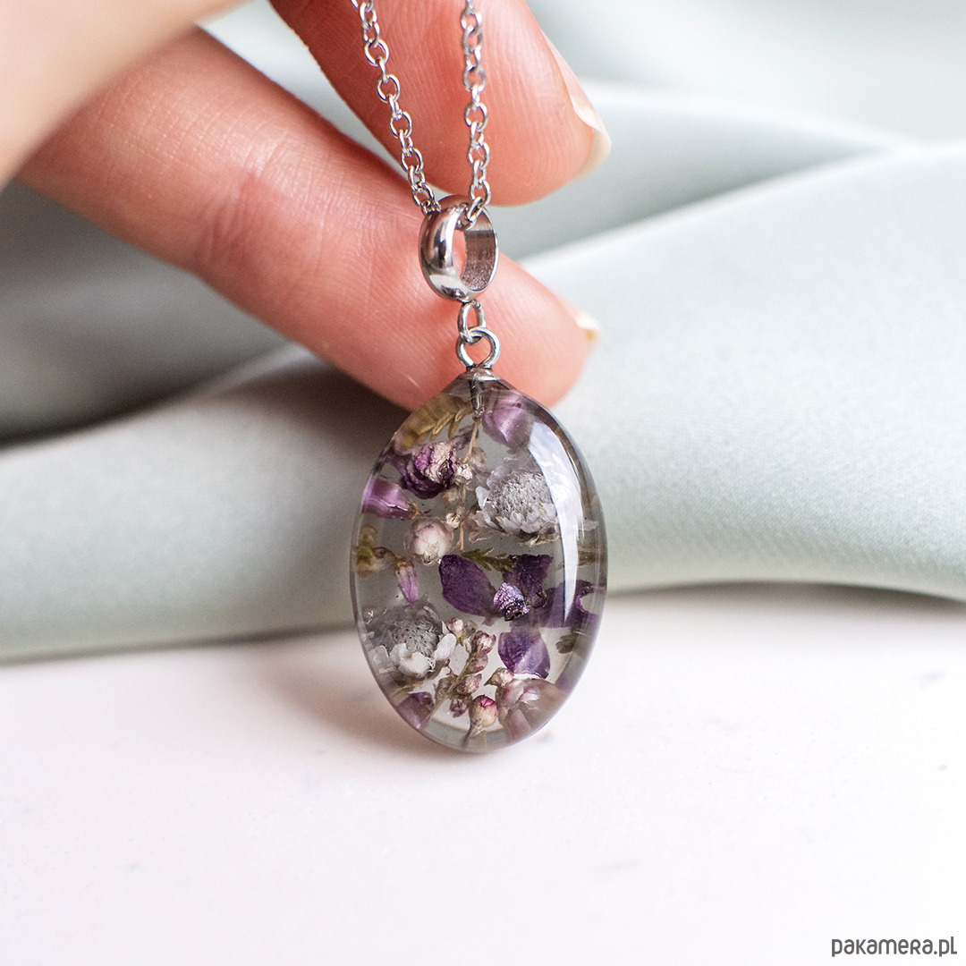 Wisiorek wykonany jest z żywicy epoksydowej z wykorzystaniem suszonych kwiatów. Metalowe elementy to stal nierdzewna szlachetna chirurgiczna.