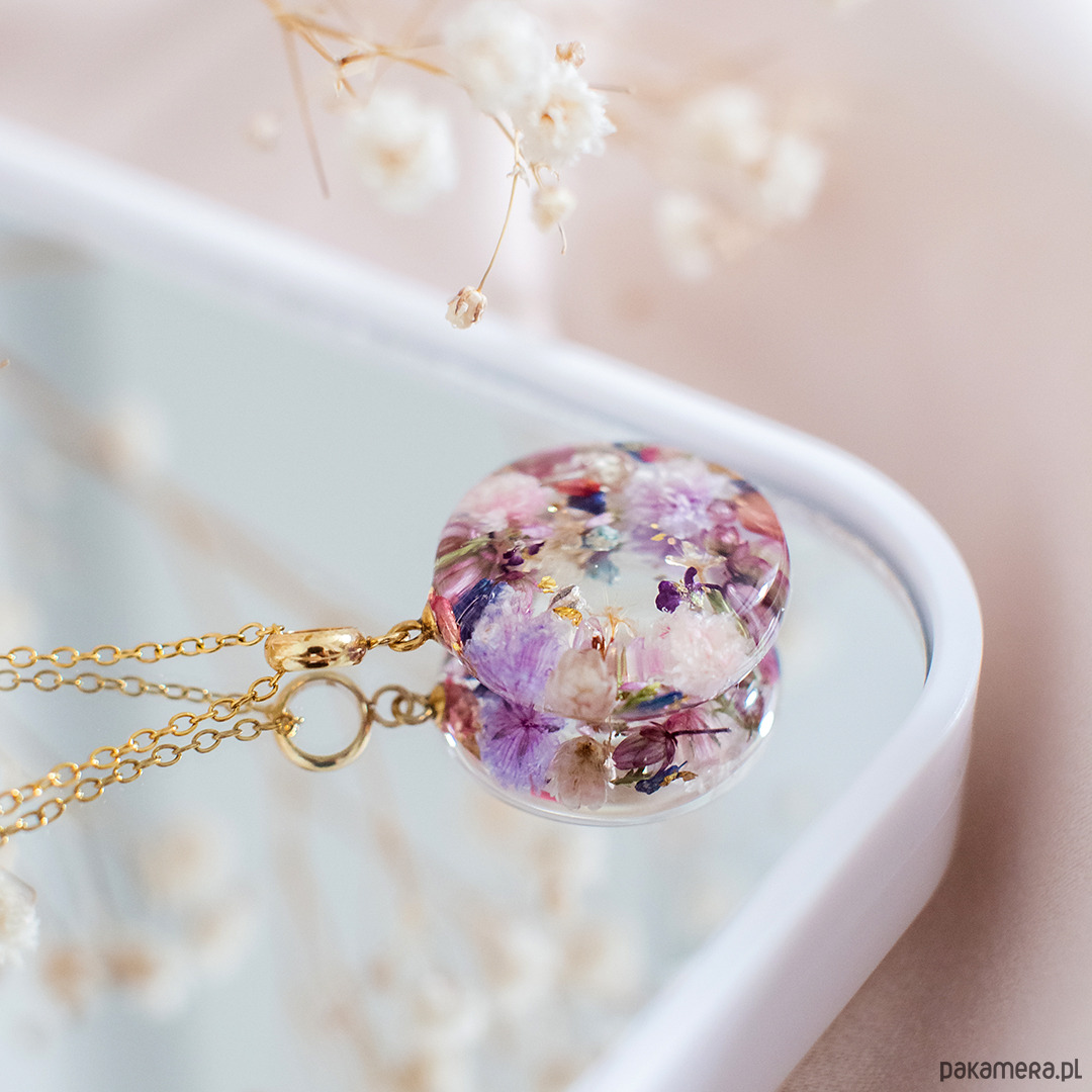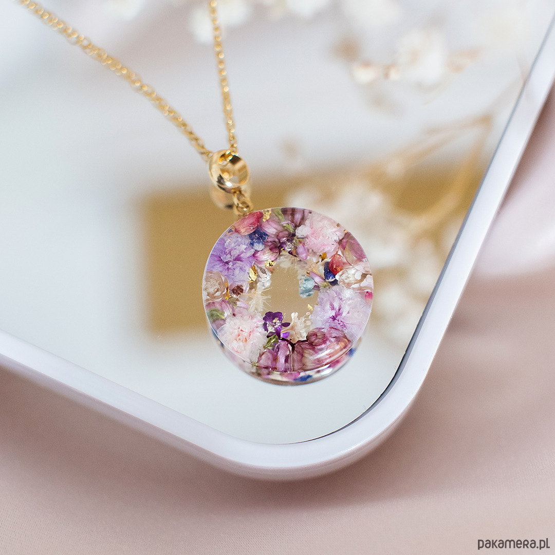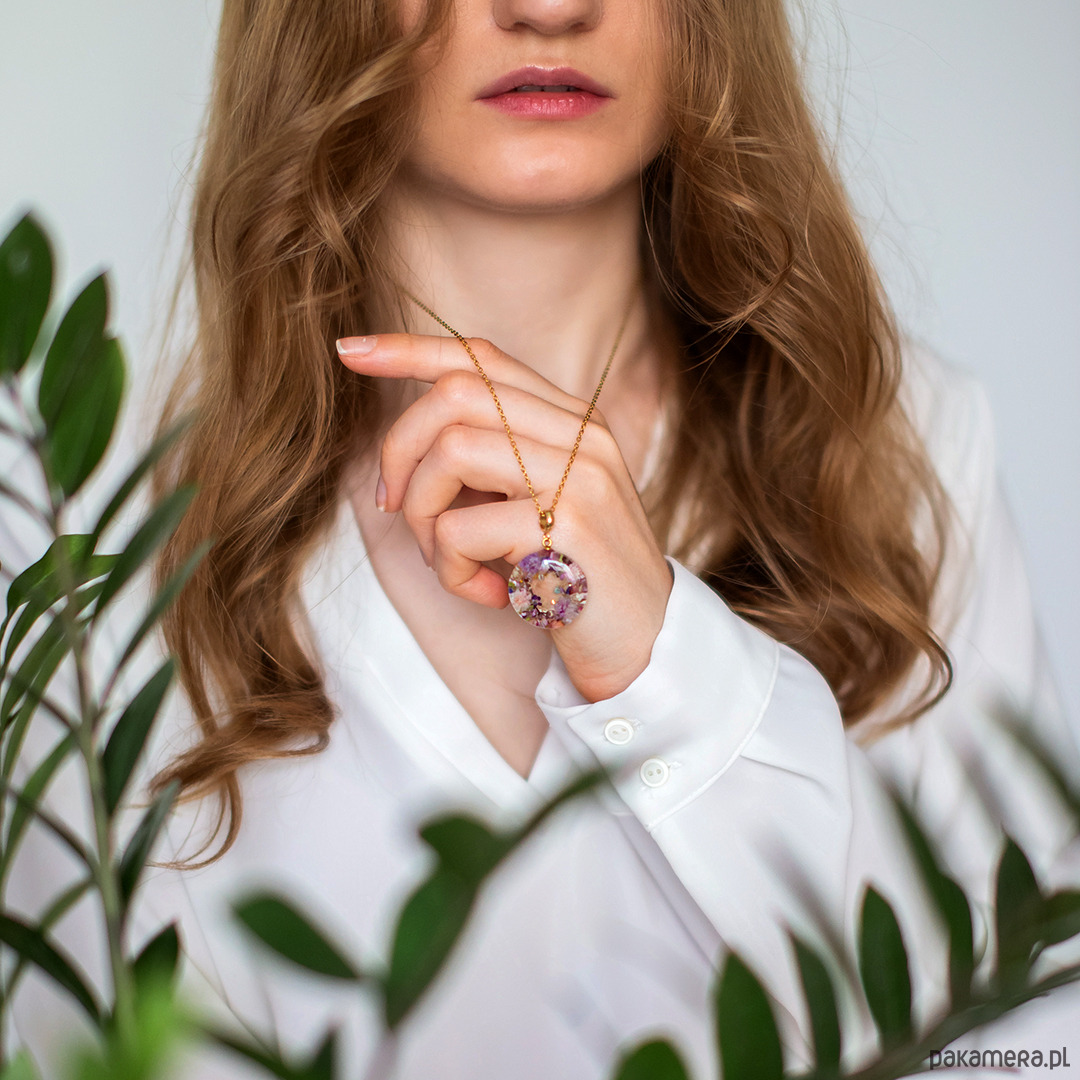 Wisiorek wykonany jest z żywicy epoksydowej z wykorzystaniem suszonych kwiatów. Metalowe elementy to stal nierdzewna szlachetna chirurgiczna.