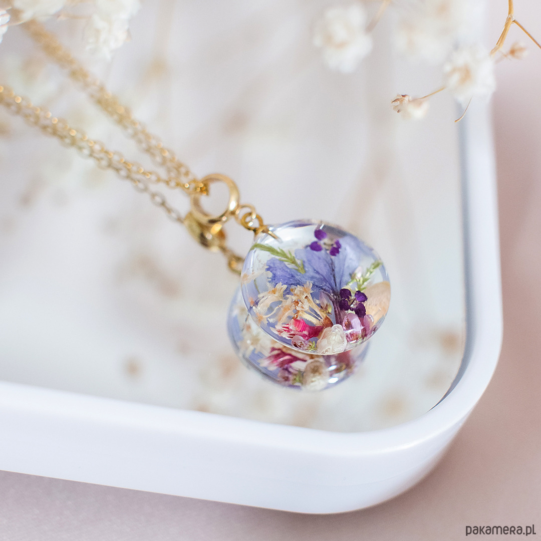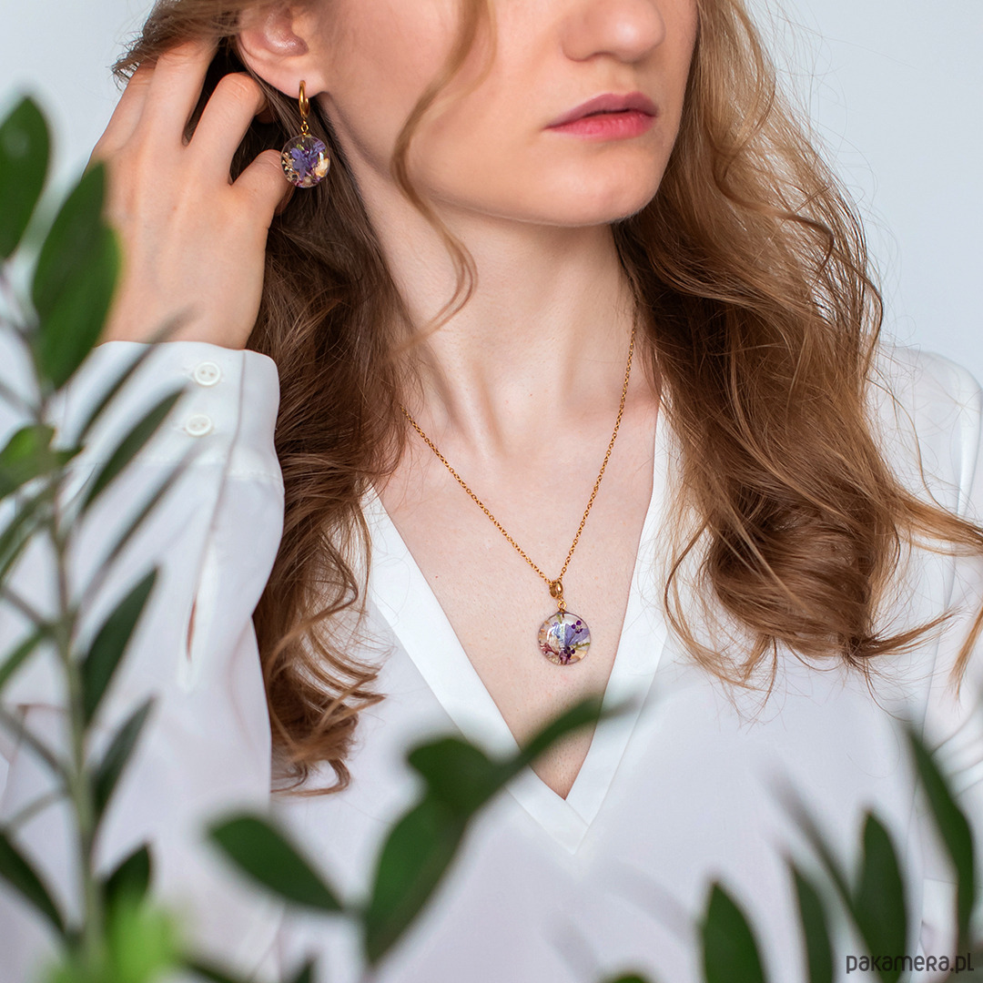 Wisiorek wykonany jest z żywicy epoksydowej z wykorzystaniem suszonych kwiatów. Metalowe elementy to stal nierdzewna szlachetna chirurgiczna.