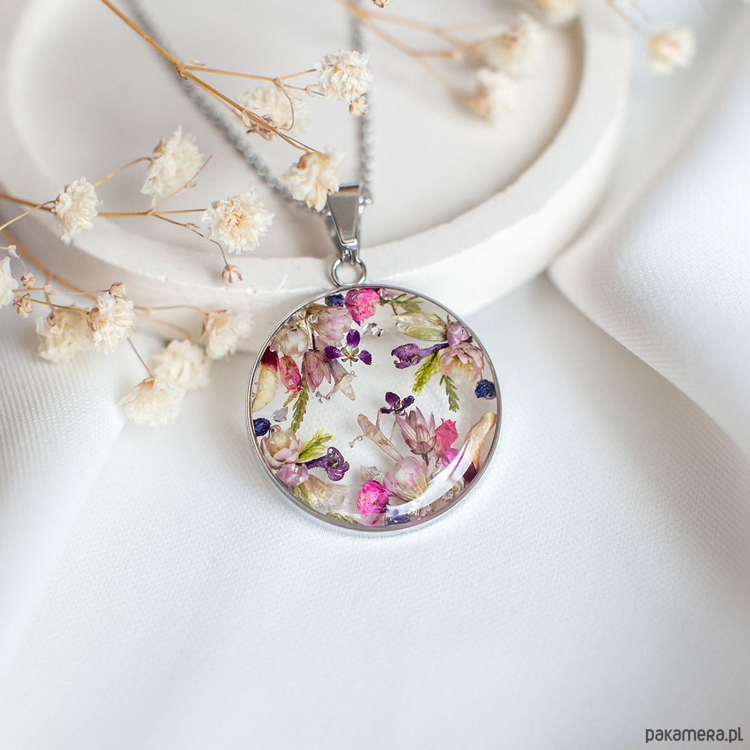 Wisiorek wykonany jest z żywicy epoksydowej z wykorzystaniem suszonych kwiatów. Metalowe elementy to stal nierdzewna szlachetna chirurgiczna.