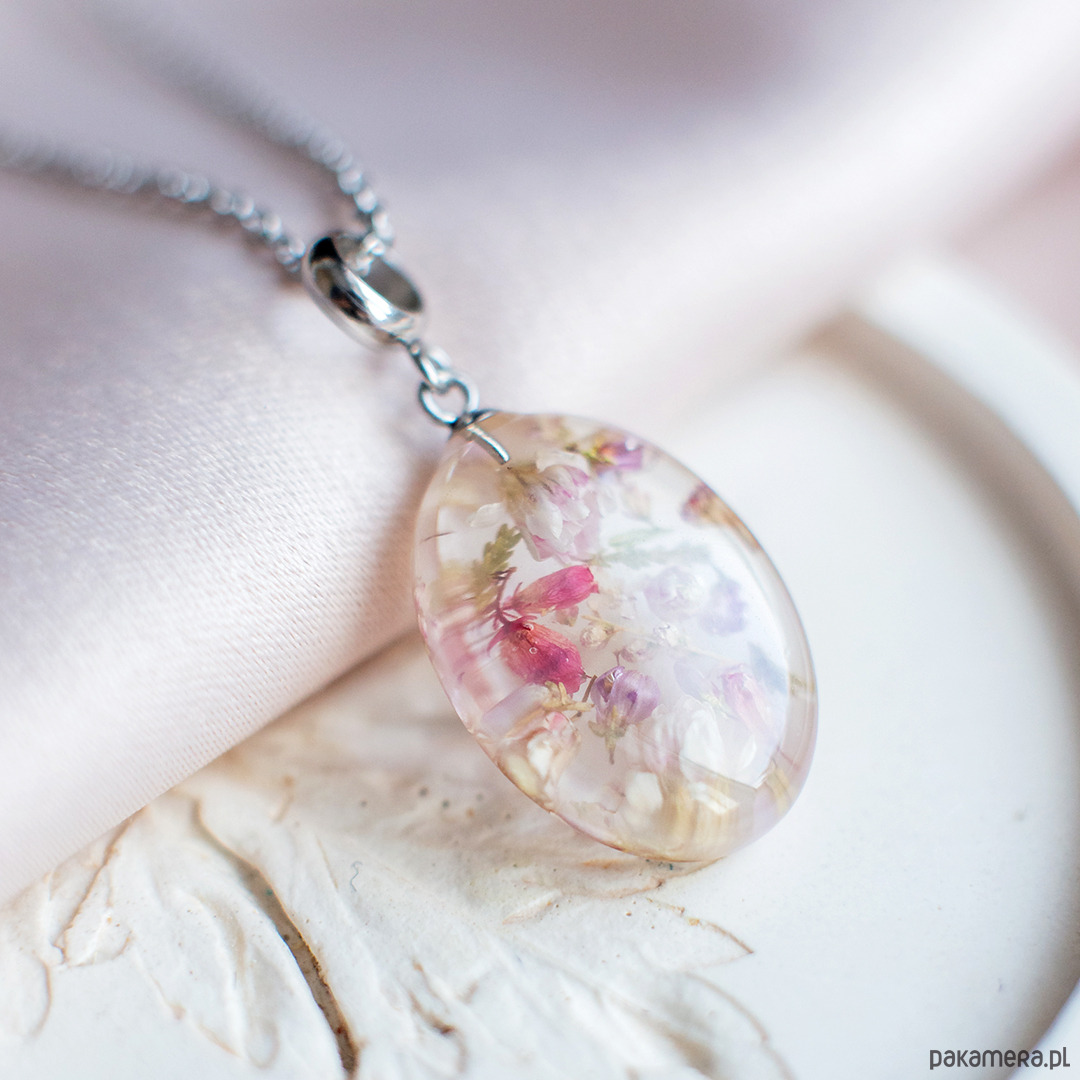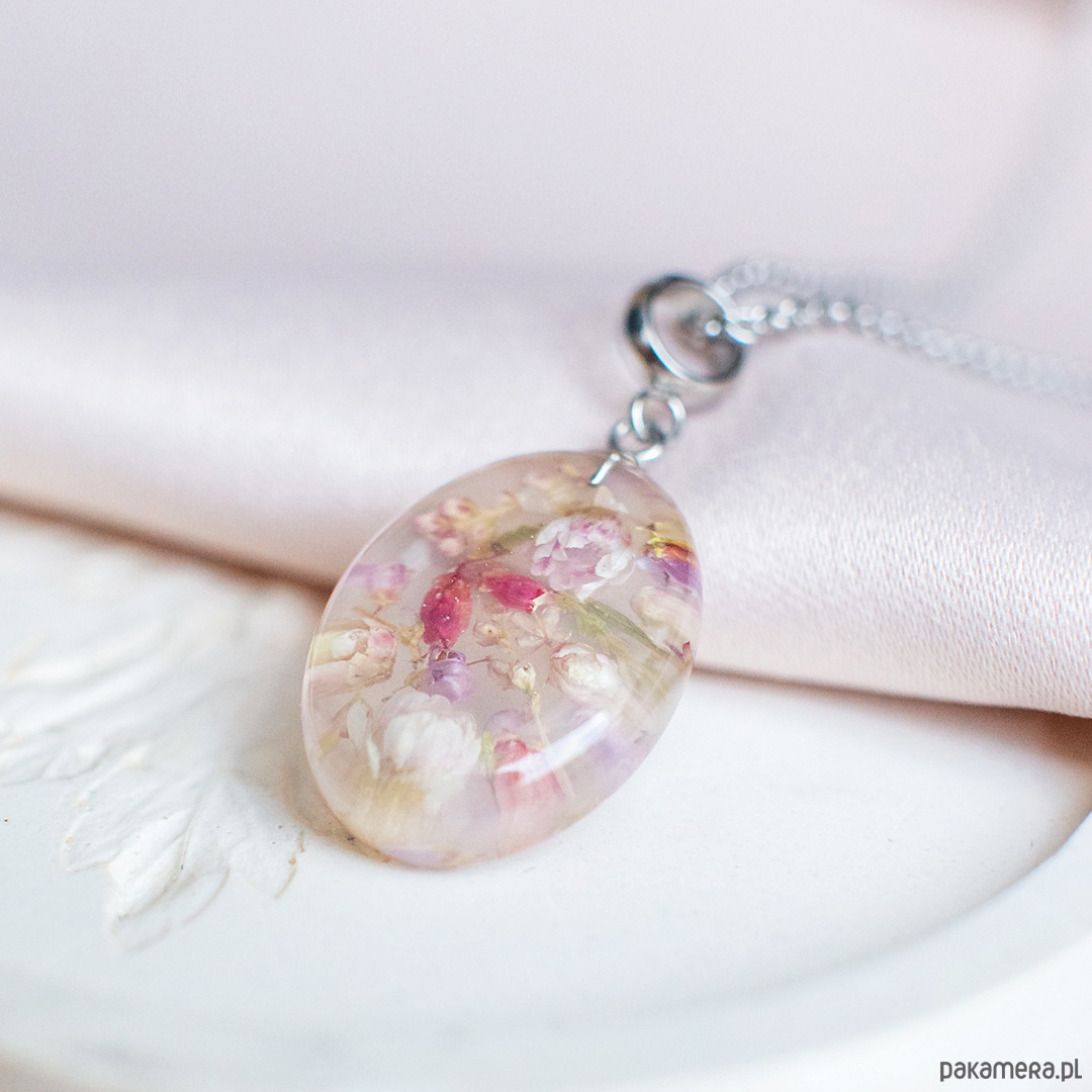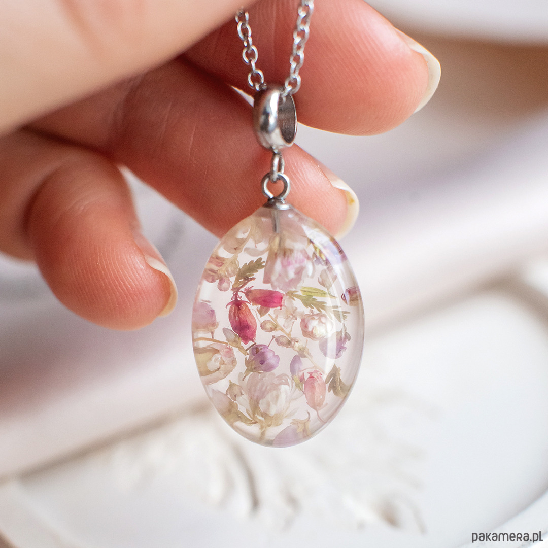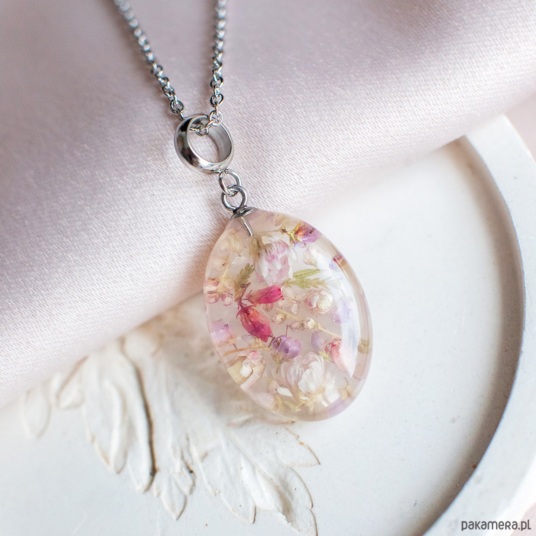 Wisiorek wykonany jest z żywicy epoksydowej z wykorzystaniem suszonych kwiatów. Metalowe elementy to stal nierdzewna szlachetna chirurgiczna.
