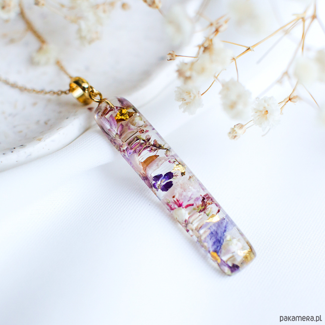 Wisiorek wykonany jest z żywicy epoksydowej z wykorzystaniem suszonych kwiatów. Metalowe elementy to stal nierdzewna szlachetna chirurgiczna.