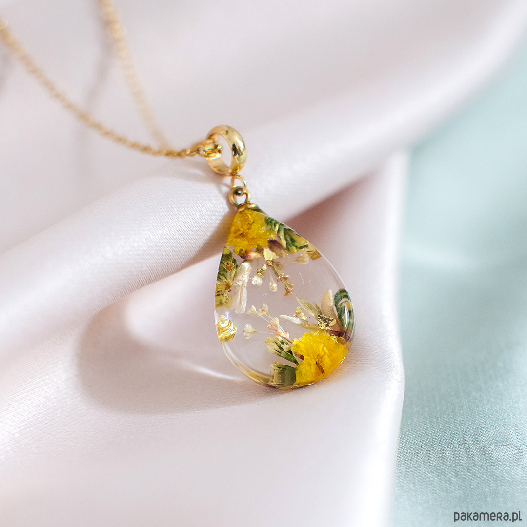 Wisiorek wykonany jest z żywicy epoksydowej z wykorzystaniem suszonych kwiatów. Metalowe elementy to stal nierdzewna szlachetna chirurgiczna.