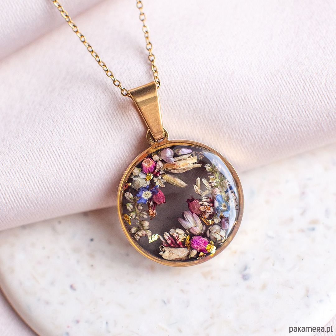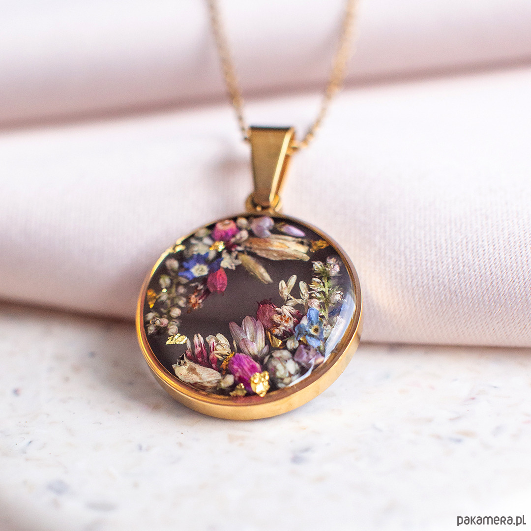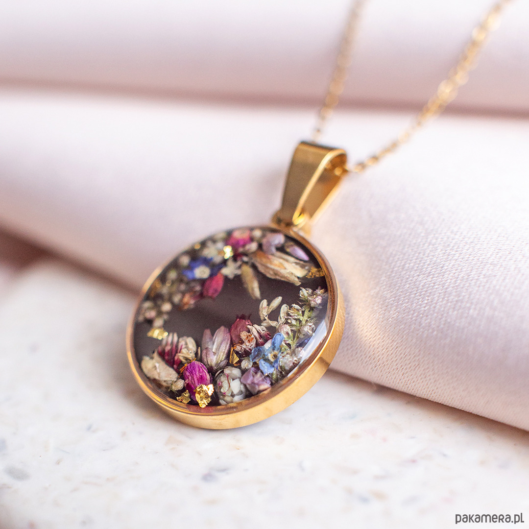 Wisiorek wykonany jest z żywicy epoksydowej z wykorzystaniem suszonych kwiatów. Metalowe elementy to stal nierdzewna szlachetna chirurgiczna.
