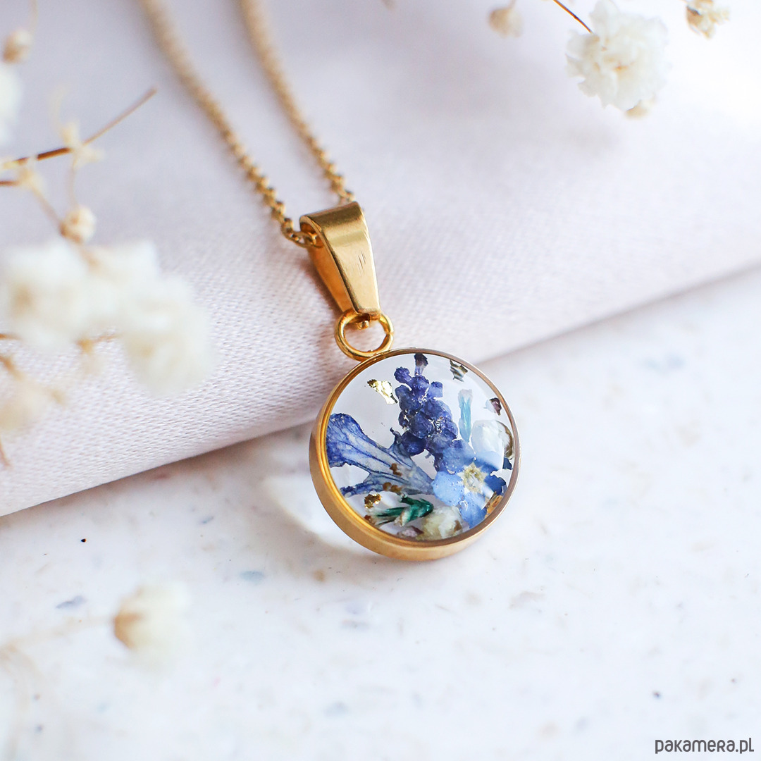 Wisiorek wykonany jest z żywicy epoksydowej z wykorzystaniem suszonych kwiatów. Metalowe elementy to stal nierdzewna szlachetna chirurgiczna.