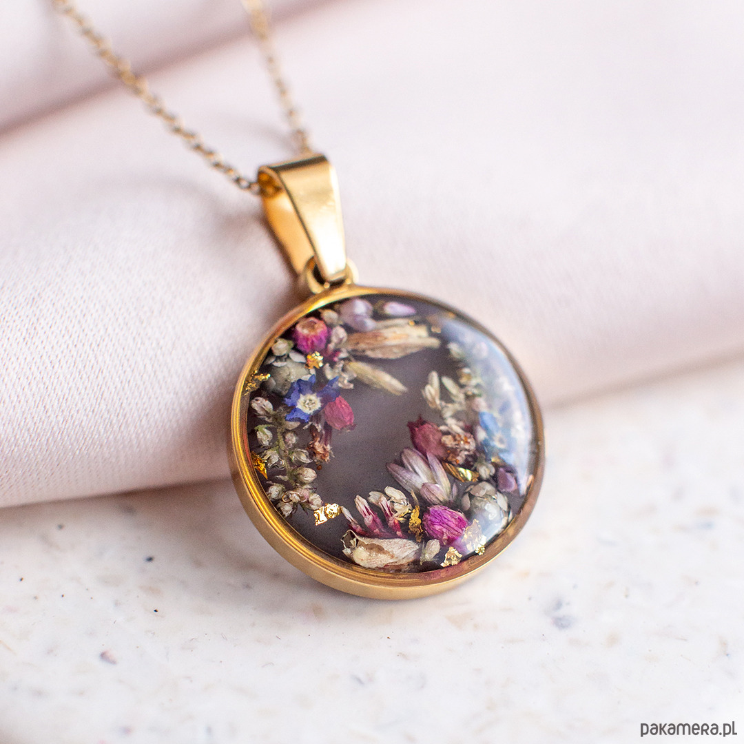 Wisiorek wykonany jest z żywicy epoksydowej z wykorzystaniem suszonych kwiatów. Metalowe elementy to stal nierdzewna szlachetna chirurgiczna.