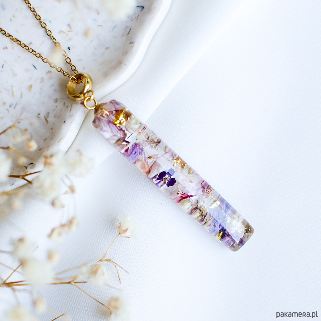 Wisiorek wykonany jest z żywicy epoksydowej z wykorzystaniem suszonych kwiatów. Metalowe elementy to stal nierdzewna szlachetna chirurgiczna.