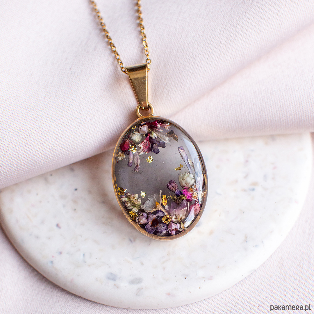 Wisiorek wykonany jest z żywicy epoksydowej z wykorzystaniem suszonych kwiatów. Metalowe elementy to stal nierdzewna szlachetna chirurgiczna.