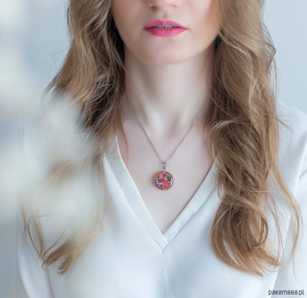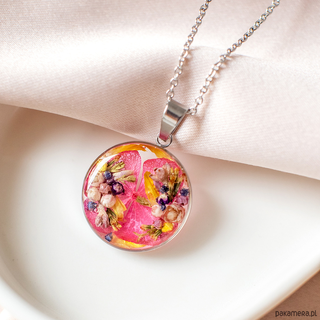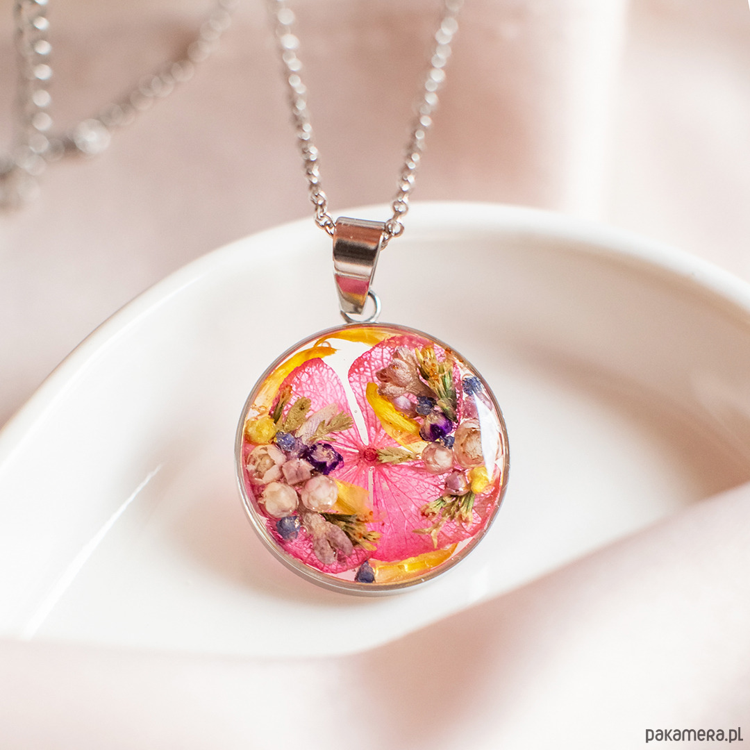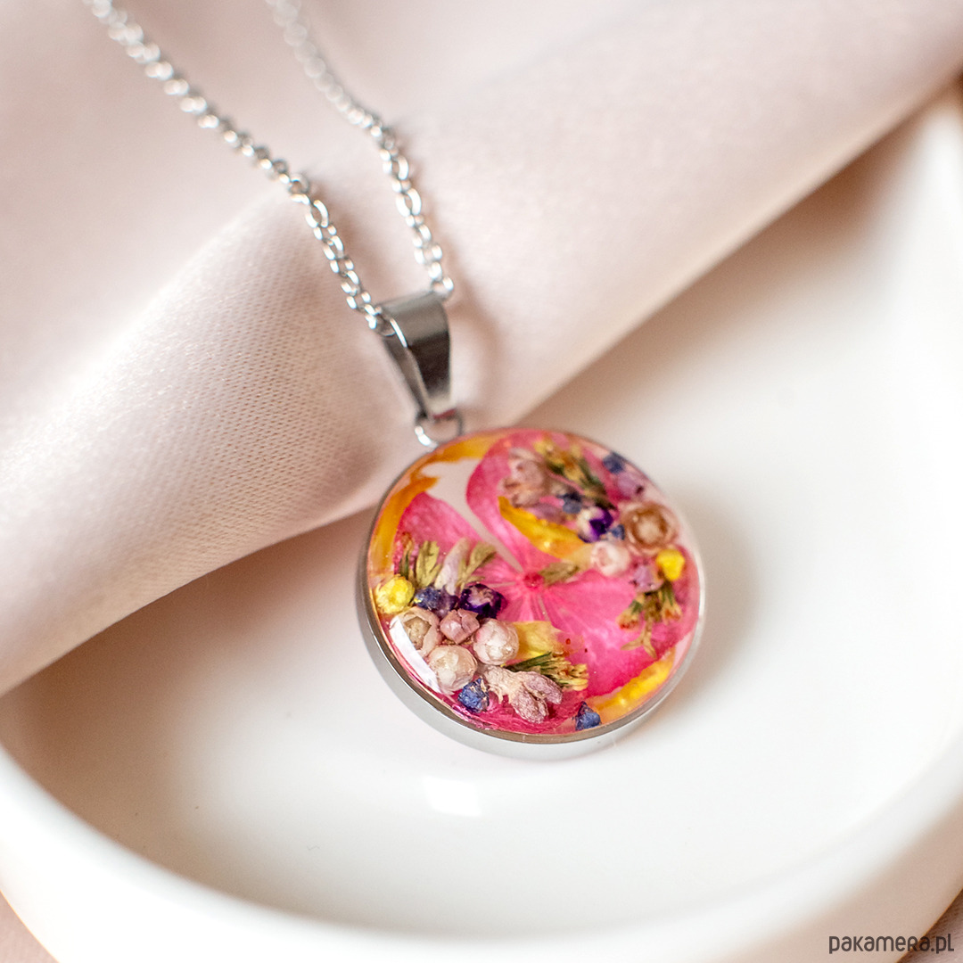 Wisiorek wykonany jest z żywicy epoksydowej z wykorzystaniem suszonych kwiatów. Metalowe elementy to stal nierdzewna szlachetna chirurgiczna.