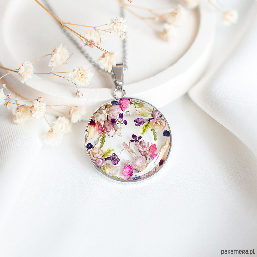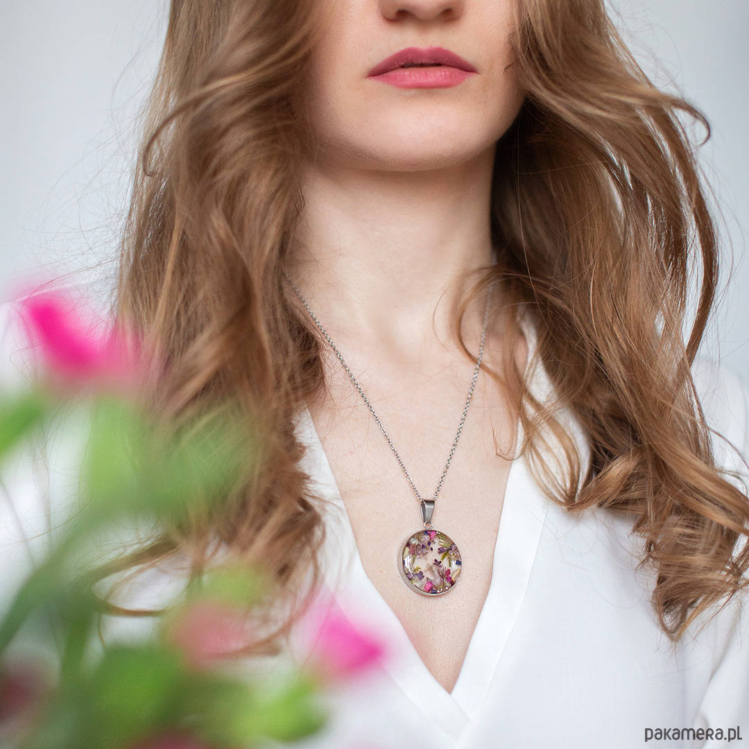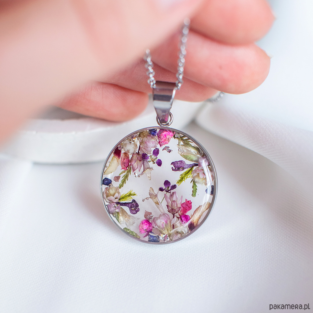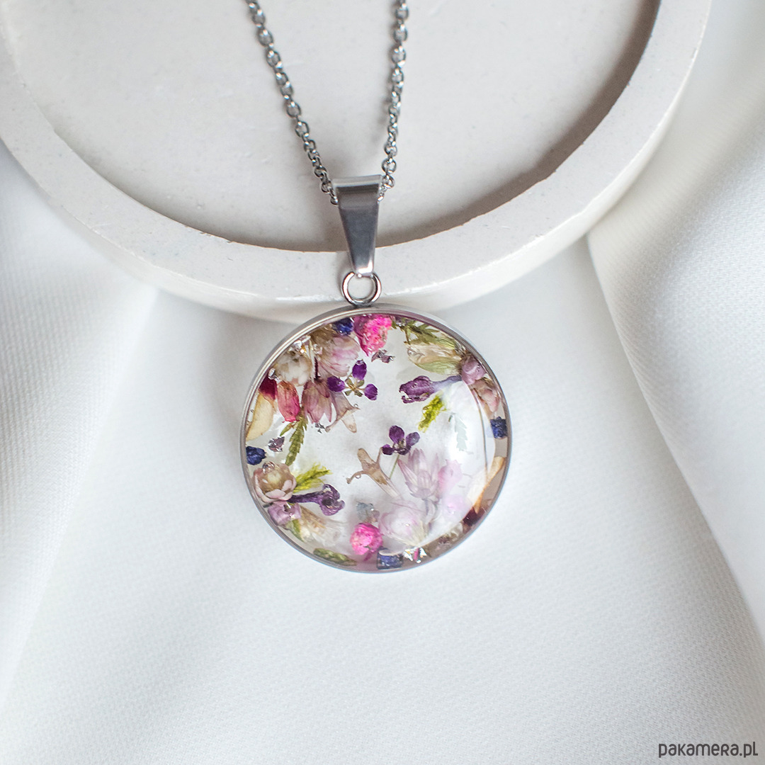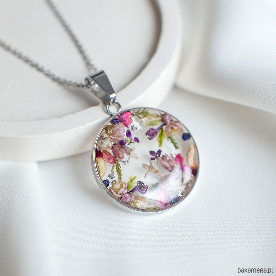 Wisiorek wykonany jest z żywicy epoksydowej z wykorzystaniem suszonych kwiatów. Metalowe elementy to stal nierdzewna szlachetna chirurgiczna.