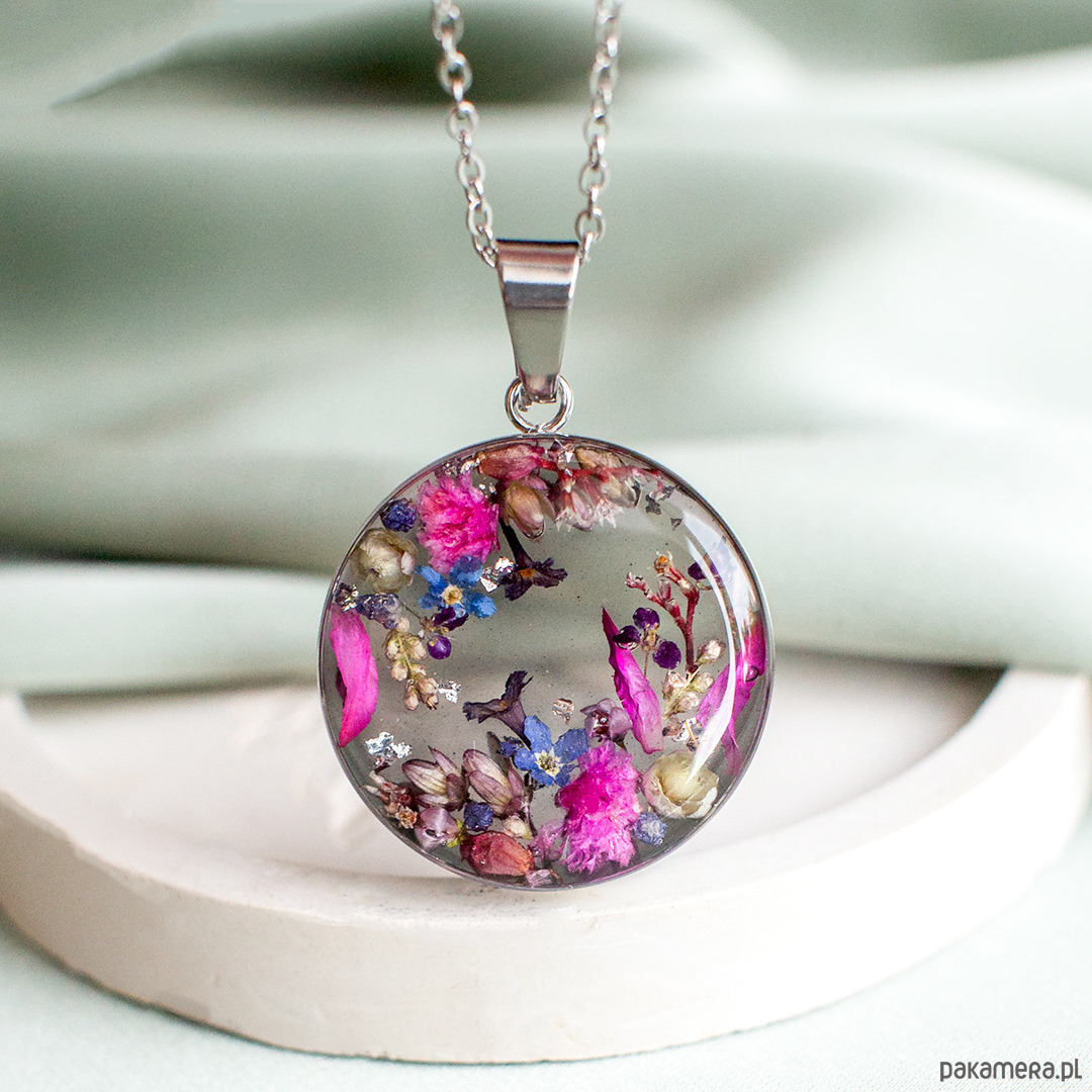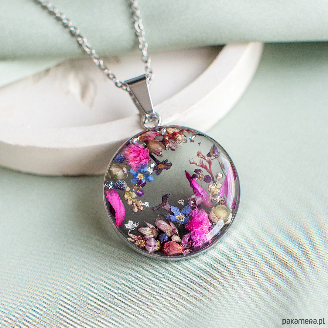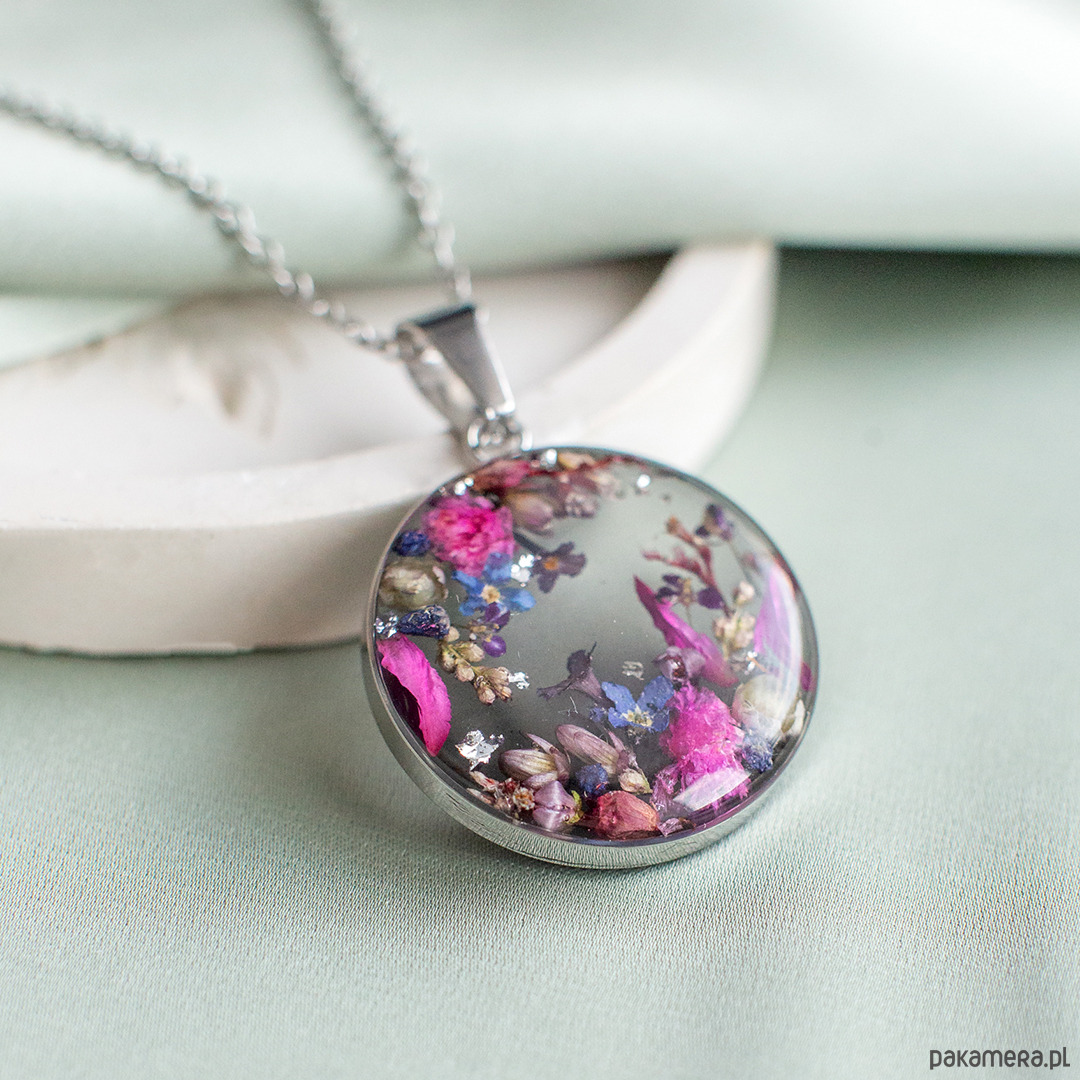 Wisiorek wykonany jest z żywicy epoksydowej z wykorzystaniem suszonych kwiatów. Metalowe elementy to stal nierdzewna szlachetna chirurgiczna.