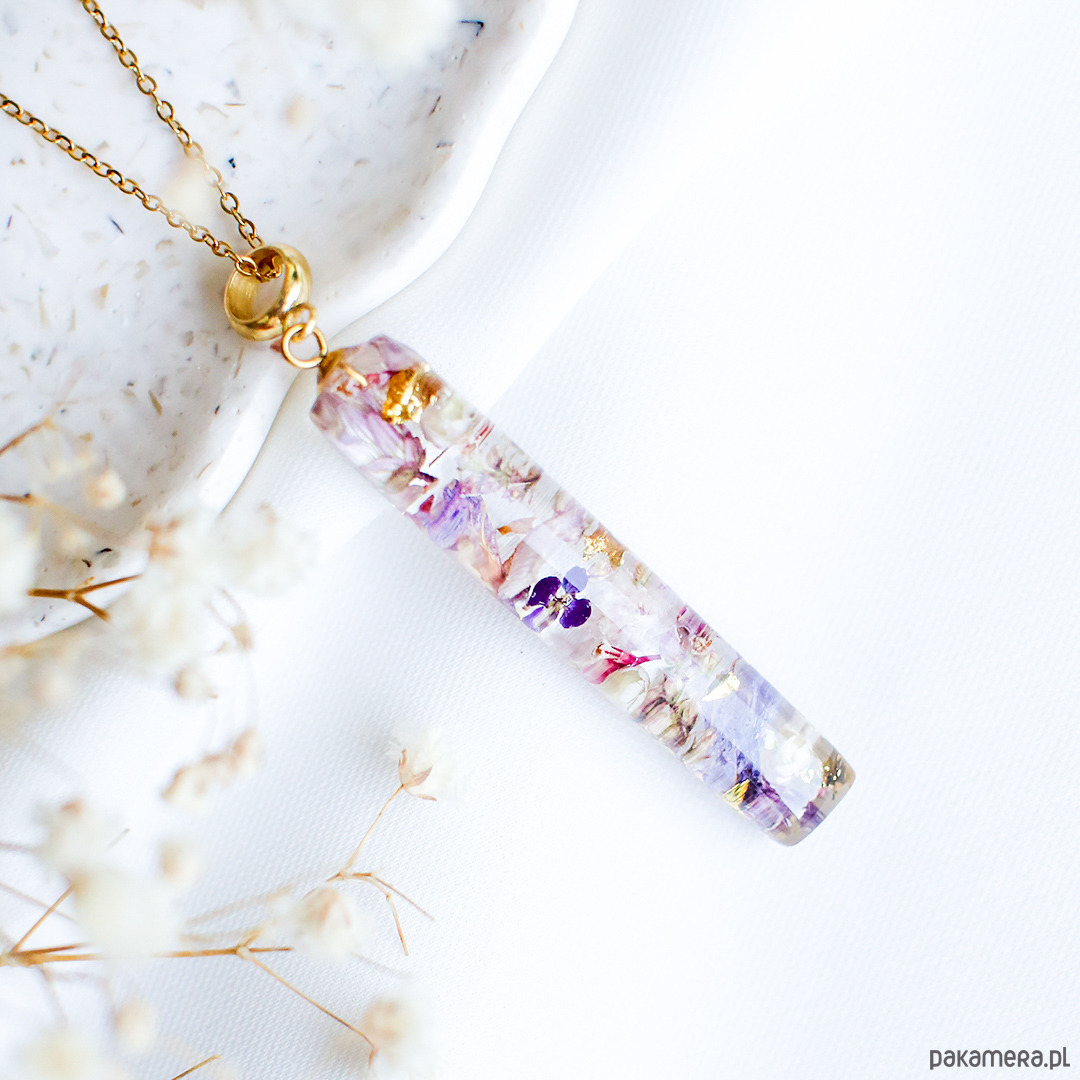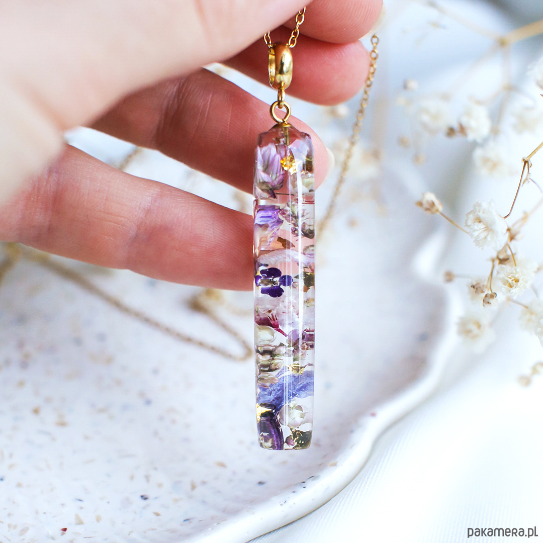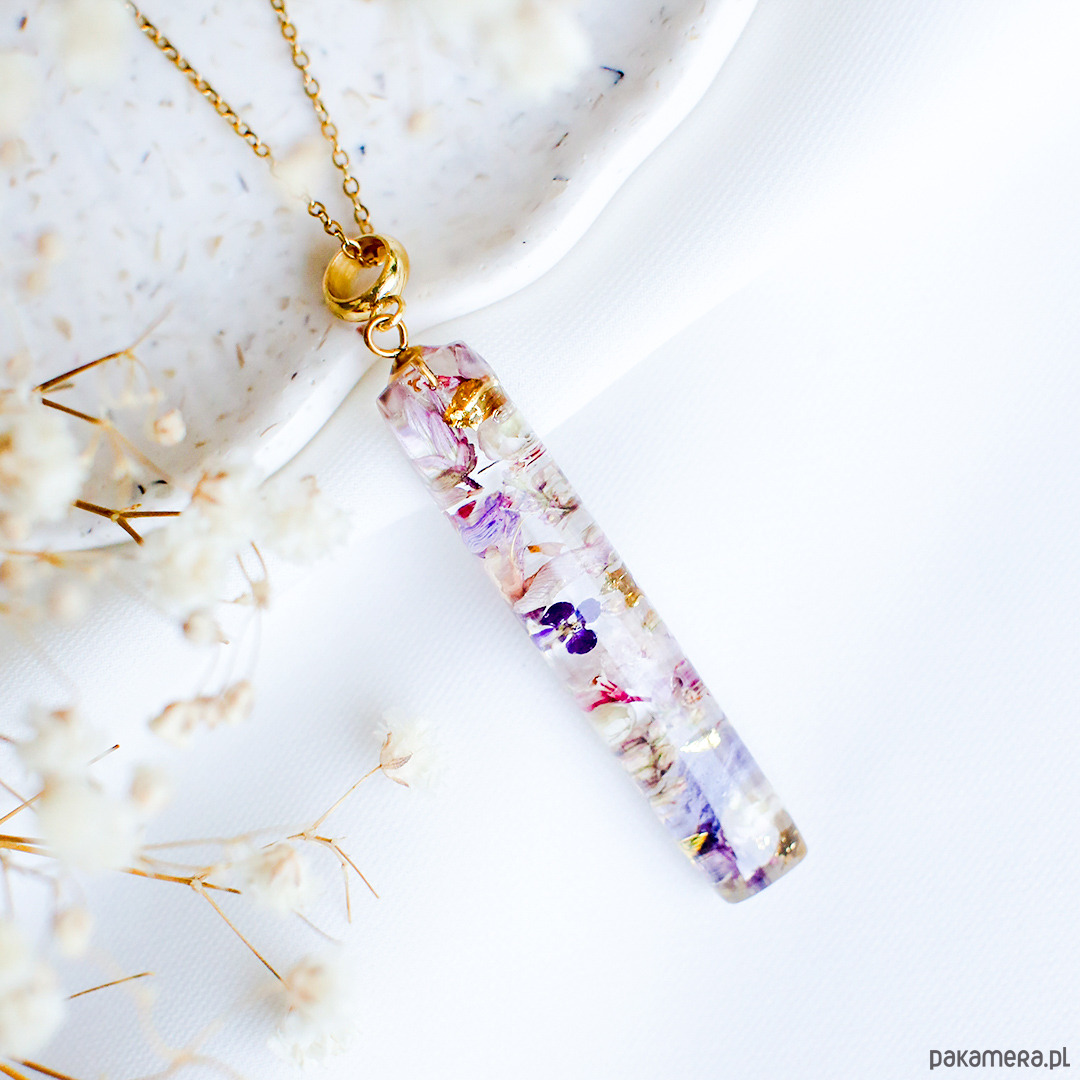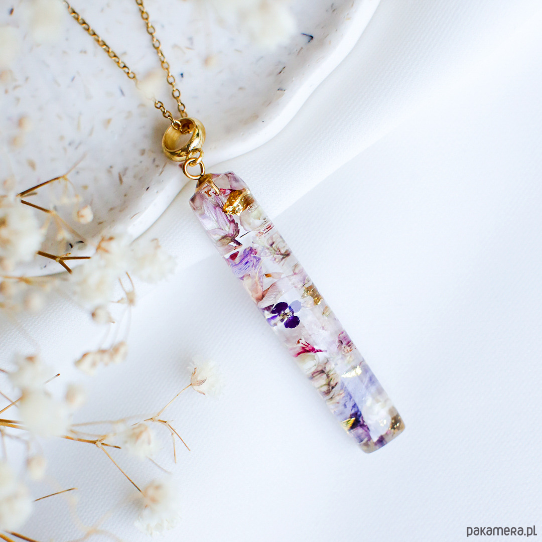 Wisiorek wykonany jest z żywicy epoksydowej z wykorzystaniem suszonych kwiatów. Metalowe elementy to stal nierdzewna szlachetna chirurgiczna.