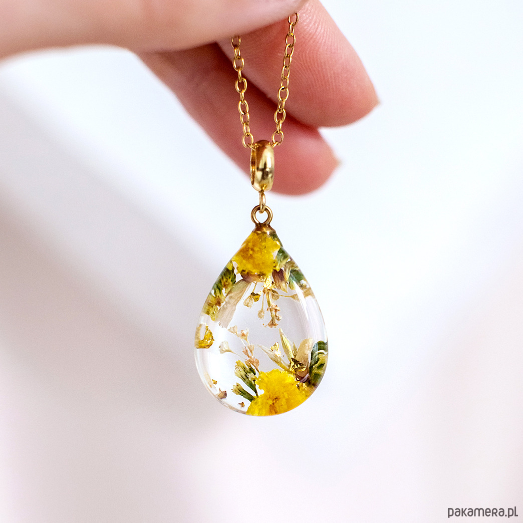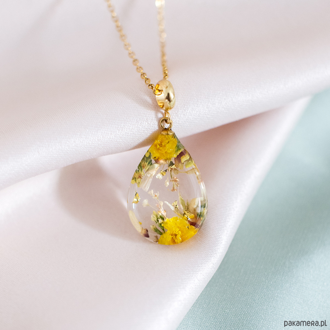 Wisiorek wykonany jest z żywicy epoksydowej z wykorzystaniem suszonych kwiatów. Metalowe elementy to stal nierdzewna szlachetna chirurgiczna.