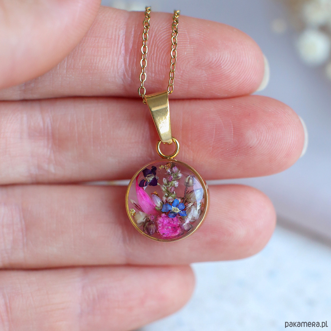 Wisiorek wykonany jest z żywicy epoksydowej z wykorzystaniem suszonych kwiatów. Metalowe elementy to stal nierdzewna szlachetna chirurgiczna.