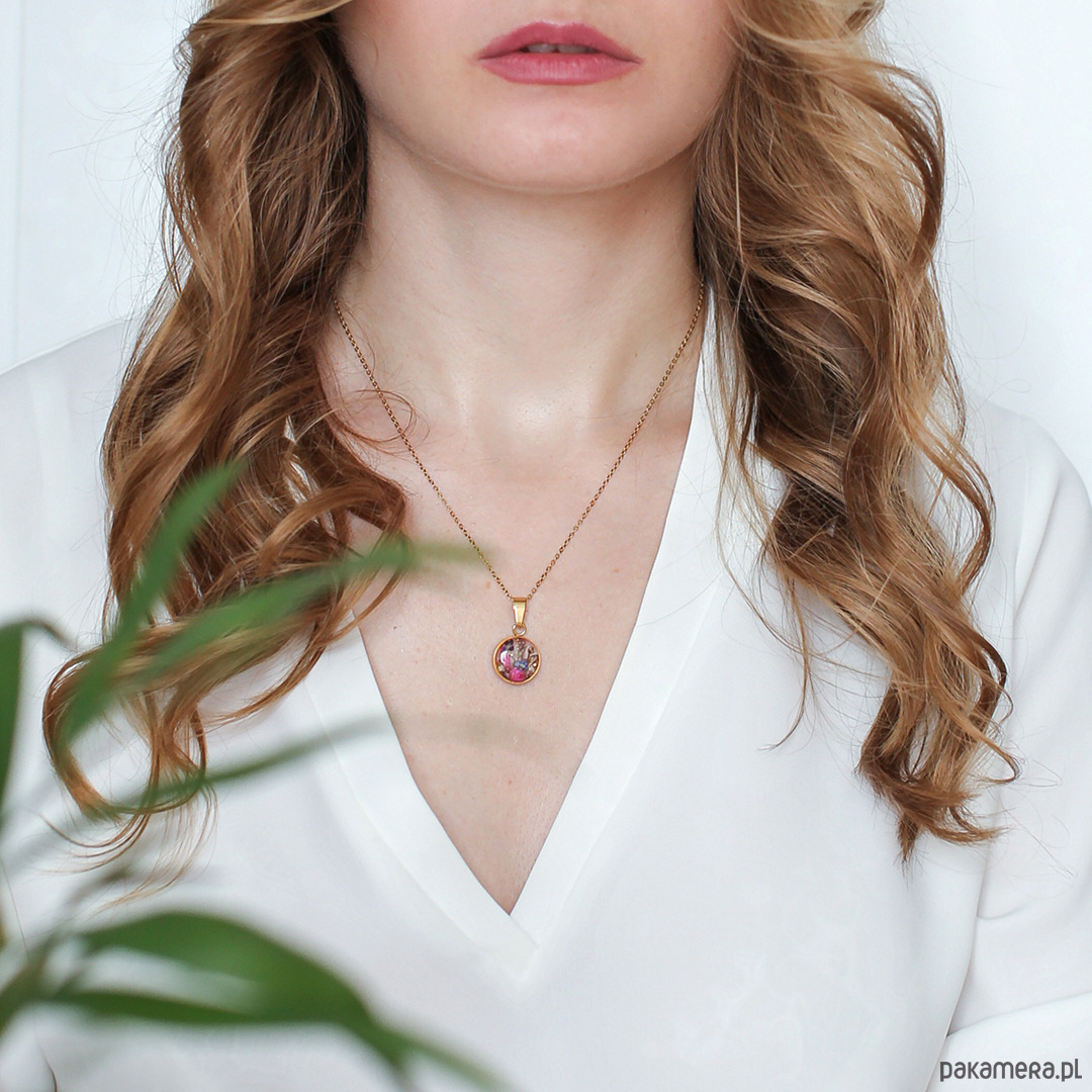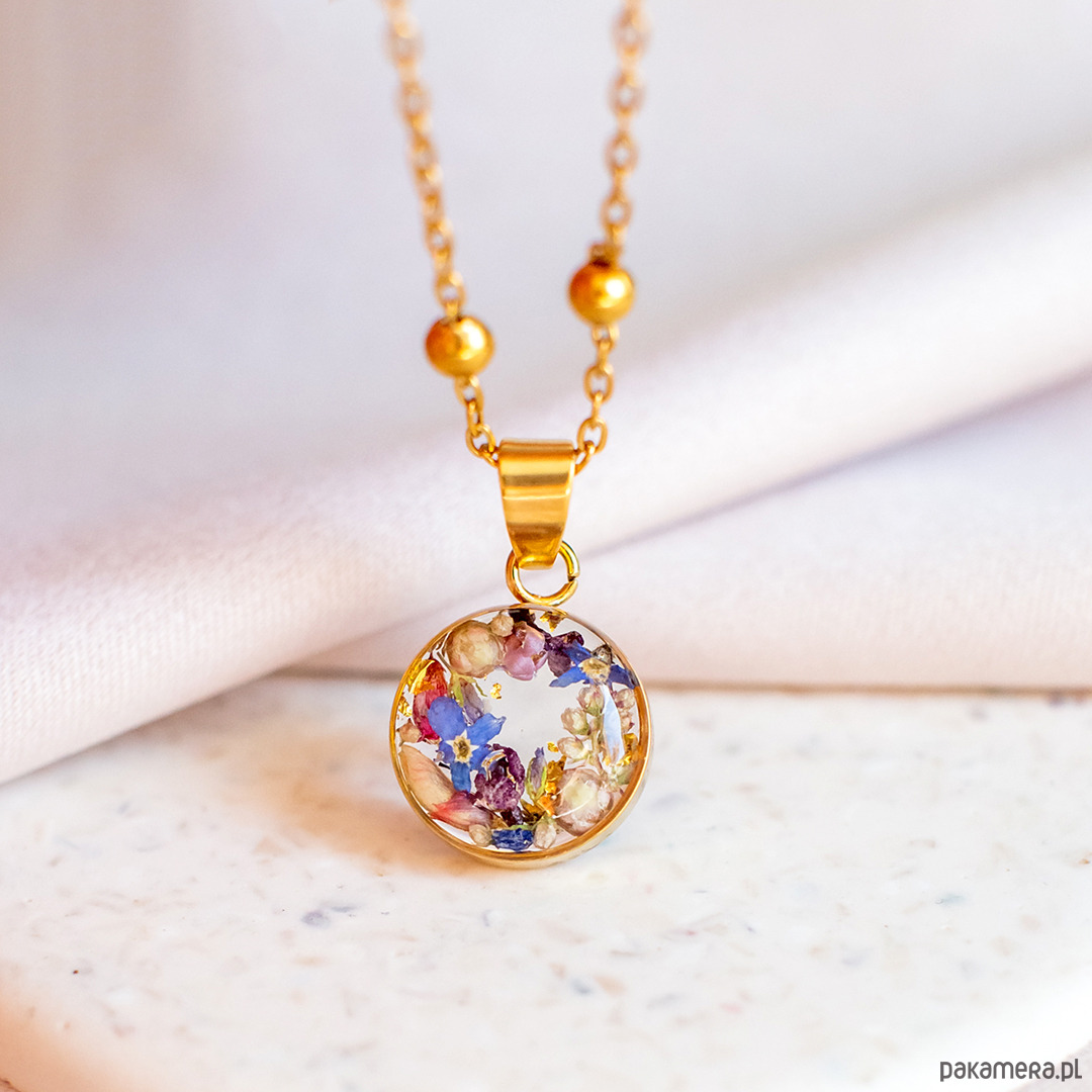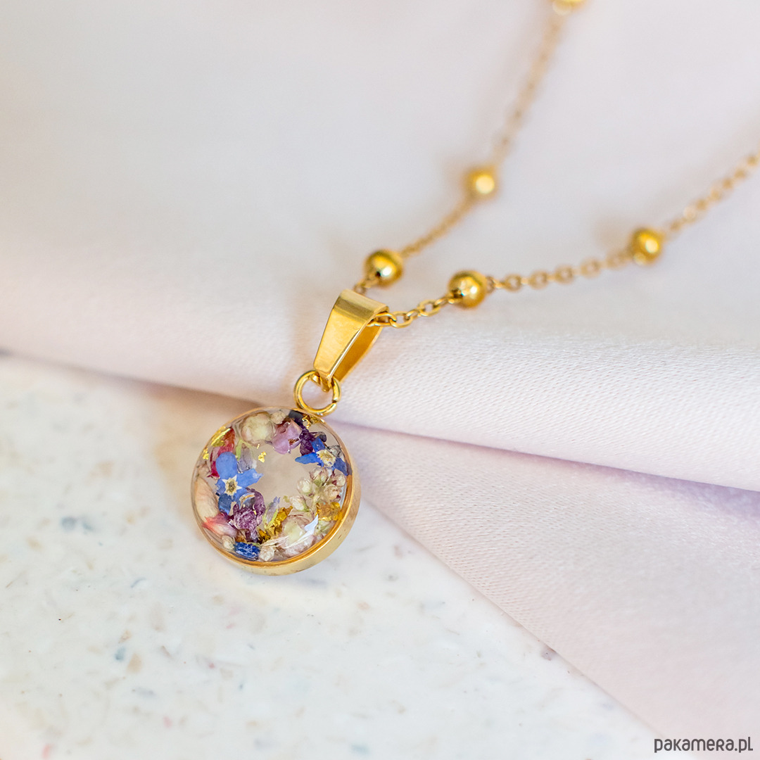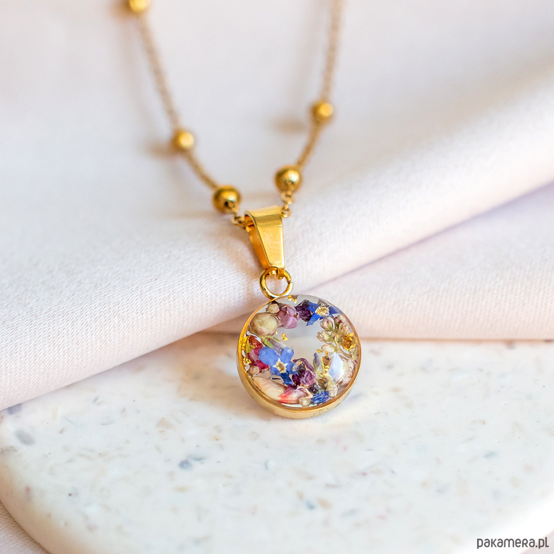 Wisiorek wykonany jest z żywicy epoksydowej z wykorzystaniem suszonych kwiatów. Metalowe elementy to stal nierdzewna szlachetna chirurgiczna.