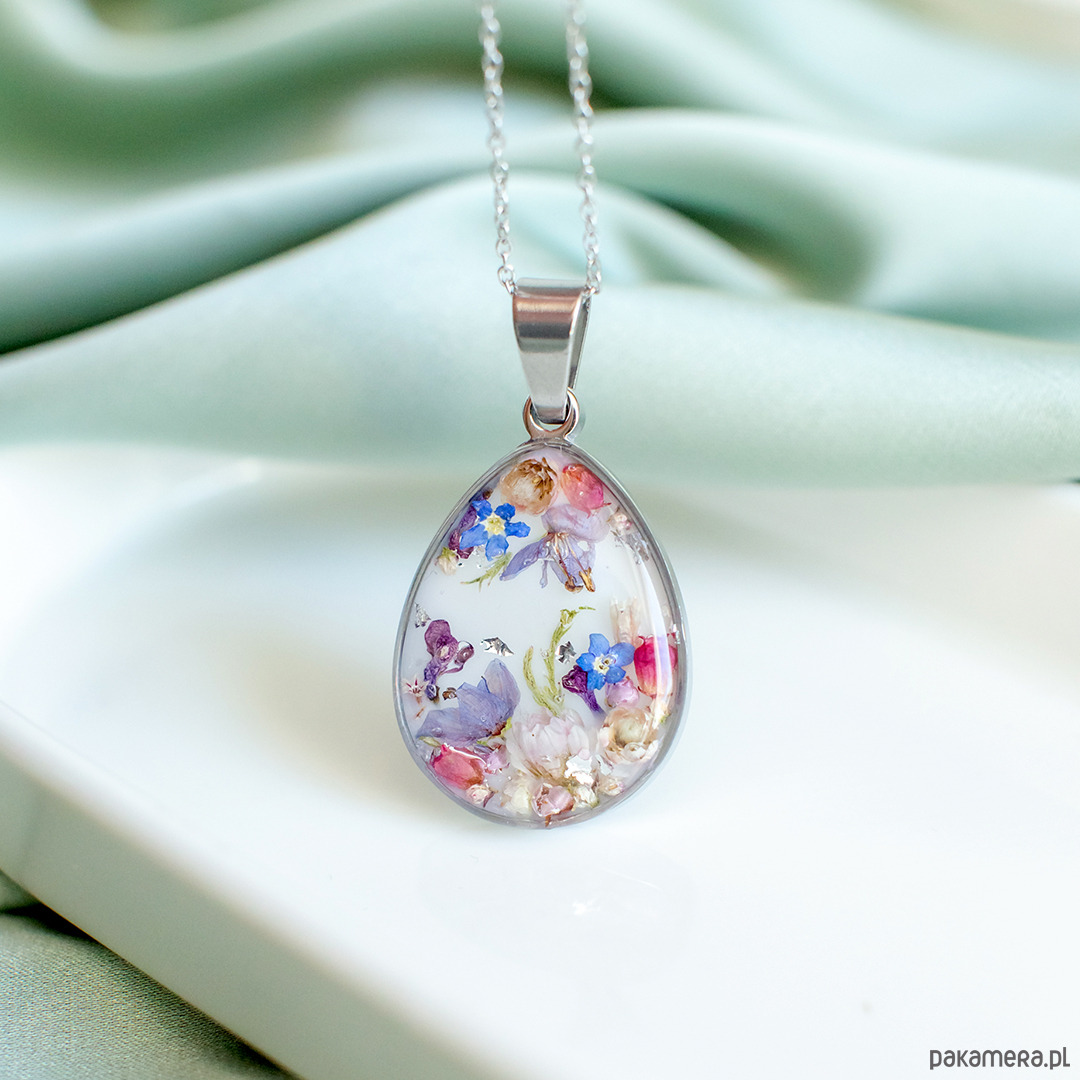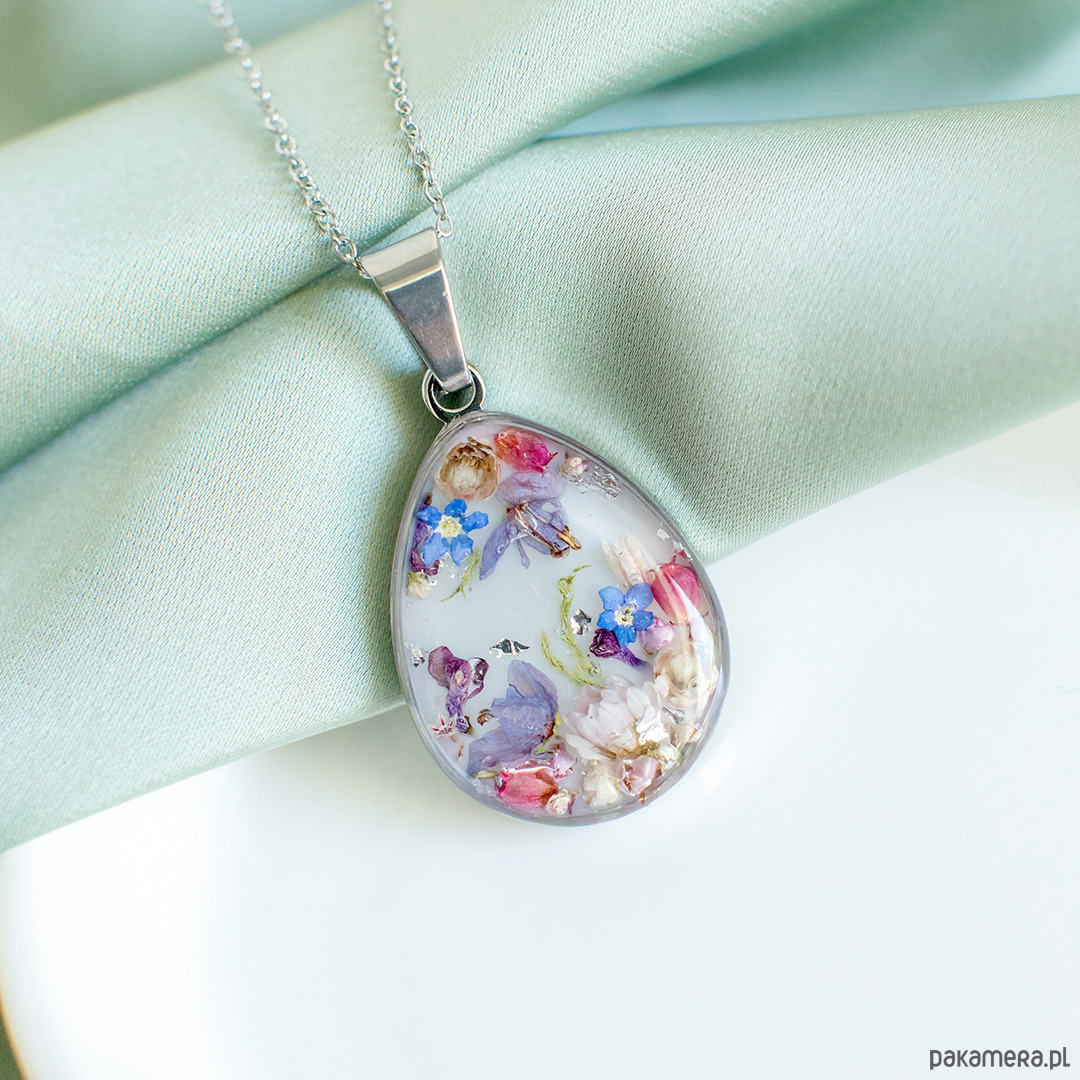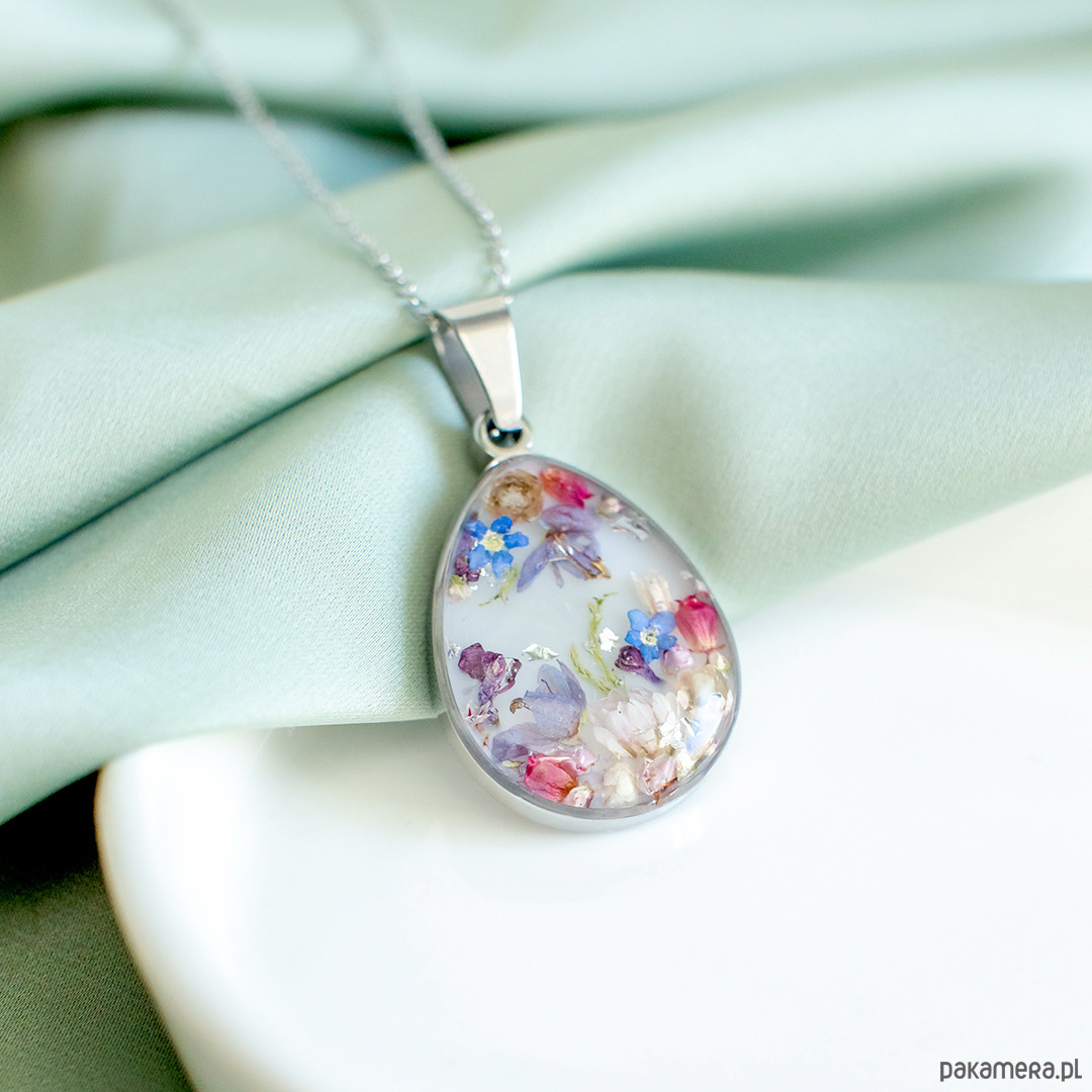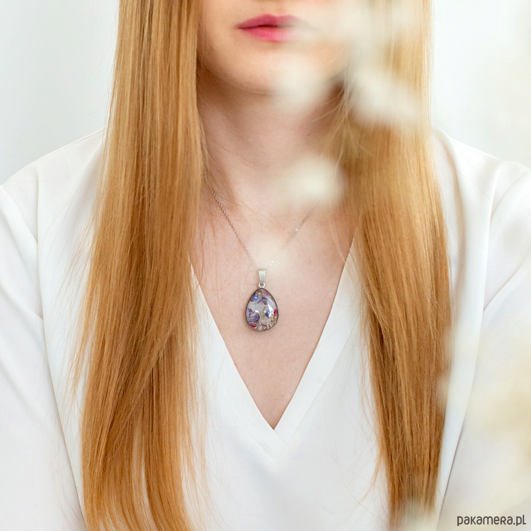 Wisiorek wykonany jest z żywicy epoksydowej z wykorzystaniem suszonych kwiatów. Metalowe elementy to stal nierdzewna szlachetna chirurgiczna.