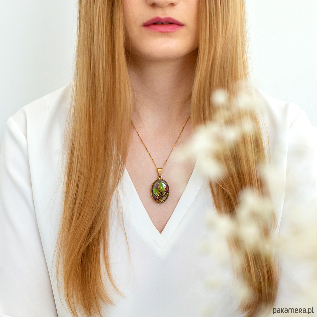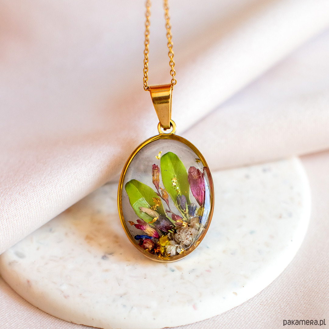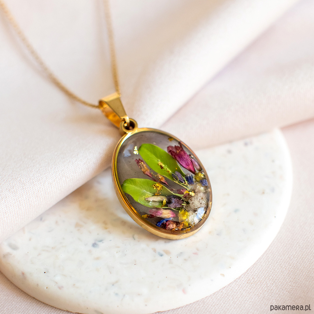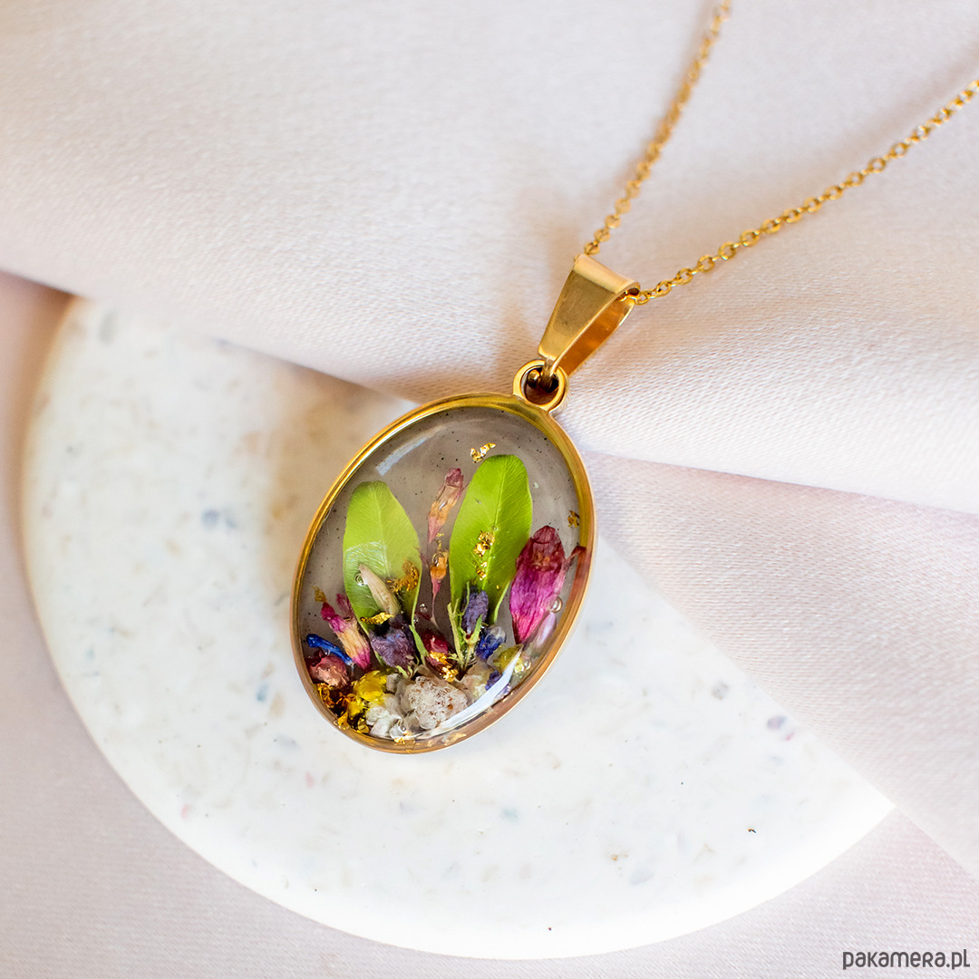 Wisiorek wykonany jest z żywicy epoksydowej z wykorzystaniem suszonych kwiatów. Metalowe elementy to stal nierdzewna szlachetna chirurgiczna.