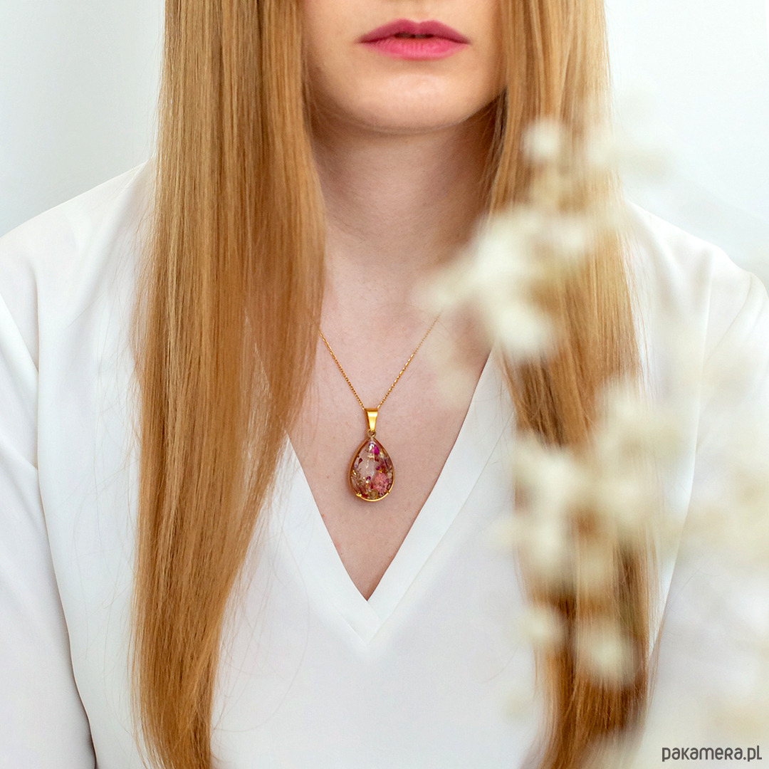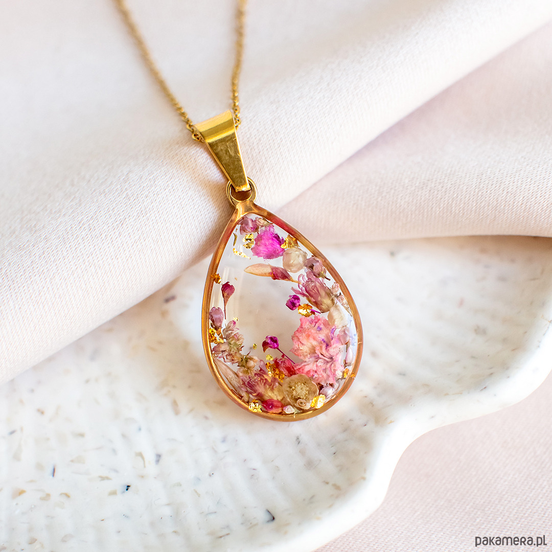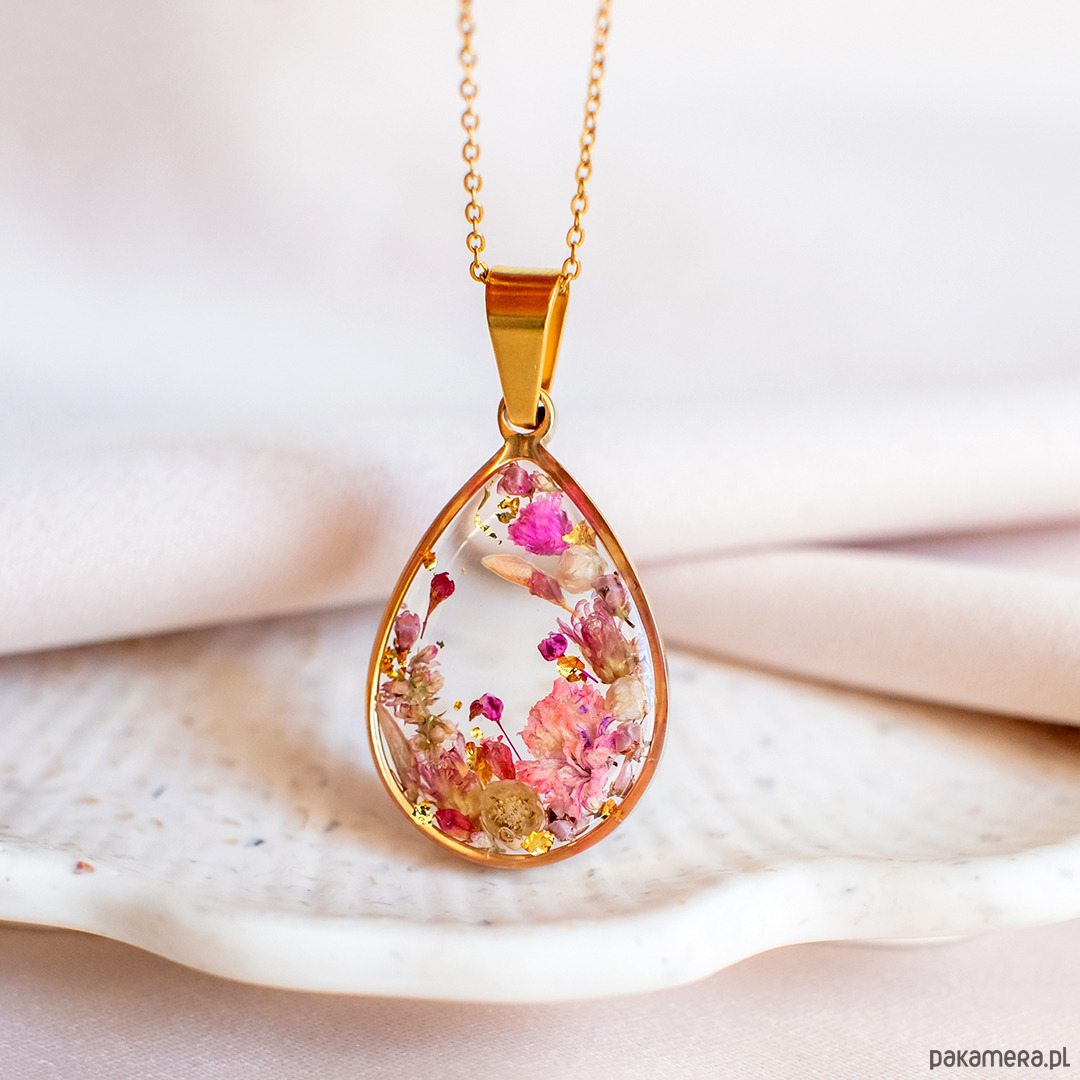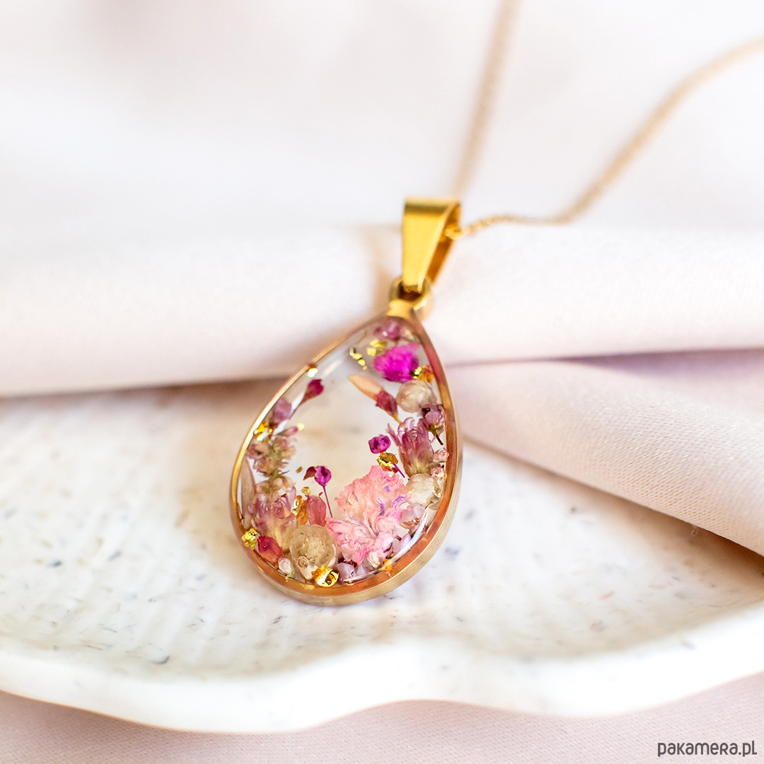 Wisiorek wykonany jest z żywicy epoksydowej z wykorzystaniem suszonych kwiatów. Metalowe elementy to stal nierdzewna szlachetna chirurgiczna.