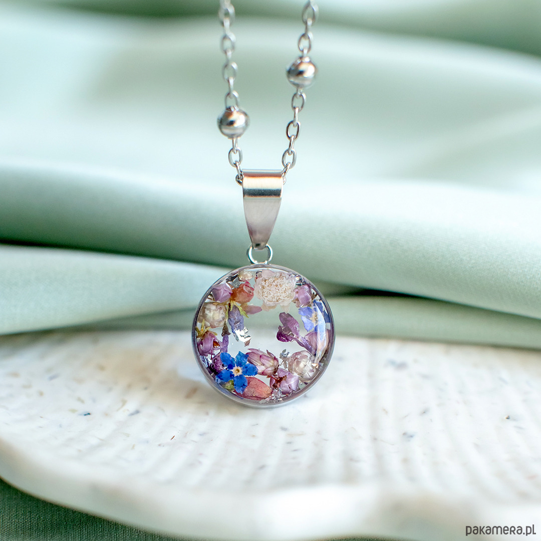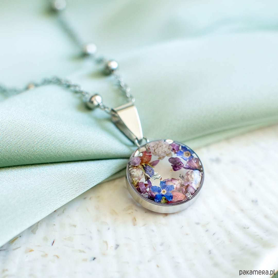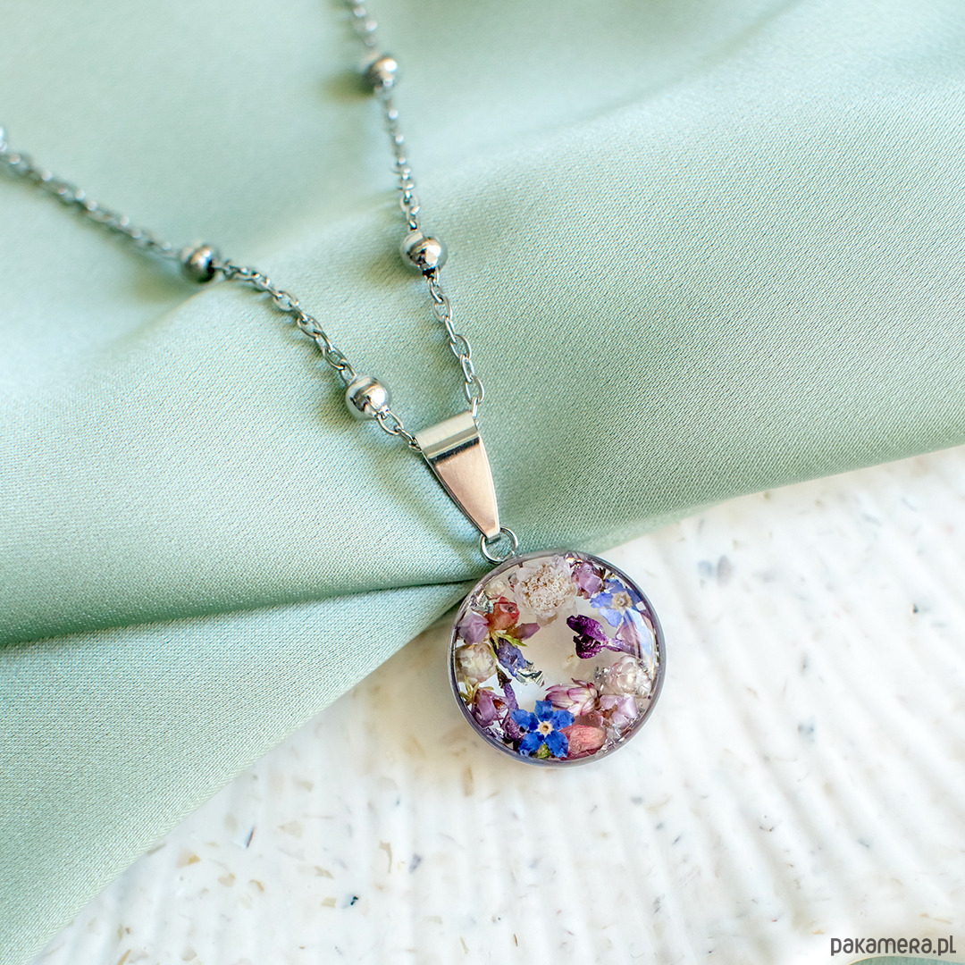 Wisiorek wykonany jest z żywicy epoksydowej z wykorzystaniem suszonych kwiatów. Metalowe elementy to stal nierdzewna szlachetna chirurgiczna.