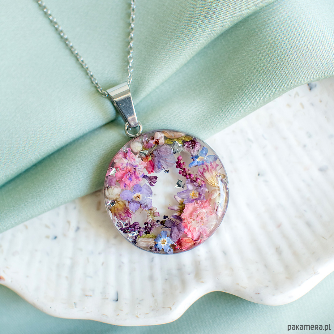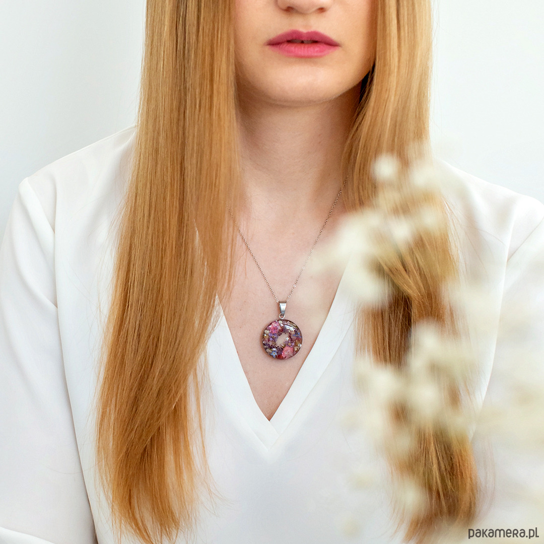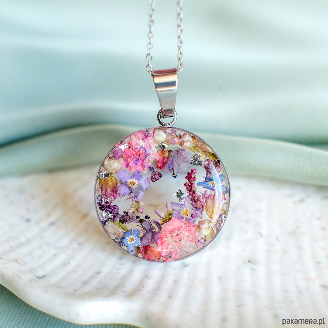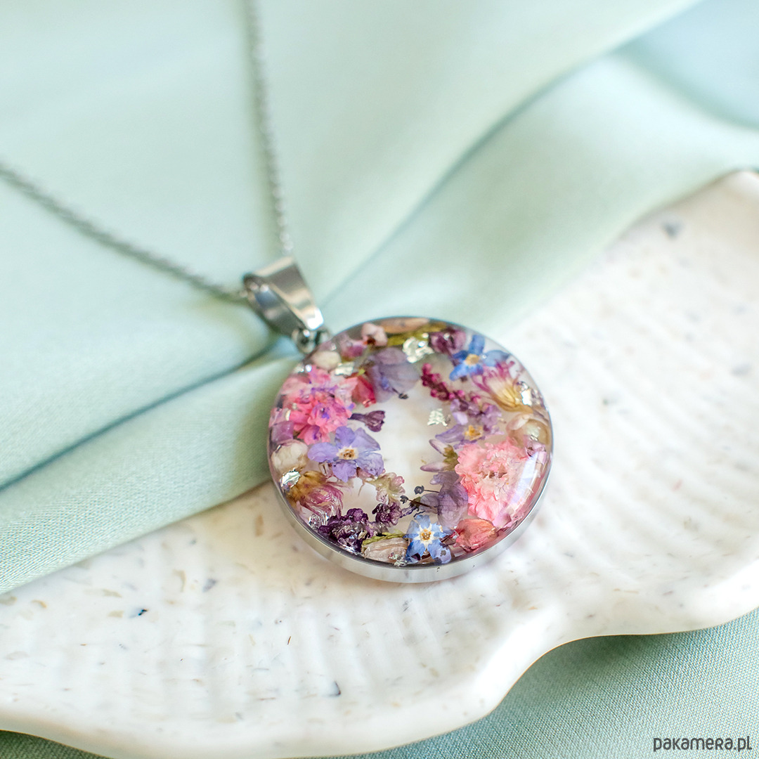Wisiorek wykonany jest z żywicy epoksydowej z wykorzystaniem suszonych kwiatów. Metalowe elementy to stal nierdzewna szlachetna chirurgiczna.