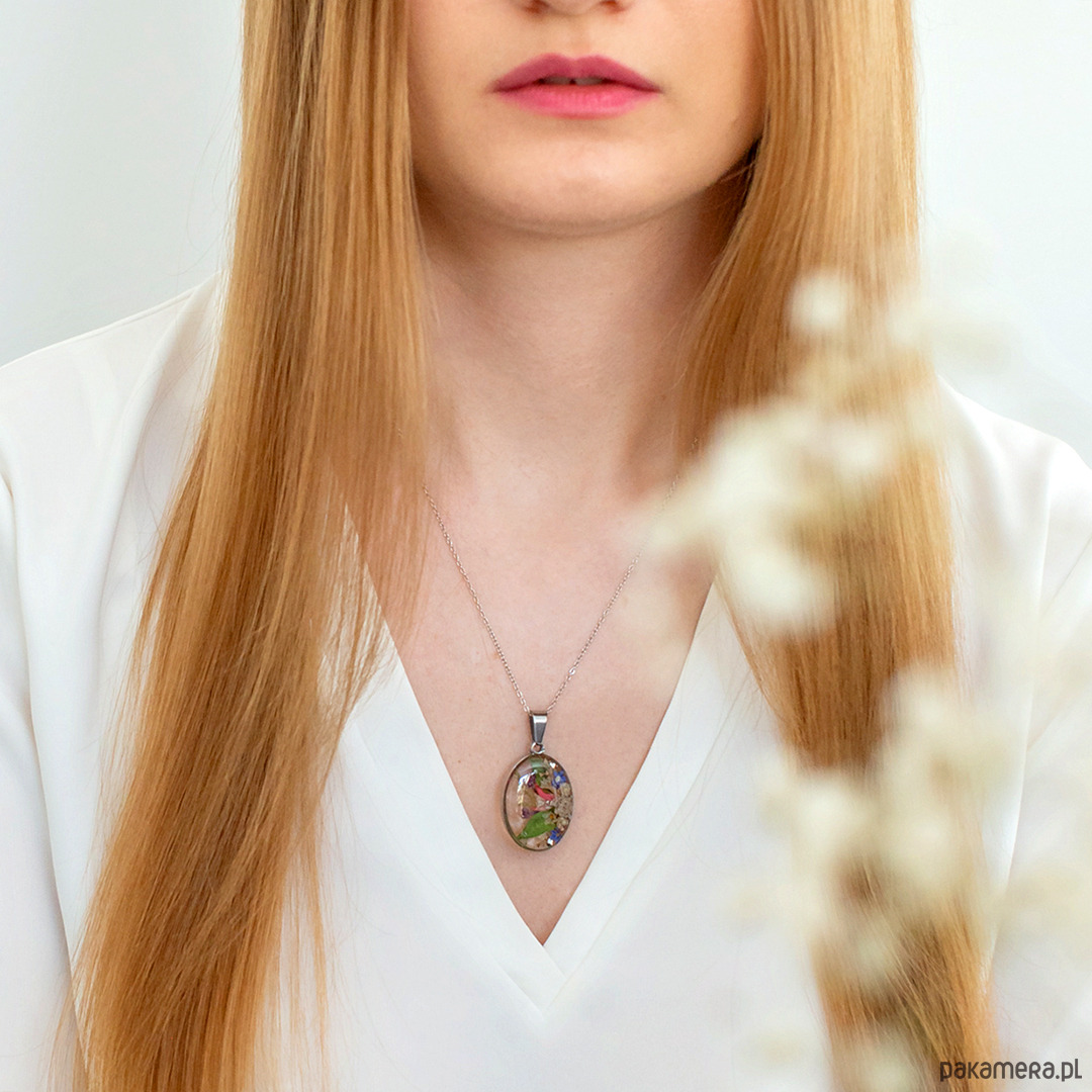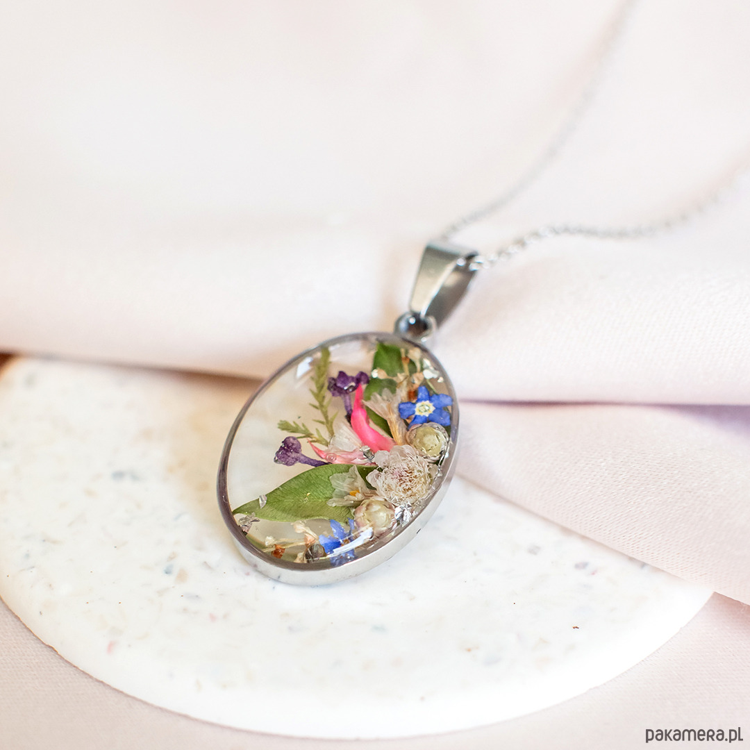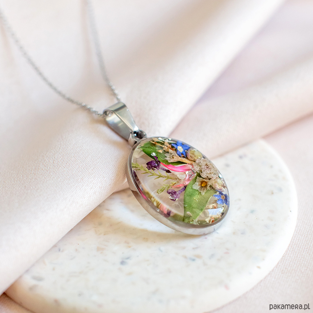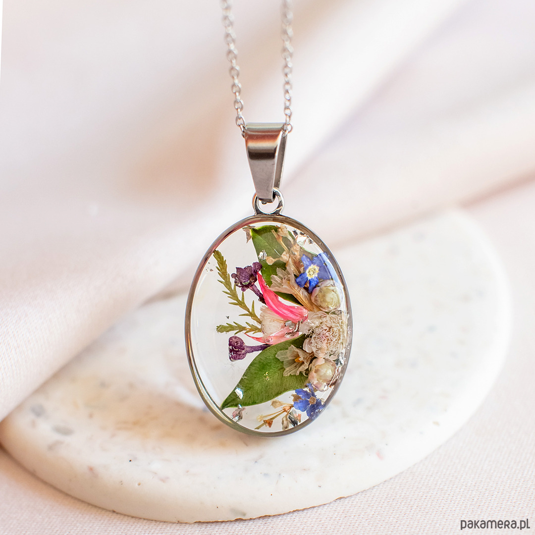 Wisiorek wykonany jest z żywicy epoksydowej z wykorzystaniem suszonych kwiatów. Metalowe elementy to stal nierdzewna szlachetna chirurgiczna.