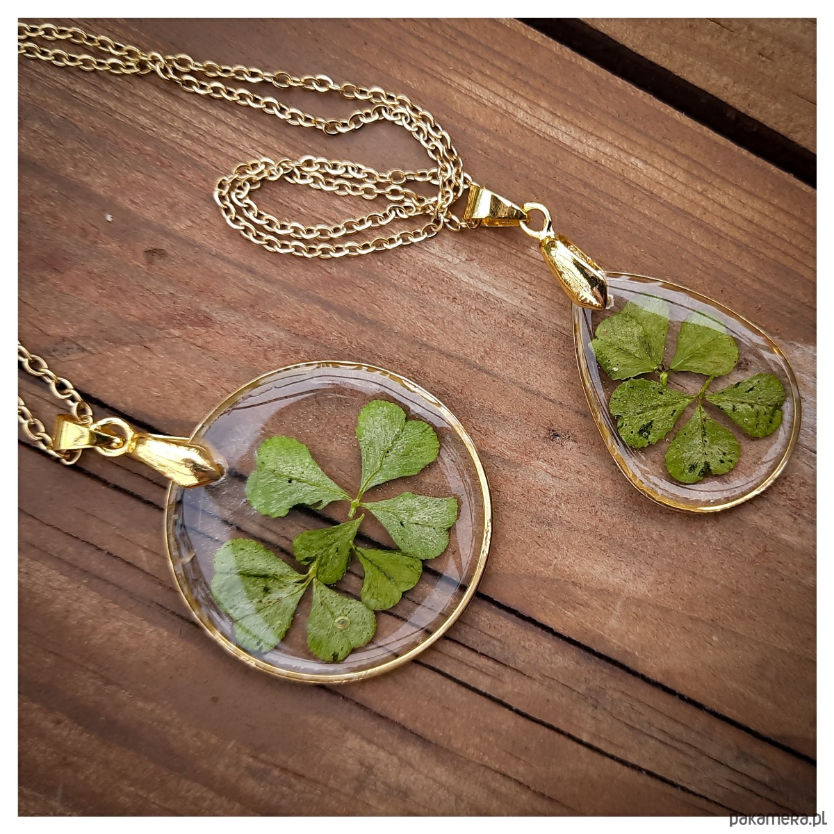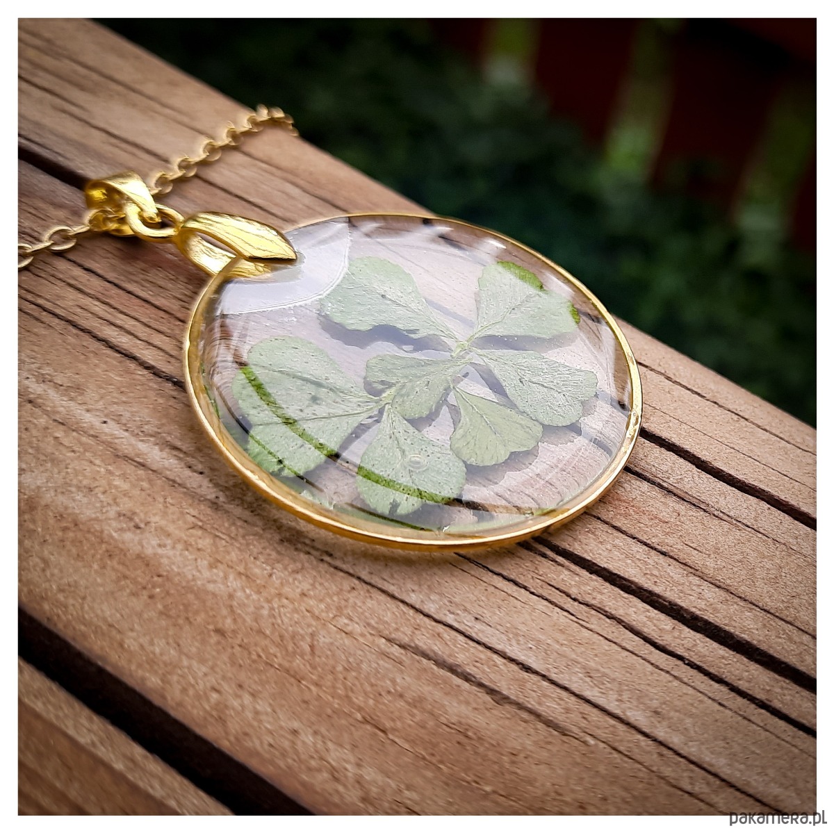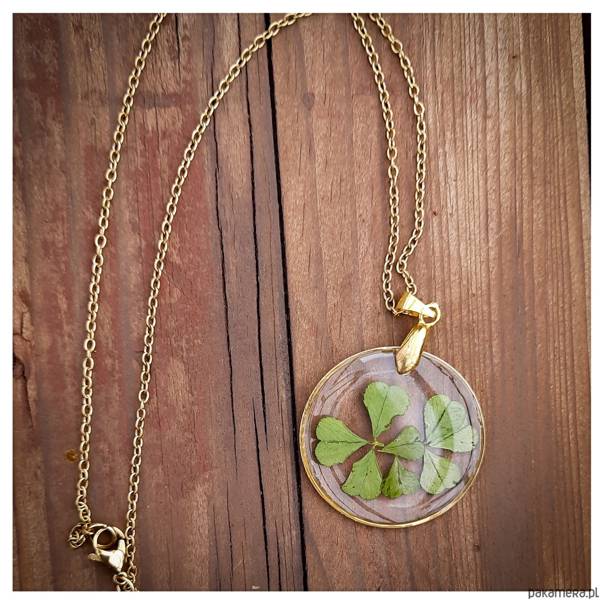 Zawieszka z zatopionymi w żywicy epoksydowej płatkami koniczynkami.