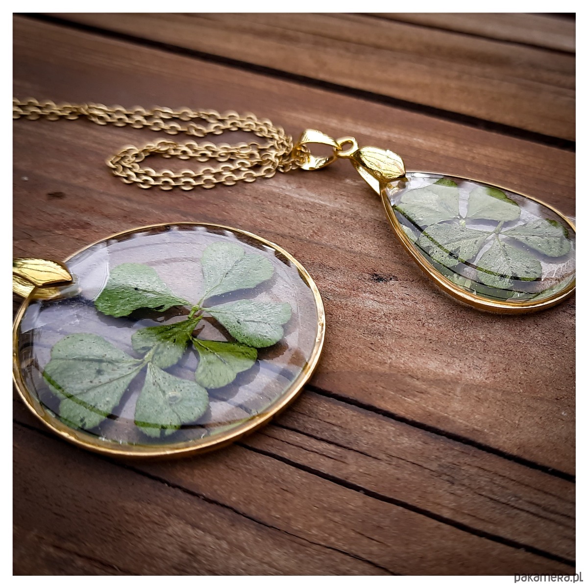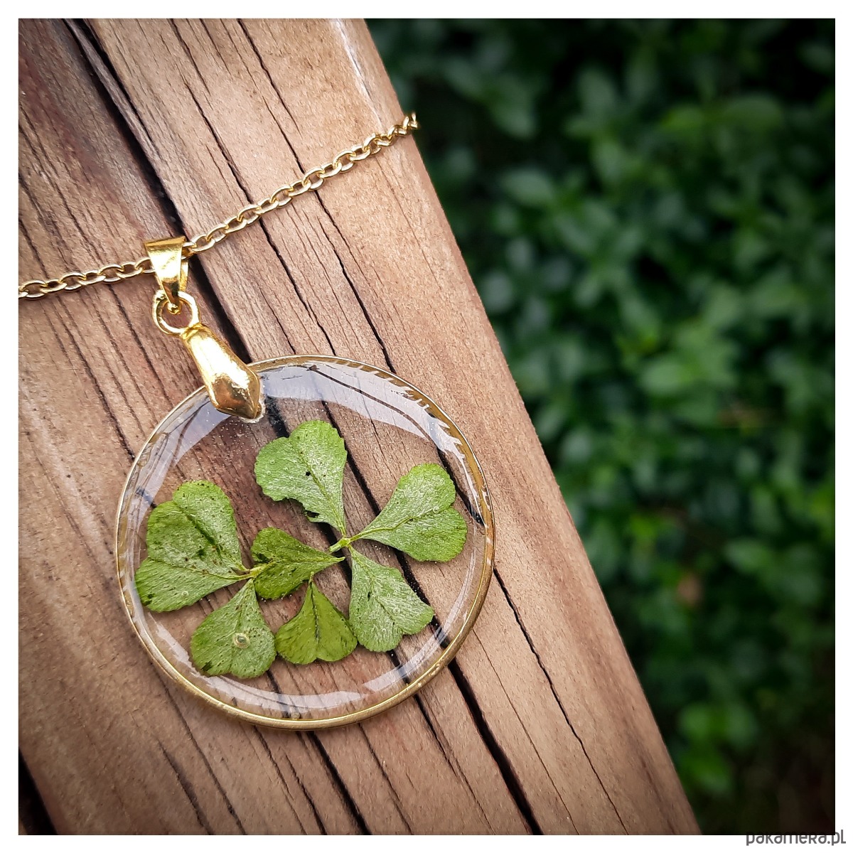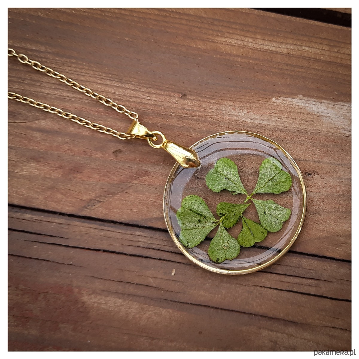 Zawieszka z zatopionymi w żywicy epoksydowej płatkami koniczynkami.