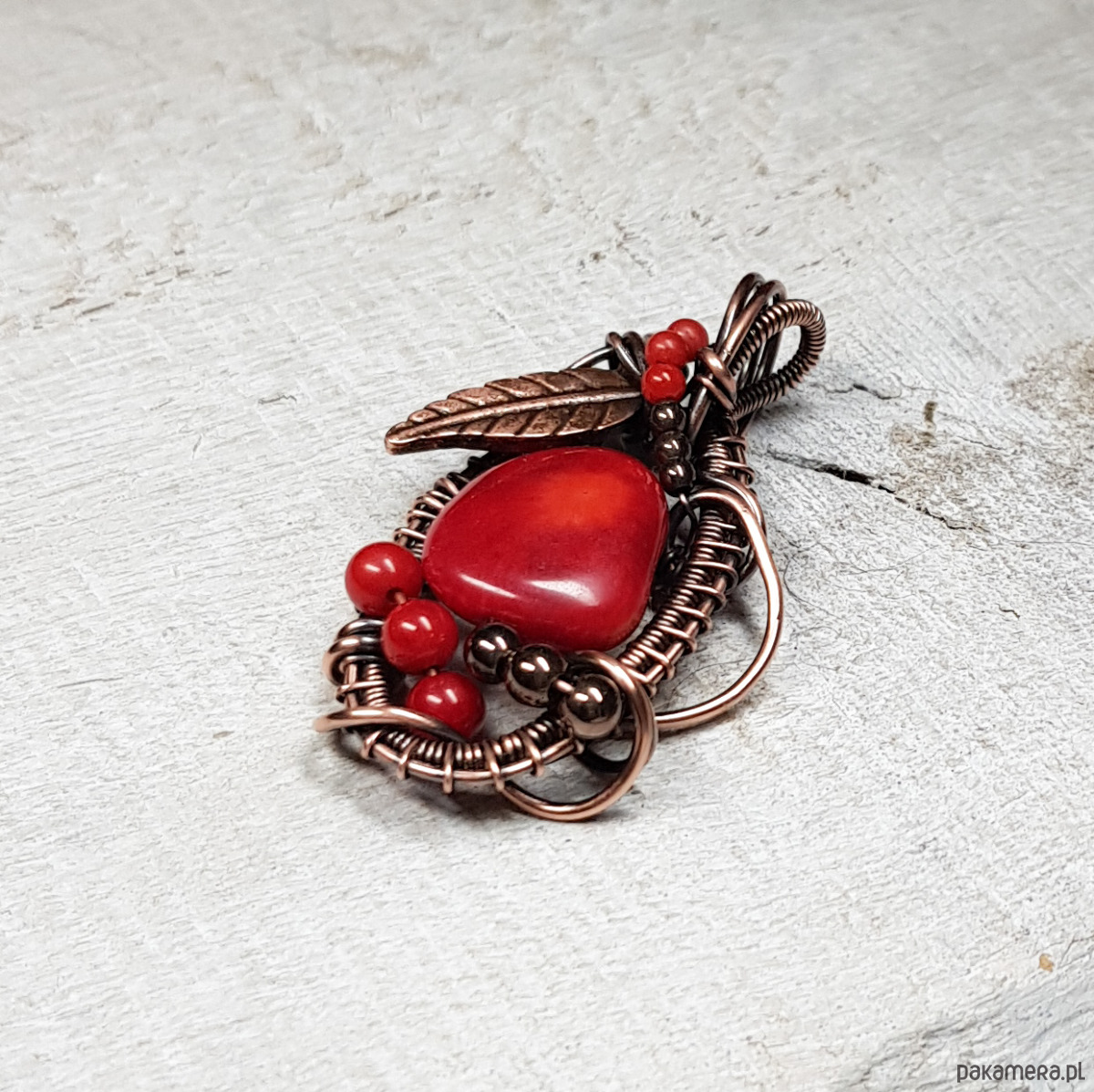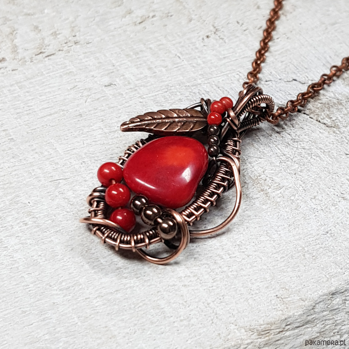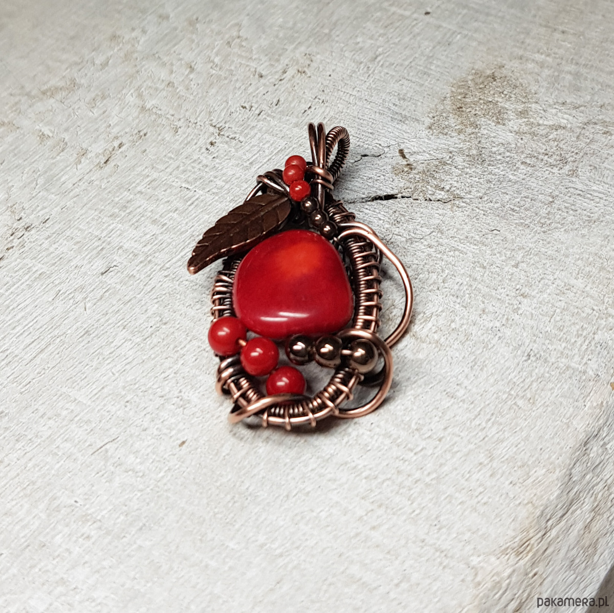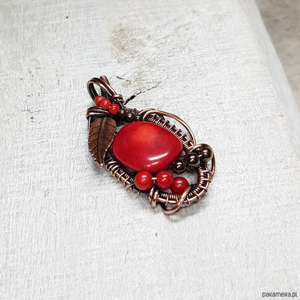 Zawieszka wykonana metodą wire-wrappingu w miedzi z naturalnego korala i koralików z korala. Wymiary wisiorka 40x22 mm, całość oksydowana i wypolerowana dla nadania szlachetnego wyglądu przyciemnienia. Do zawieszki dołączam łańcuszek długości 45-50 cm.